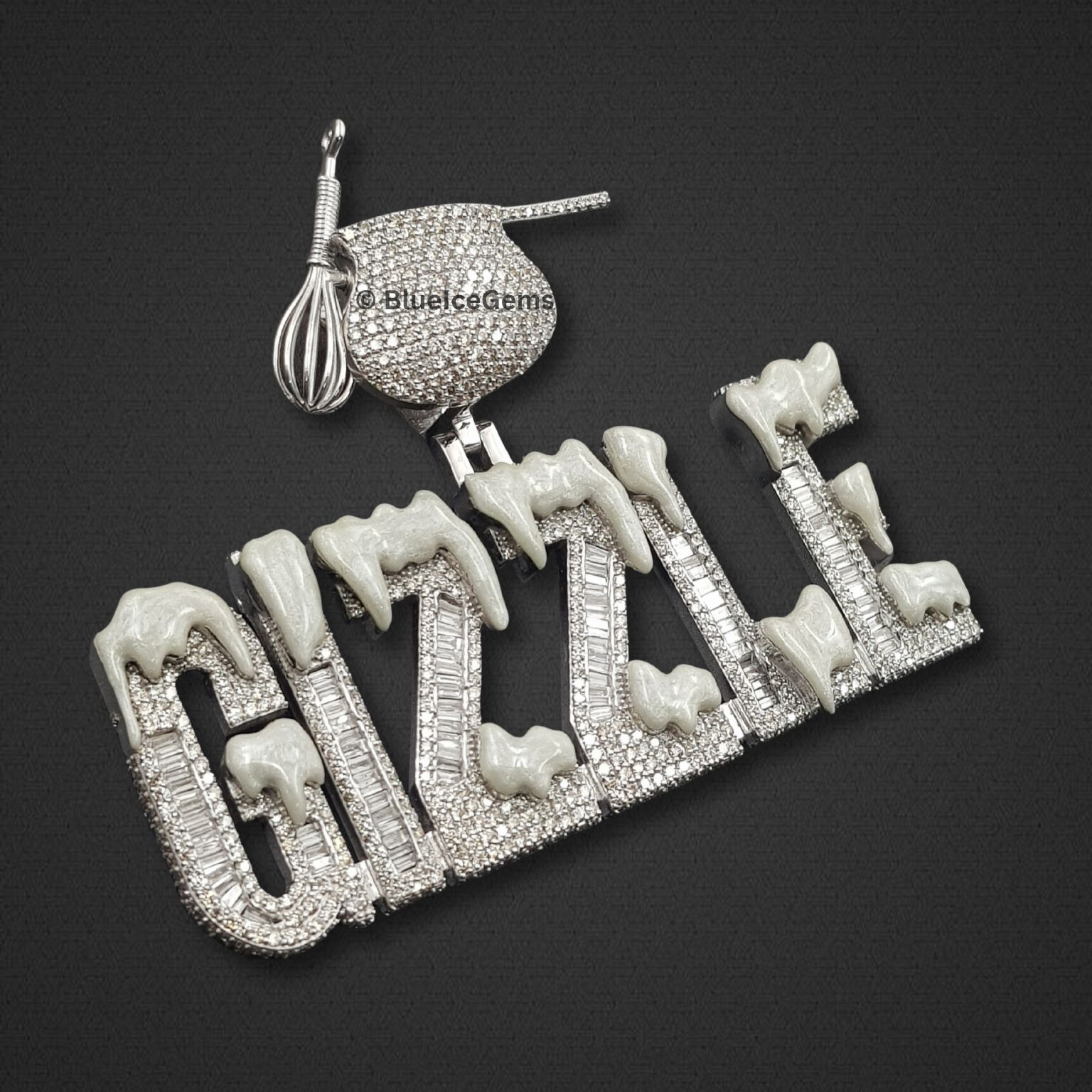 Make a bold statement with this custom GIZZLE pendant, fully iced and topped with a 3D pavé pot and whisk, featuring enamel drip accents for an original, flavorful touch of personality.