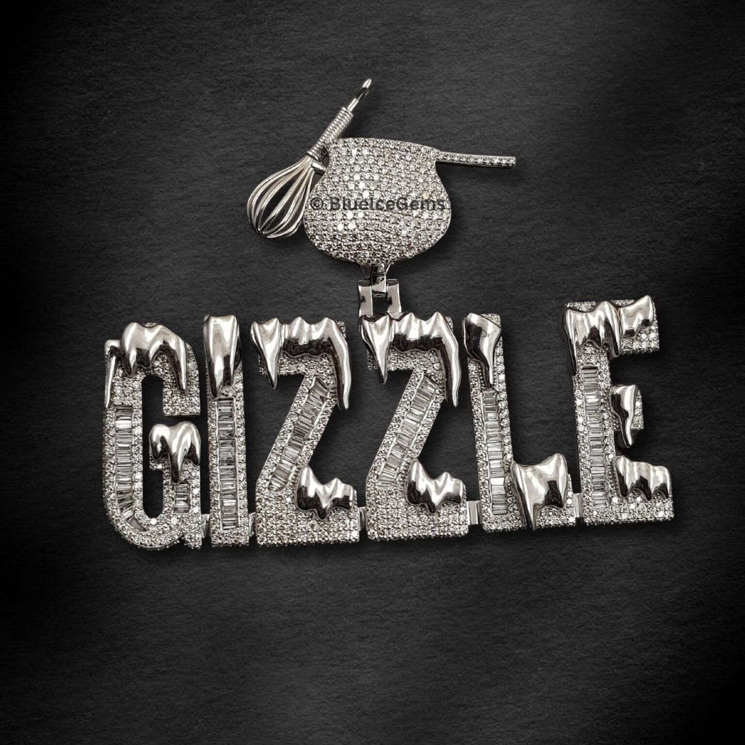 Bring the flavor with the “GIZZLE” Pendant—a recipe for bold style and unapologetic personality. This street-couture charm mixes gourmet grit with luxury shine, featuring sparkling baguette and round stones that layer like culinary precision. The custom grey enamel “drip” detail oozes edgy flair, channeling the heat of creativity and hustle. What truly sets this piece apart is its crowning glory: a 3D iced-out cooking pot and whisk, sculpted in brilliance and dripping swagger. It’s not just for chefs—it’s for creators who cook up magic in every arena, blending skill with confidence and soul. Whether you’re killing it in the kitchen or stirring up impact elsewhere, this pendant serves as a shimmering tribute to flavor, flair, and fire.
