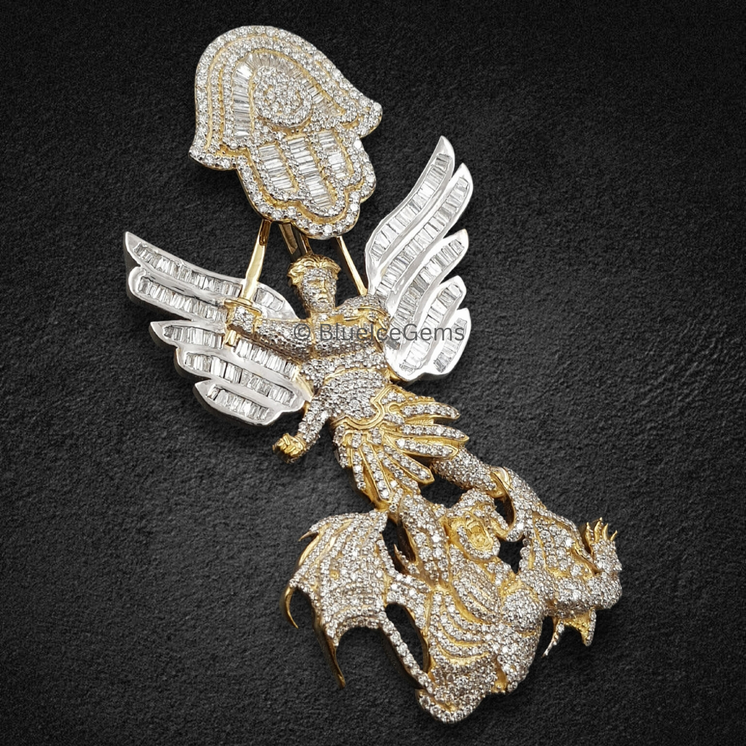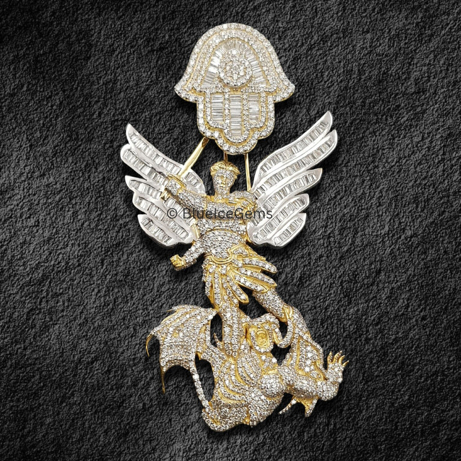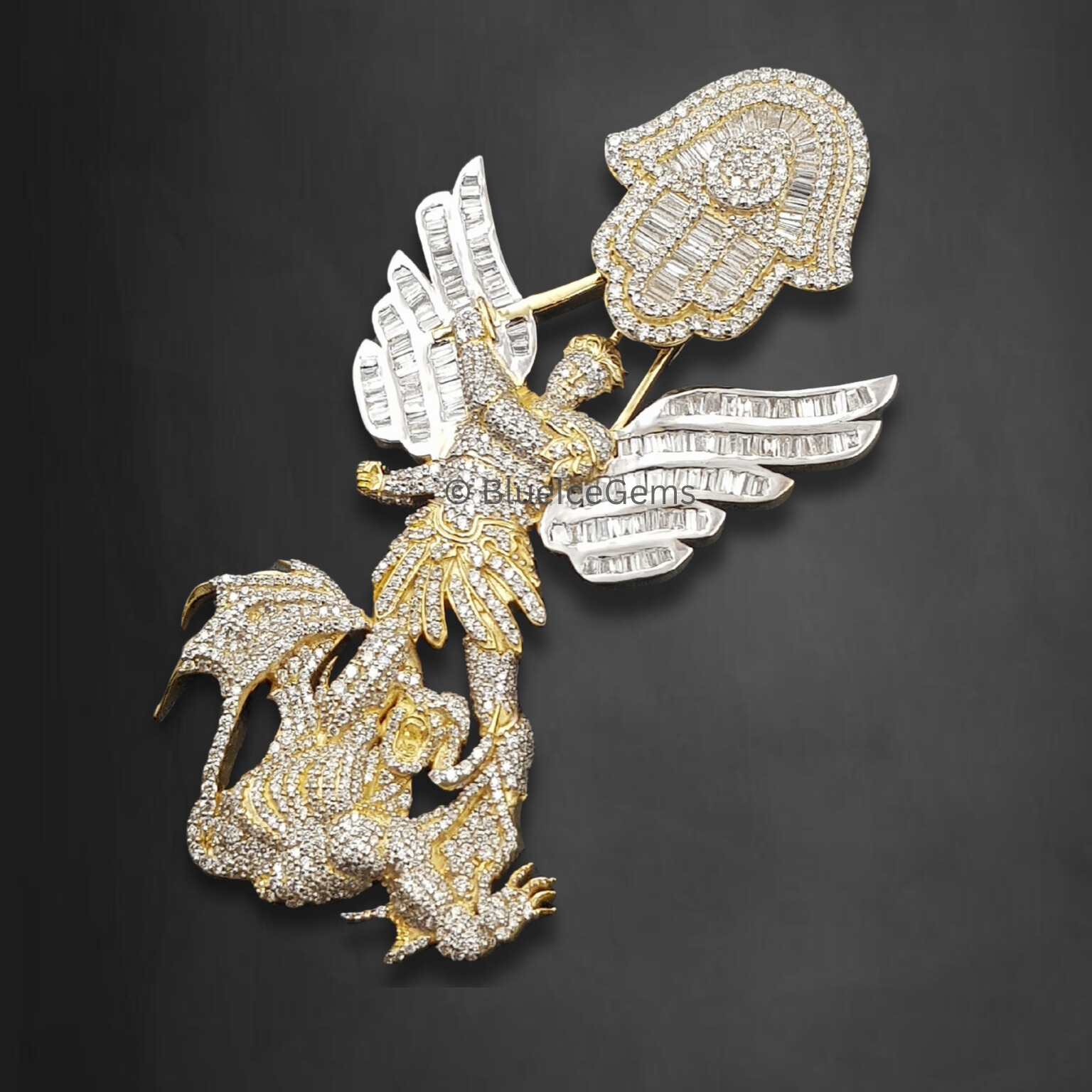This detailed pendant depicts an angelic warrior triumphing over a dragon, symbolizing courage and spiritual victory. The top showcases a radiant Hamsa hand, known for warding off negative energy and bringing blessings. Fully encrusted with shimmering stones, it offers a dazzling, luxurious finish. A perfect statement of faith, strength, and divine protection. Wear it with pride or gift it to inspire someone special. This piece radiates mythic strength and spiritual symbolism with every shimmering facet. The angelic warrior slaying the dragon channels themes of resilience, faith, and conquest over chaos—a visual metaphor that resonates across cultures and beliefs. Crowned by the Hamsa hand, it creates a divine duality: victory through courage and protection through grace.