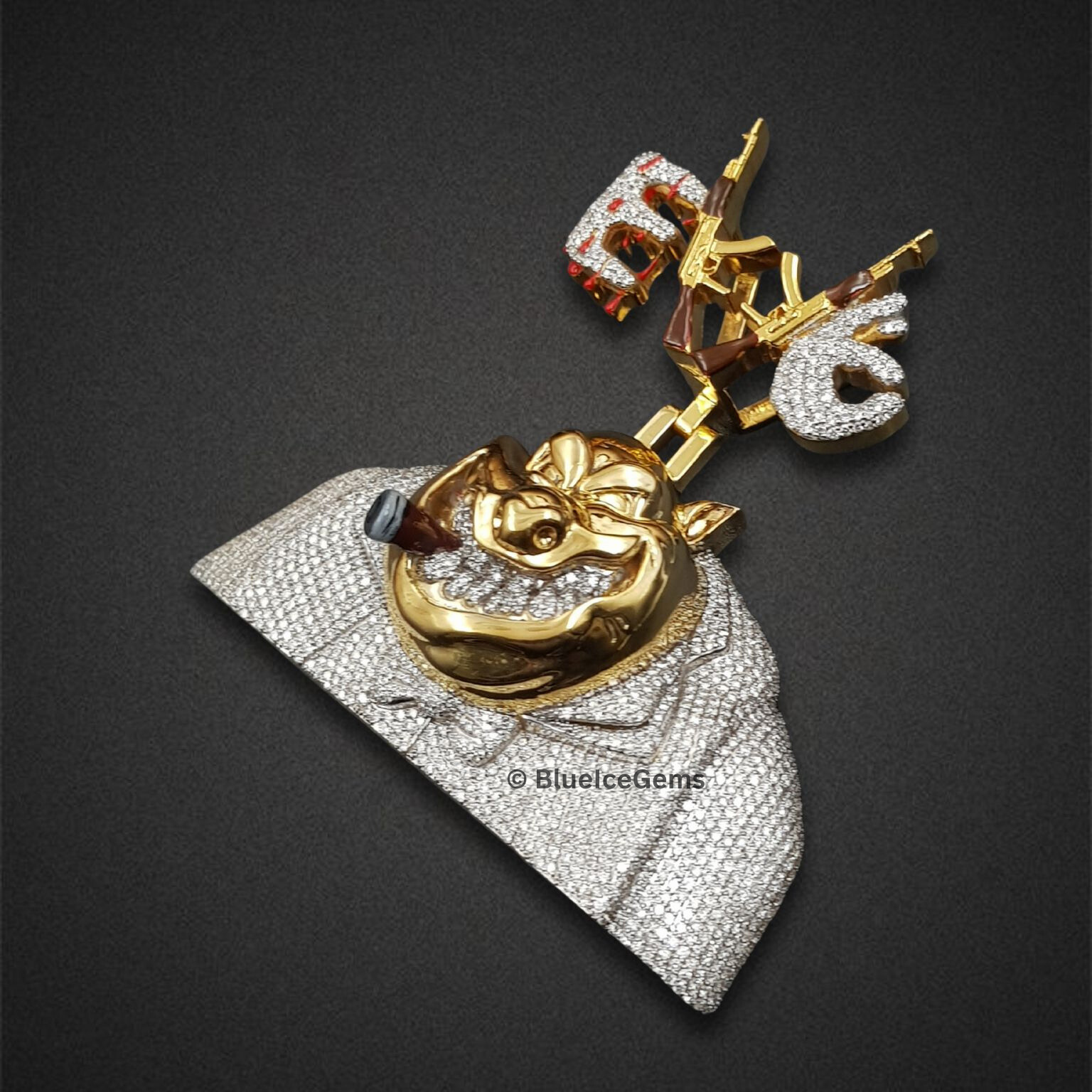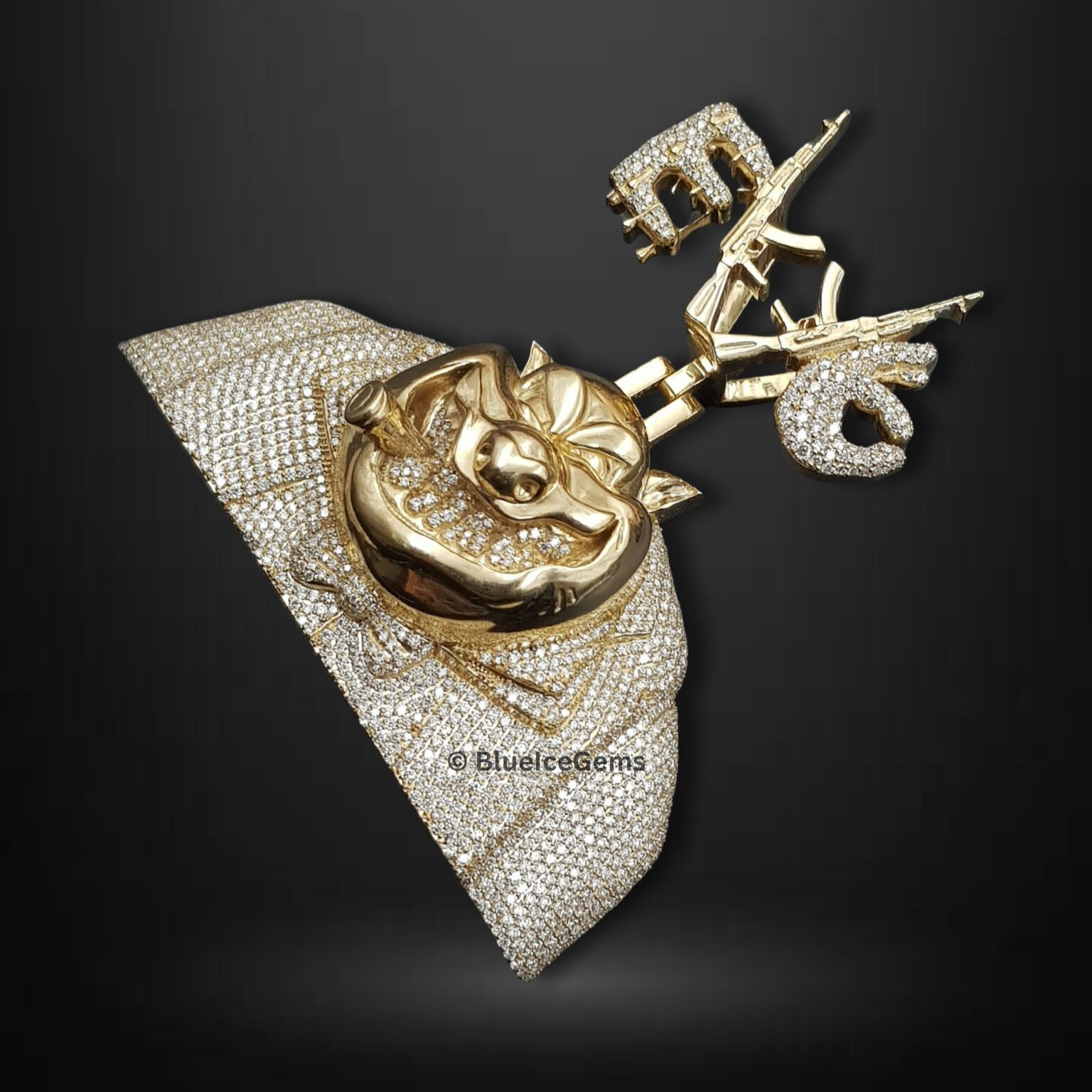The Life on Lock Pendant isn’t for the faint-hearted—it’s built for those who lead with defiance and live loud. Dripping in gold and flooded with brilliant stones, this unapologetic piece merges bold symbolism with elite craftsmanship. A gleaming gold-plated face mask anchors the design, representing raw identity and unbreakable spirit, while twin iced-out AKs spell out “LIFE” with commanding clarity—an untamed tribute to survival, power, and dominance. Every detail is deliberate, from the luminous finish to the heavy-hitting silhouette, ensuring the pendant doesn’t just accessorize—it electrifies. Whether you wear it for the statement, the story, or the swagger, this piece demands presence and respect. It’s not just jewelry—it’s armor for the brave, the relentless, and the iconic. Stay armored in luxury. Live bold. Keep your life on lock.