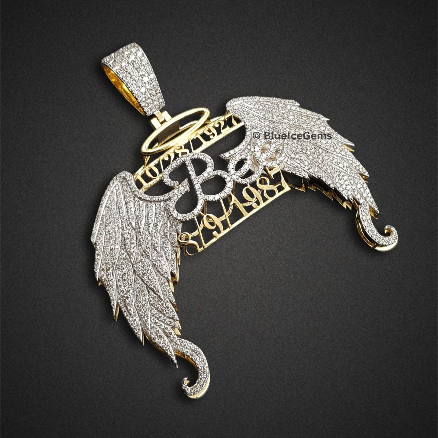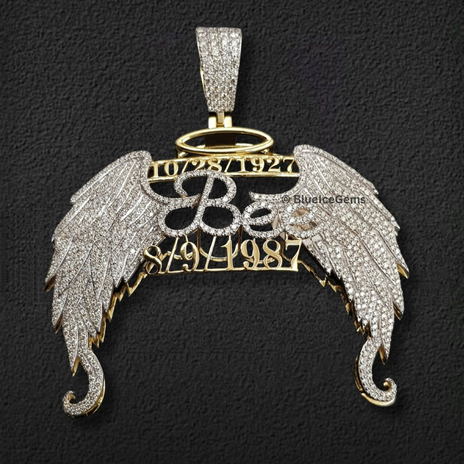 This beautifully crafted Bee memorial pendant features a fully iced-out angel wing design with elegant dates, a shimmering halo, and brilliant stones to honor a loved one with style and grace.