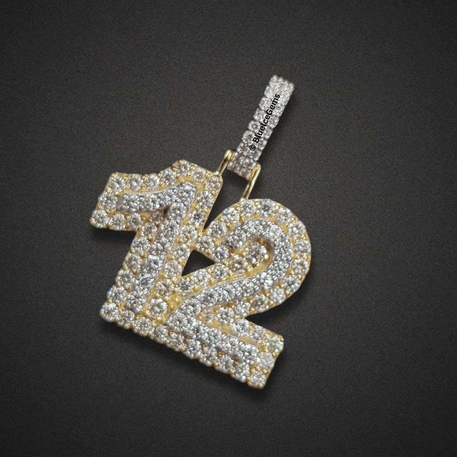 Celebrate a significant number, an iconic jersey, or a cherished milestone with The “12” Diamond Statement Number Pendant, a truly powerful and dazzling piece designed to impress. This formidable custom pendant features the bold numbers “1” and “2,” meticulously crafted in a prominent, three-dimensional form. Each digit is lavishly adorned with an astonishing array of brilliant pave-set white diamonds, creating an uninterrupted surface of pure fire and scintillation that captures and reflects light with unparalleled brilliance from every conceivable angle. The contours of the numbers are robustly outlined and backed by gleaming yellow gold, providing a stunning contrast that enhances the depth and grandeur of the design. The integrated, diamond-studded bail, also in coordinating yellow gold, ensures a secure and prominent display on your chosen chain. This “12” pendant is more than just jewelry; it’s a powerful emblem of personal achievement, aspiration, or passion, meticulously designed for those who demand attention and appreciate the pinnacle of custom diamond artistry.