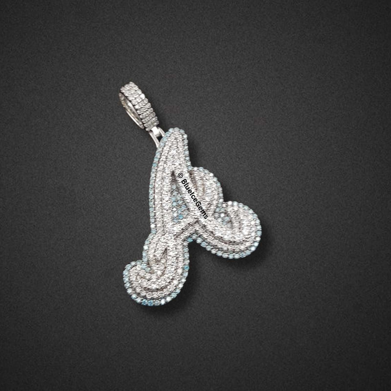 Make a distinctive and dazzling personal statement with The “A” Azure Diamond Script Pendant, a truly captivating piece that masterfully blends personalized style with radiant luxury. This impressive custom pendant features a bold and flowing capital “A” initial, meticulously crafted and lavishly adorned with an astonishing array of brilliant pave-set diamonds. A mesmerizing touch of light blue diamonds (or blue topaz accents) is subtly integrated into its curves, adding a unique pop of color and enhancing its ethereal sparkle, creating an uninterrupted surface of pure fire and scintillation that captures and reflects light from every conceivable angle. Crafted entirely in gleaming white gold, the seamless setting allows the diamonds to truly take center stage, creating an illusion of pure, floating ice. The integrated, diamond-studded bail ensures a secure and prominent display on your chosen chain. This pendant is more than just jewelry; it’s a powerful emblem of identity, aspiration, and uncompromised luxury, meticulously designed for those who demand attention and appreciate the pinnacle of custom diamond artistry.