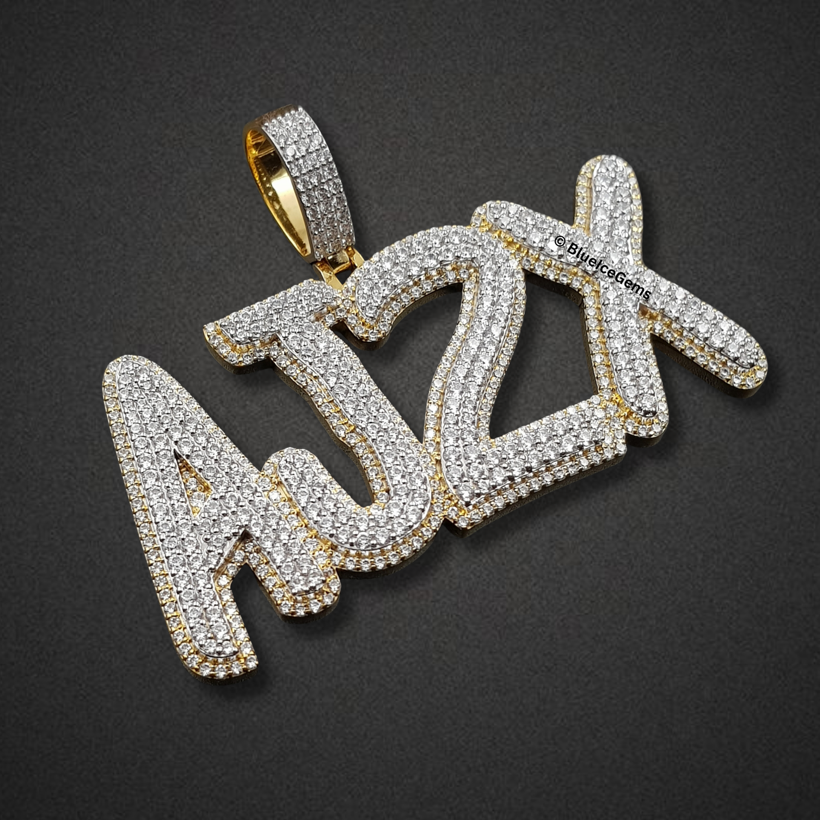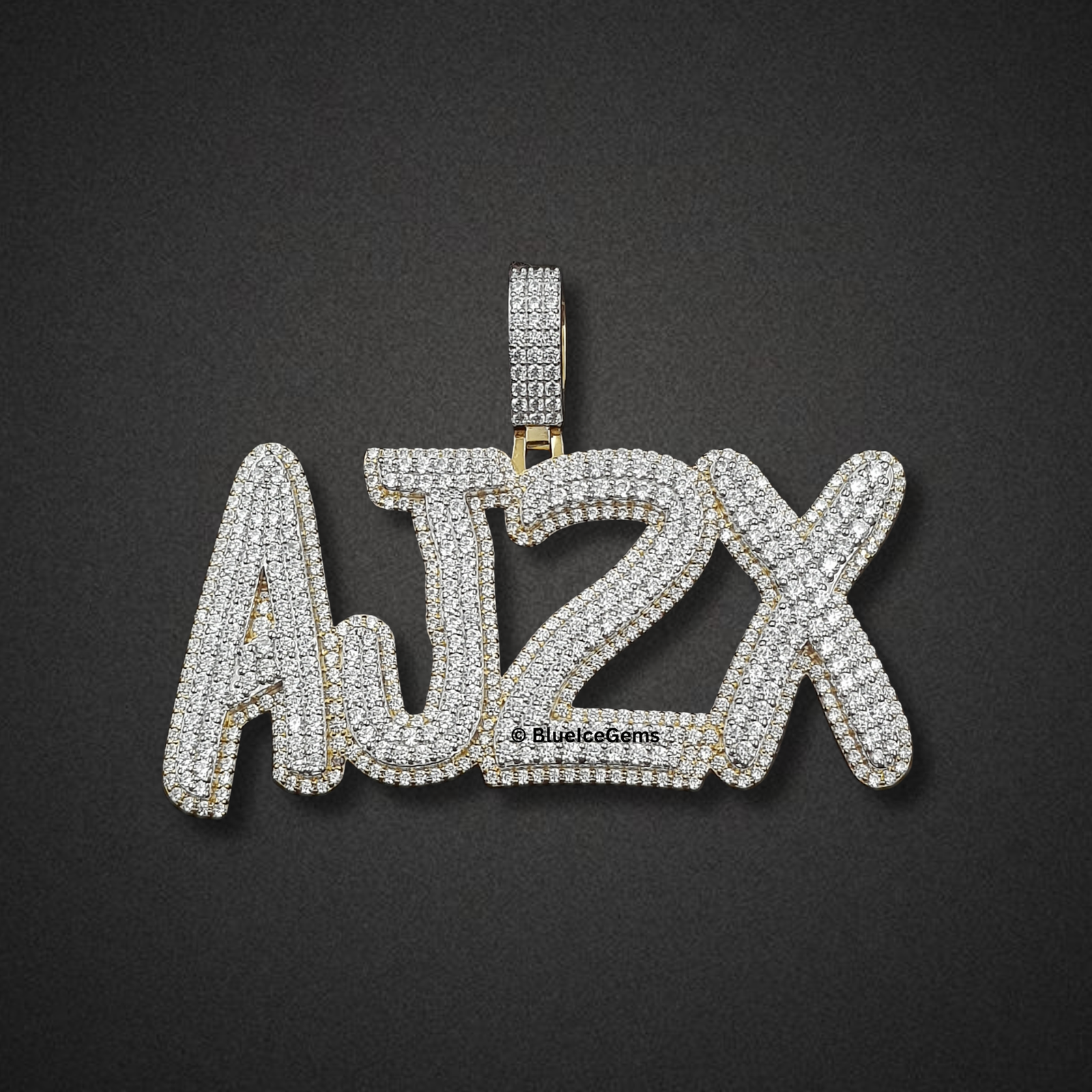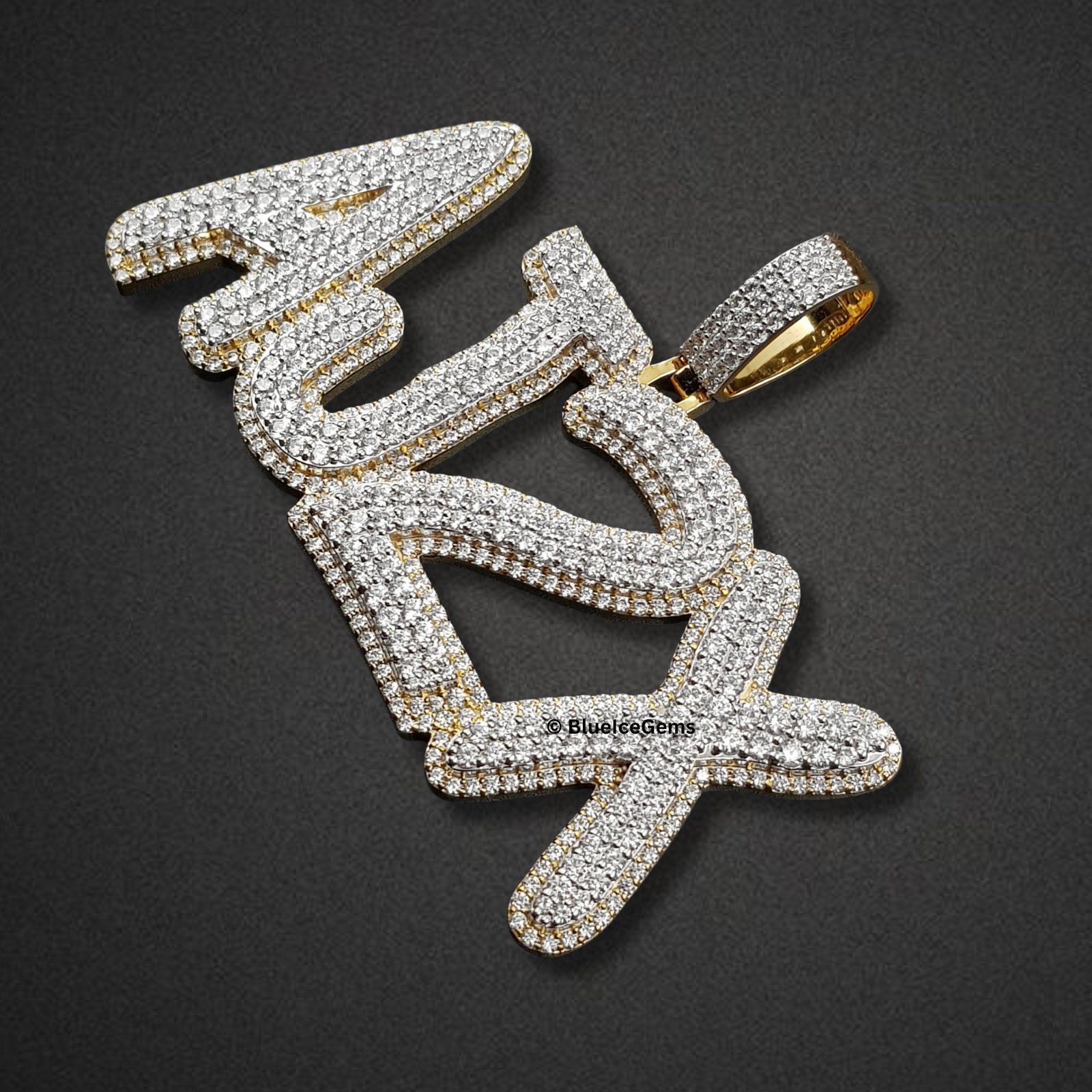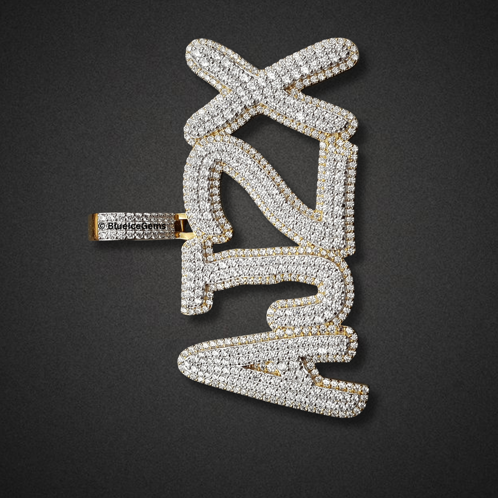 Command attention and make a truly unforgettable statement with this bold “AJ2X” pendant, an extraordinary creation exclusively from BlueIceGems. This magnificent piece is meticulously pave-set with an abundance of dazzling, brilliant white diamonds, each one expertly placed to create an unbroken, shimmering surface of pure fire and unparalleled scintillation that radiates captivating light from every angle. Its robust, substantial three-dimensional form offers a powerful and commanding presence around your neck, making a striking visual impact. The pendant’s impressive silhouette is further enhanced by a sophisticated outlining and solid backing of rich, warm yellow gold, lending a magnificent contrast that dramatically enhances its opulent and undeniably luxurious style. This isn’t just jewelry; it proudly exudes uncompromised luxury and an audacious personal style, making it a powerful emblem for the discerning individual.
