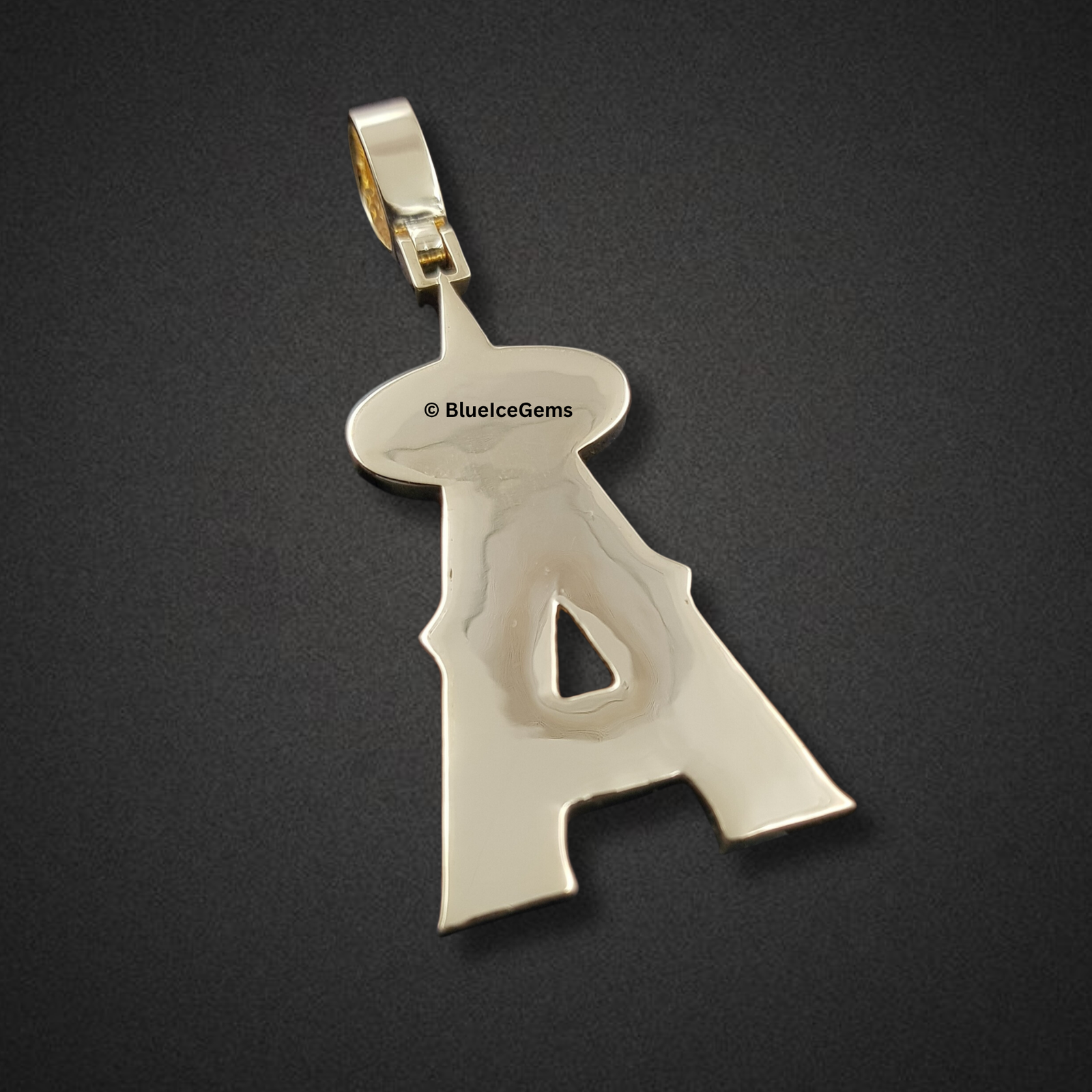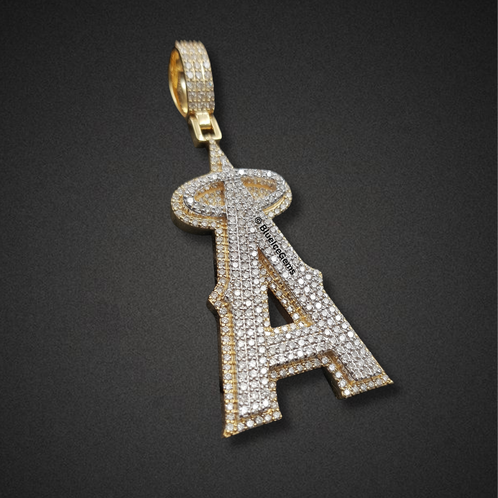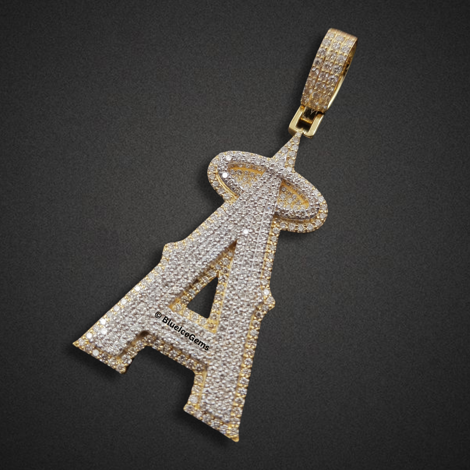 Command attention and elevate your personal style with The “Angel A” Diamond Statement Pendant, a truly monumental piece designed to dazzle from every angle. This impressive custom pendant features a bold and stylized capital “A” initial, meticulously crafted and lavishly adorned with an astonishing array of brilliant pave-set diamonds. Each diamond contributes to an uninterrupted surface of pure fire and scintillation, ensuring unparalleled brilliance. The robust, three-dimensional form of the letter is elegantly outlined and backed by gleaming yellow gold, providing a rich, warm contrast that enhances the depth and luxurious appeal of the design. Uniquely crowning this magnificent “A” is a diamond-studded halo, symbolizing divine protection, grace, or perhaps a nod to a beloved sports team. The integrated, diamond-studded bail, also in coordinating yellow gold, ensures a secure and prominent display on your chosen chain. This pendant is more than just jewelry; it’s a powerful emblem of identity, aspiration, and uncompromised luxury, meticulously designed for those who demand attention and appreciate the pinnacle of custom diamond artistry..H 2 inch (without bail) * width 1.25 ich (it’s depend on letters)