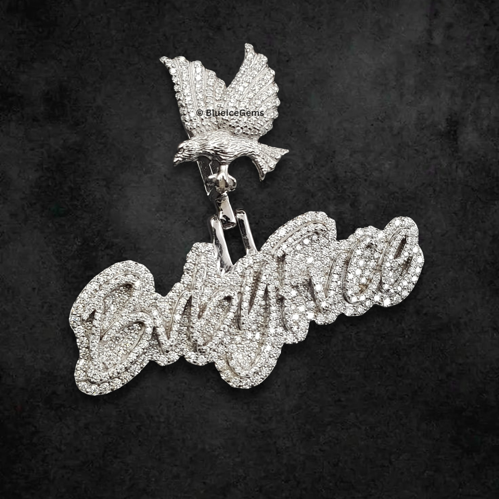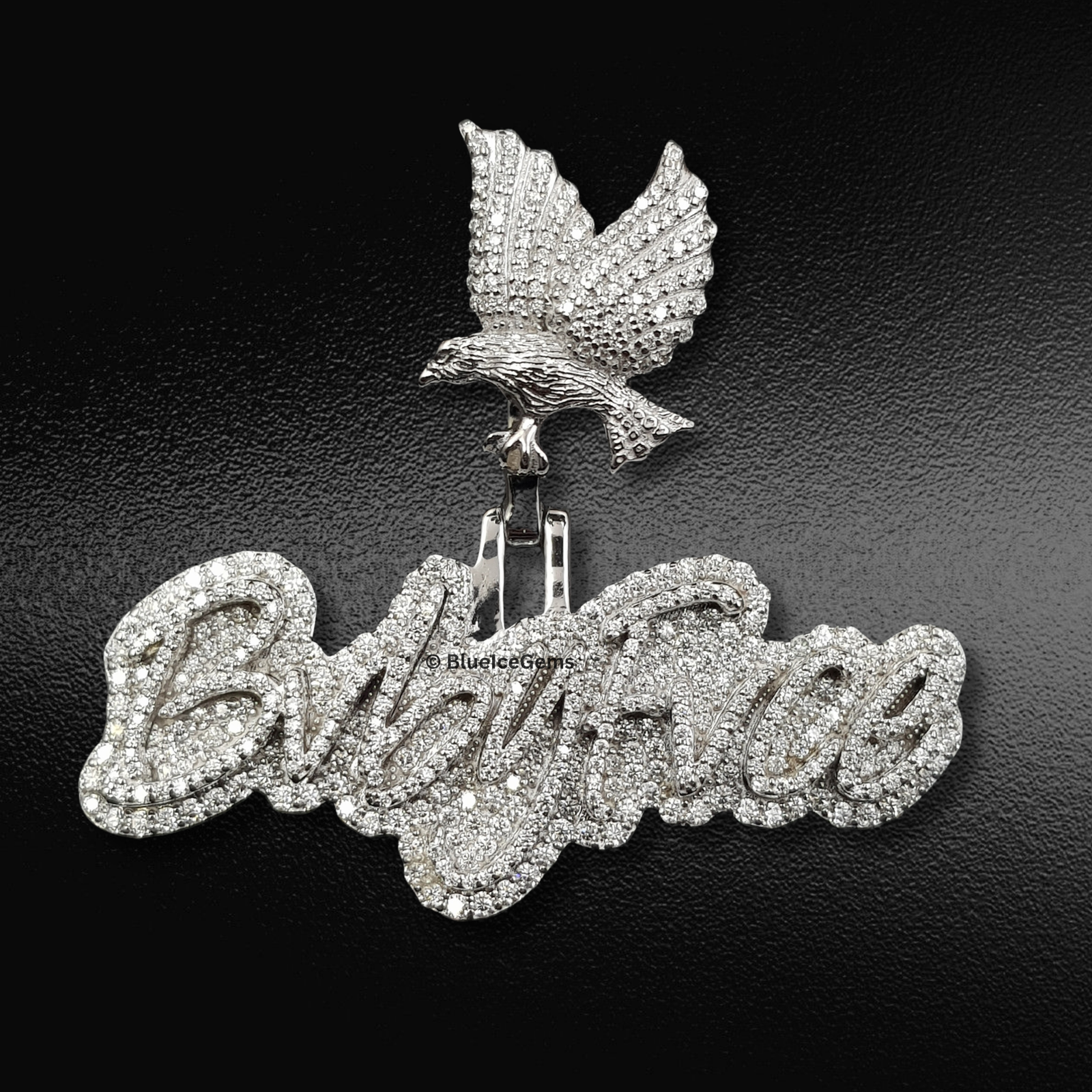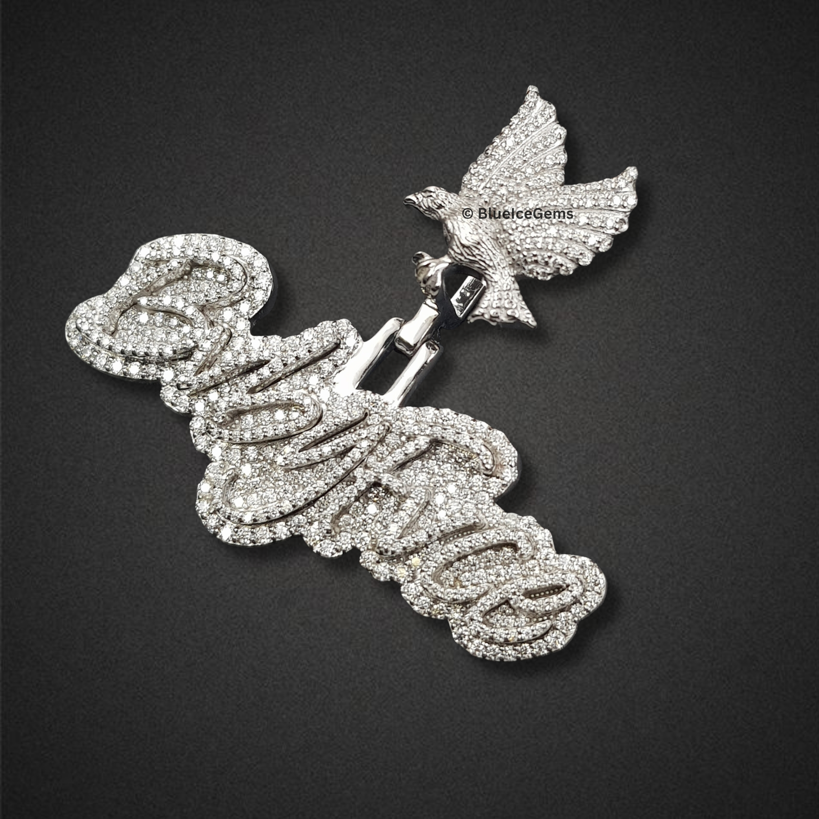 Soar with style and personal expression with The “Baby Face” Diamond Dove Pendant, a truly captivating and symbolic piece that seamlessly blends bold design with breathtaking brilliance. This impressive custom pendant elegantly spells out “Baby Face” in a dynamic, three-dimensional script, giving it remarkable depth and presence. Every contour and curve of the name is meticulously pave-set with an astonishing array of brilliant-cut white diamonds, creating an unbroken surface of pure fire and unparalleled scintillation. Each diamond is expertly positioned to capture and reflect light from every angle, ensuring a continuous, dazzling display of radiant sparkle.