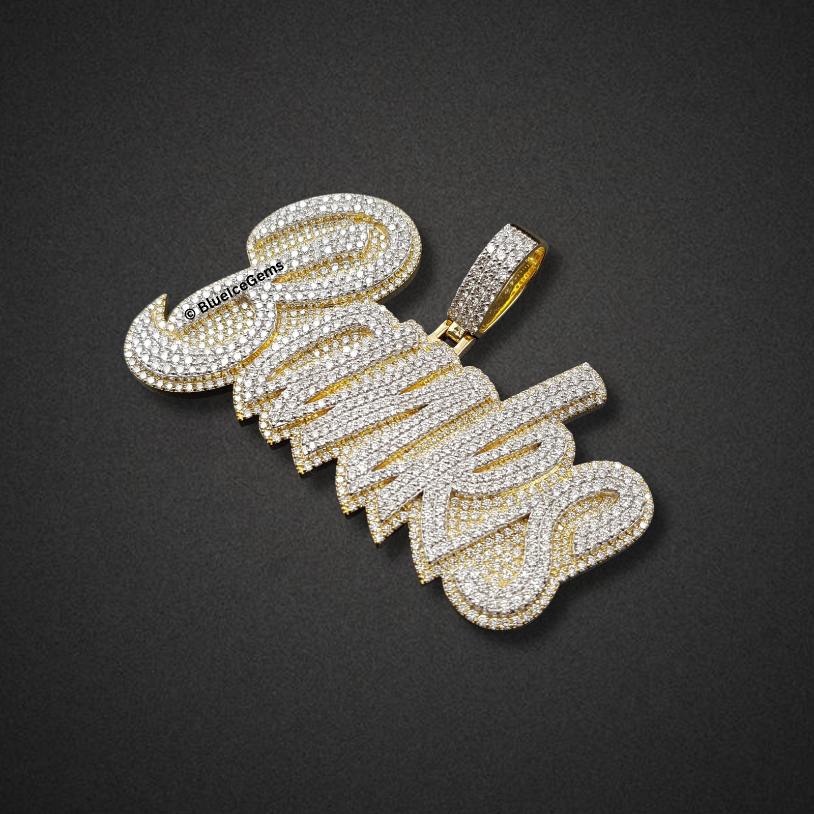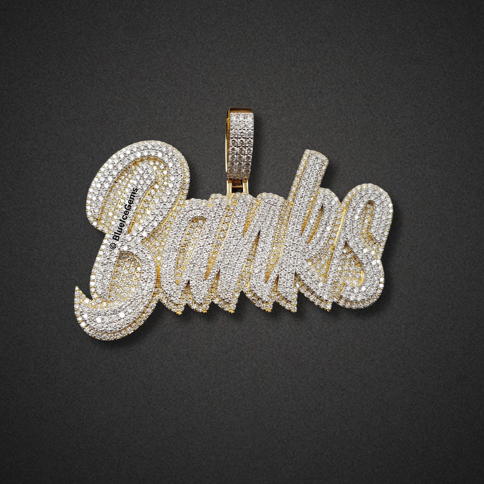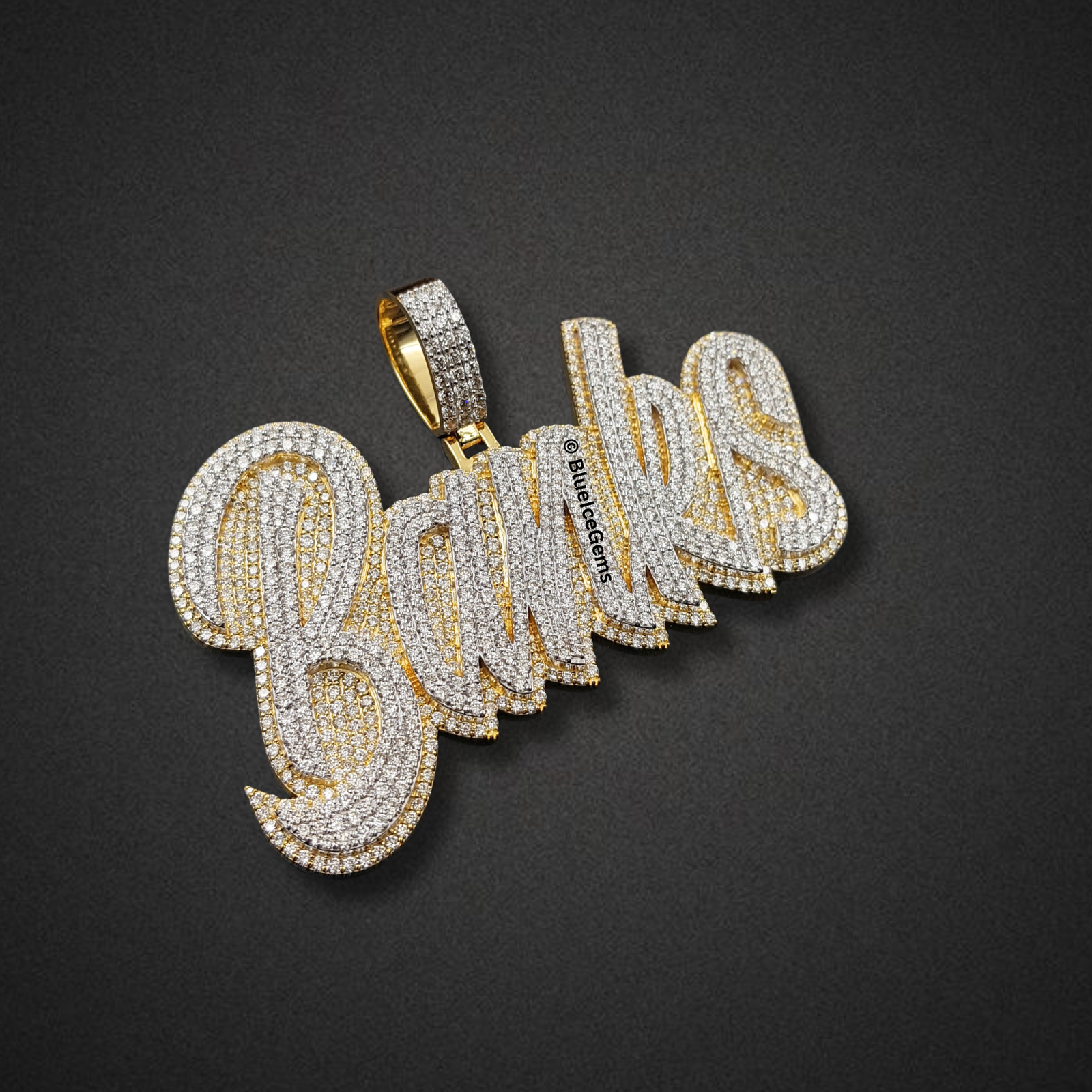 Celebrate a personal name or brand with The “Banks” Diamond Signature Script Pendant, a truly captivating and brilliantly crafted piece designed to exude unparalleled luxury. This impressive custom pendant elegantly spells out “Banks” in a dynamic, three-dimensional script, with every contour meticulously pave-set with an astonishing array of brilliant white diamonds. The sheer density of these diamonds creates an unbroken surface of pure fire and scintillation, ensuring it catches and reflects light with unparalleled brilliance from every conceivable angle. The robust form of the letters is elegantly outlined and backed by gleaming yellow gold, providing a rich, warm contrast that enhances the depth and luxurious appeal of the design. The integrated, diamond-studded bail, also in coordinating yellow gold, ensures a secure and prominent display on your chosen chain. This pendant is more than just jewelry; it’s a powerful emblem of identity, aspiration, and uncompromised luxury, meticulously designed for those who demand attention and appreciate the pinnacle of custom diamond artistry.