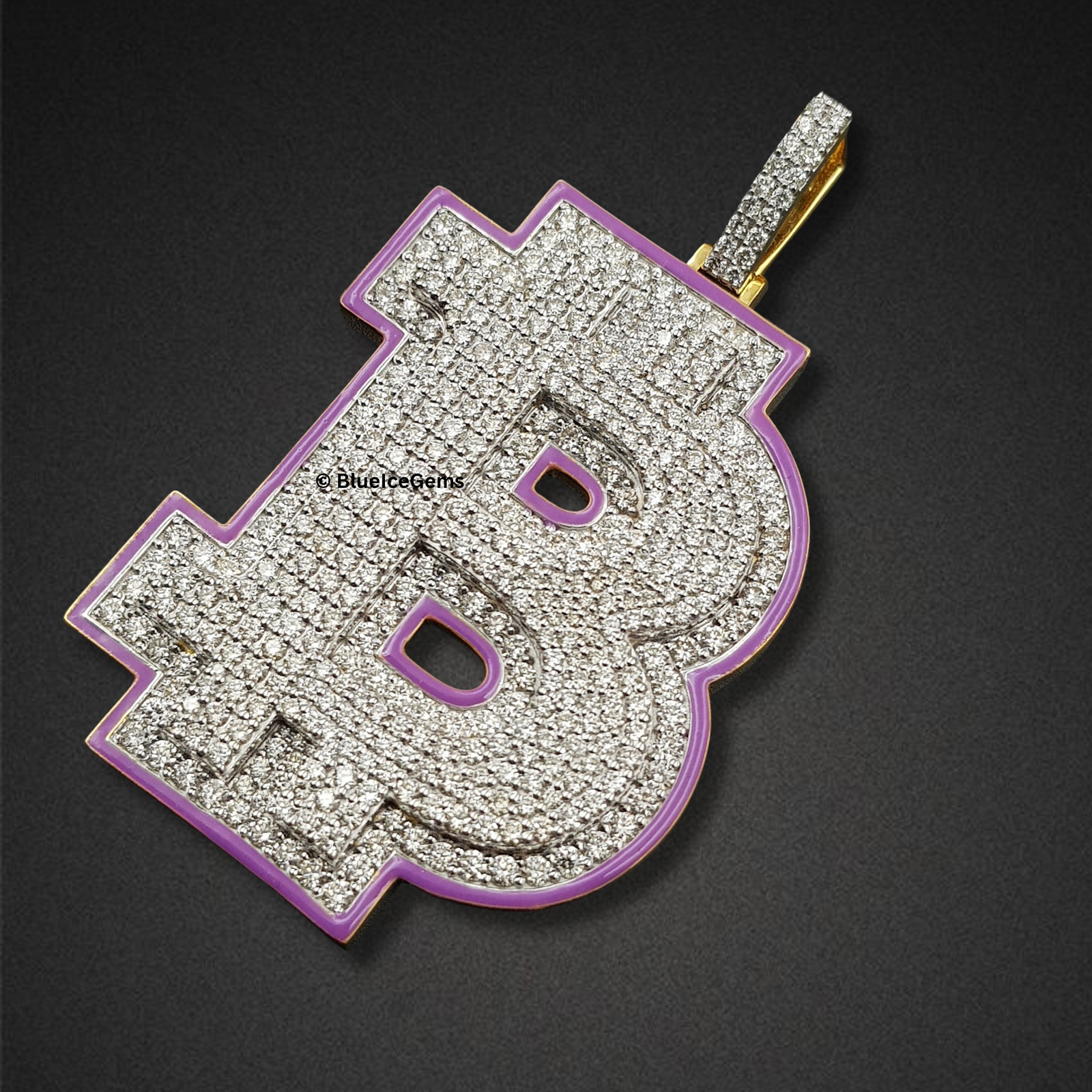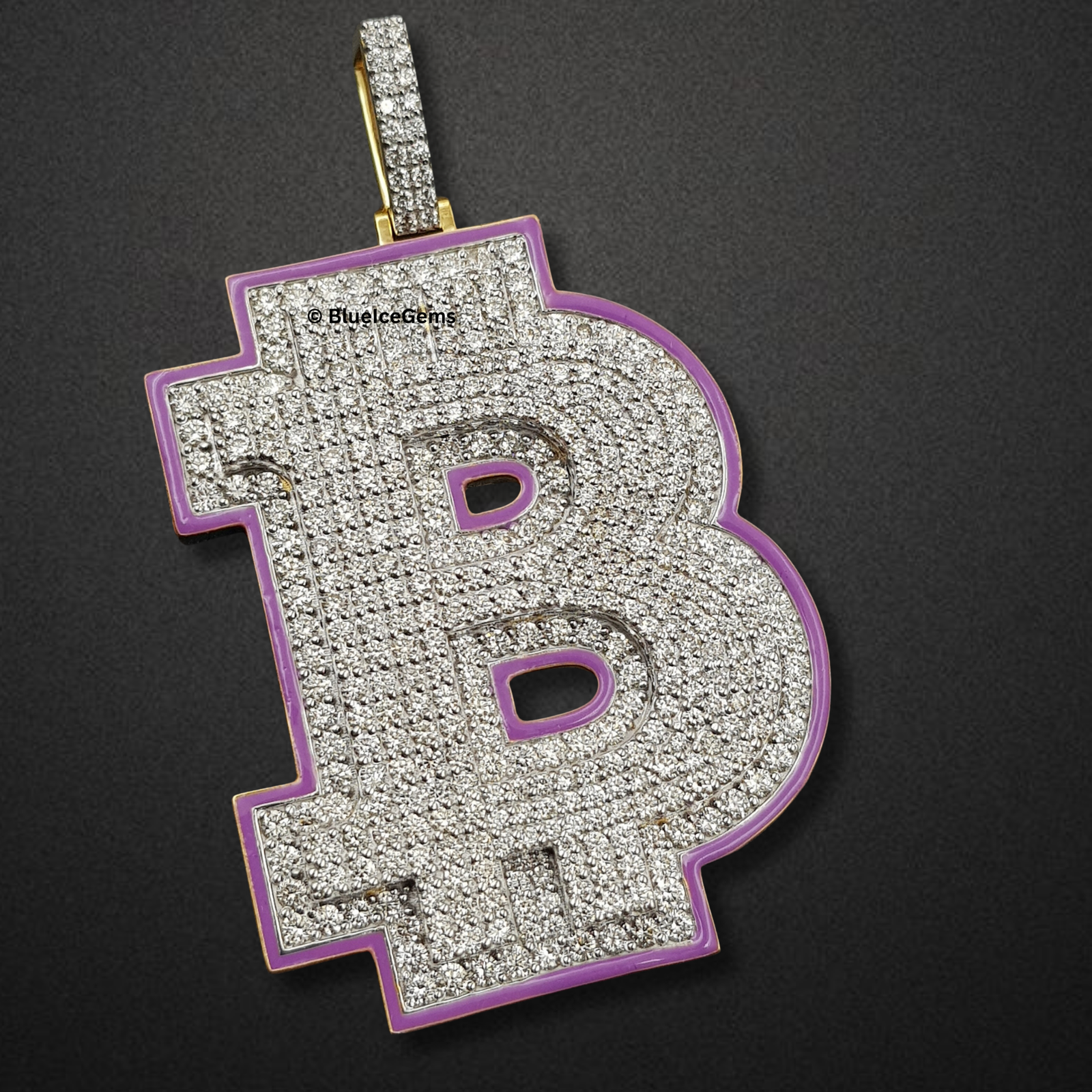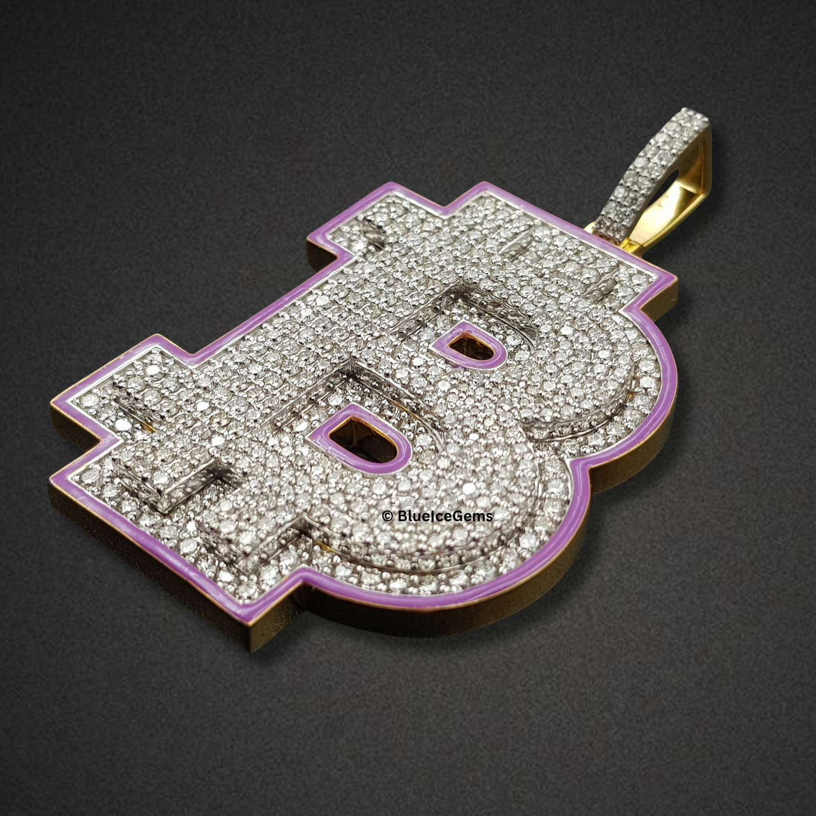 Declare your crypto wealth and command attention with this truly monumental Bitcoin symbol pendant, an audacious statement piece from BlueIceGems. This extraordinary pendant is lavishly and meticulously pave-set with a dazzling array of brilliant white diamonds, creating an uninterrupted, shimmering surface of pure fire and unparalleled scintillation that radiates from every angle. The iconic Bitcoin symbol is elegantly framed by a striking contrast of vibrant purple enamel, adding a unique pop of color, and the rich, warm embrace of yellow gold, enhancing its opulent appeal. Its robust, substantial three-dimensional form is expertly crafted to maximize its visual impact. This isn’t just jewelry; it makes a powerful, audacious, and unforgettable statement of financial prowess, modern luxury, and your place in the digital age.
