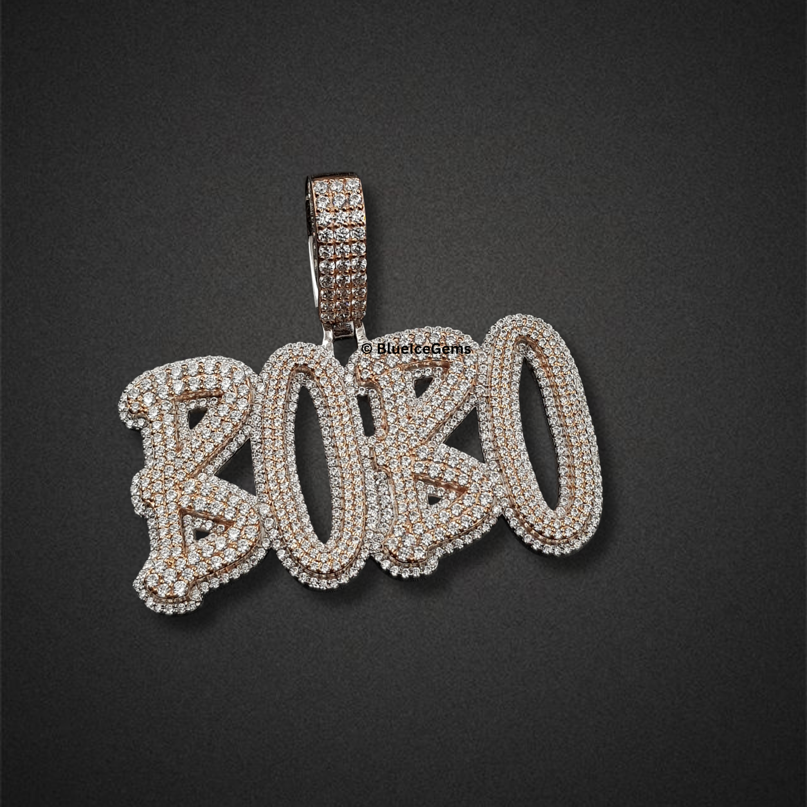 Make a truly bold and playfully luxurious statement with this captivating “BOBO” pendant, an exclusive creation from BlueIceGems. This extraordinary piece is meticulously pave-set with an abundance of dazzling, brilliant white diamonds, ensuring an unbroken, shimmering surface of pure fire and unparalleled scintillation that radiates from every angle. Its chunky, distinctive bubble-letter form offers a modern and substantial presence, immediately drawing the eye. Each curvaceous letter is elegantly outlined in warm, sophisticated rose gold, creating a luxurious contrast that beautifully enhances the diamonds’ sparkle and adds a touch of romantic charm. This robust, substantial three-dimensional piece not only exudes uncompromised brilliance but also projects an audacious personal style, making it the perfect emblem for those who embrace both fun and undeniable luxury.