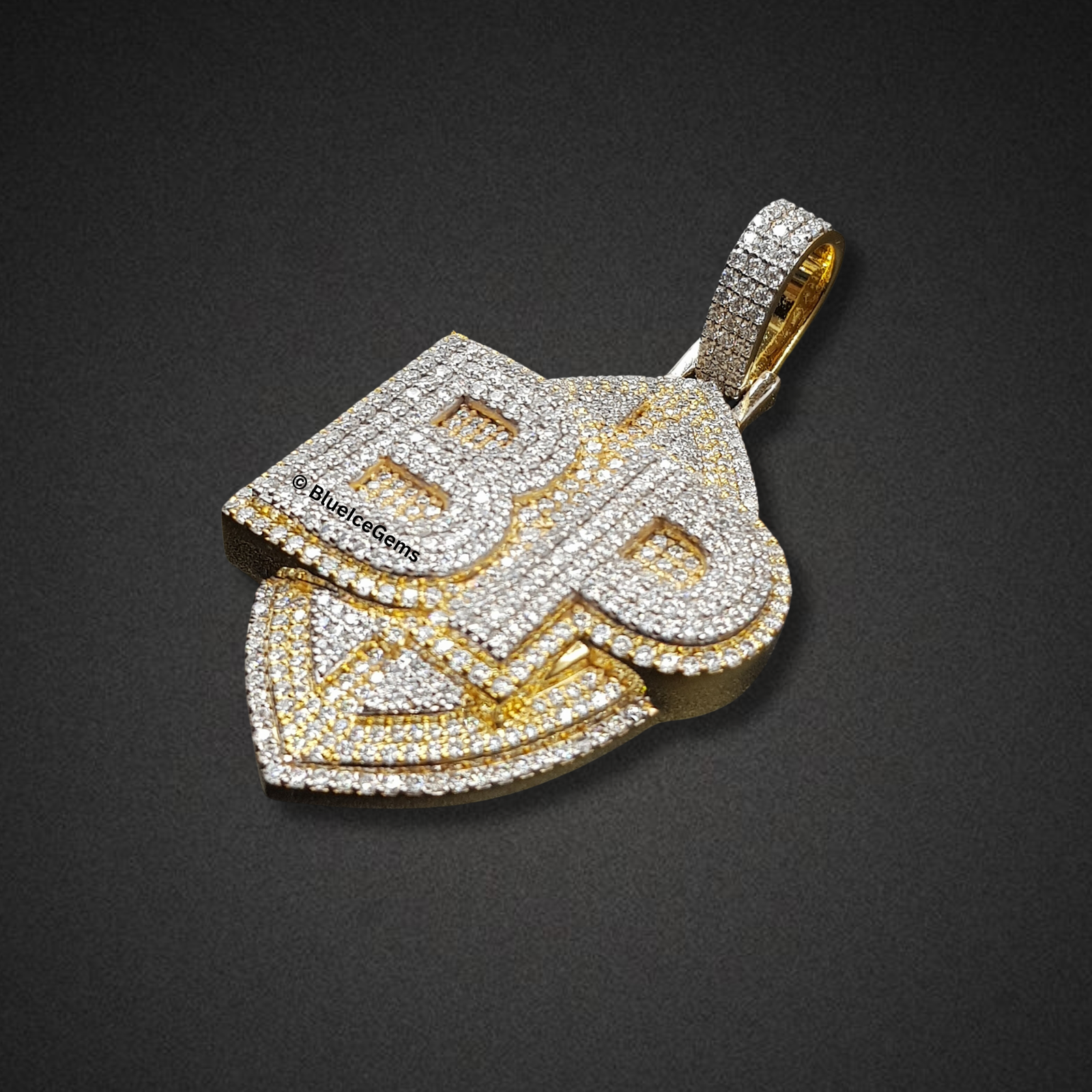 & Free ShippingA dazzling shield-shaped “BP” emblem pendant, fully iced out with sparkling diamonds, framed in yellow gold, for a bold and luxurious personalized statement piece.