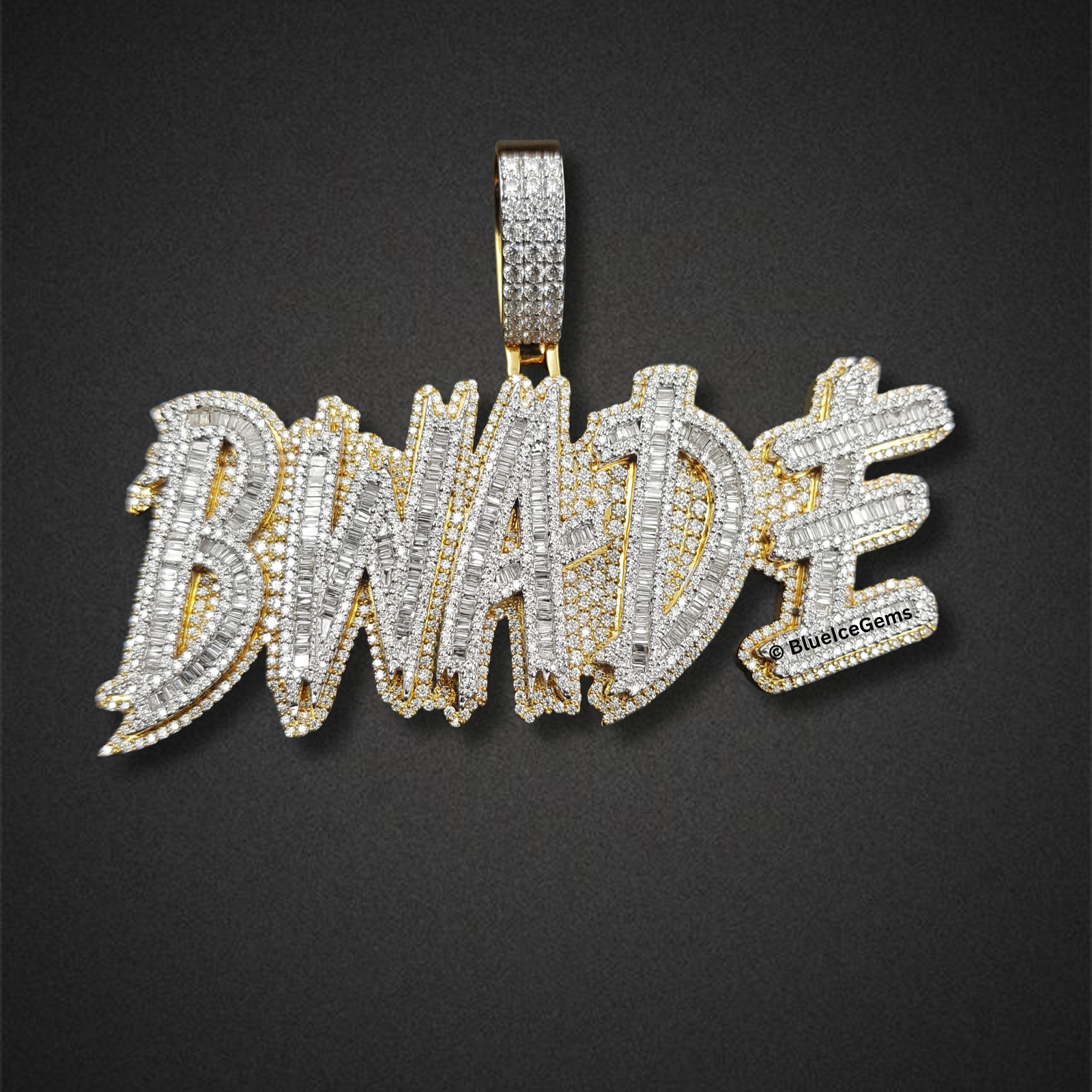 Command the spotlight with The “BWADE” Grand Diamond Statement Pendant, a true testament to bespoke luxury and dazzling artistry. This formidable custom pendant boldly spells out “BWADE” in a dynamic, impactful script, designed to make an unforgettable impression. Each letter is meticulously adorned with an extraordinary combination of crisp baguette-cut diamonds, creating striking linear brilliance and a modern, geometric sparkle. These are seamlessly complemented by a rich pave setting of shimmering round diamonds, meticulously placed to maximize overall sparkle and ensure an uninterrupted cascade of pure fire. The sophisticated interplay of these two diamond cuts produces a captivating texture and an unparalleled cascade of light.