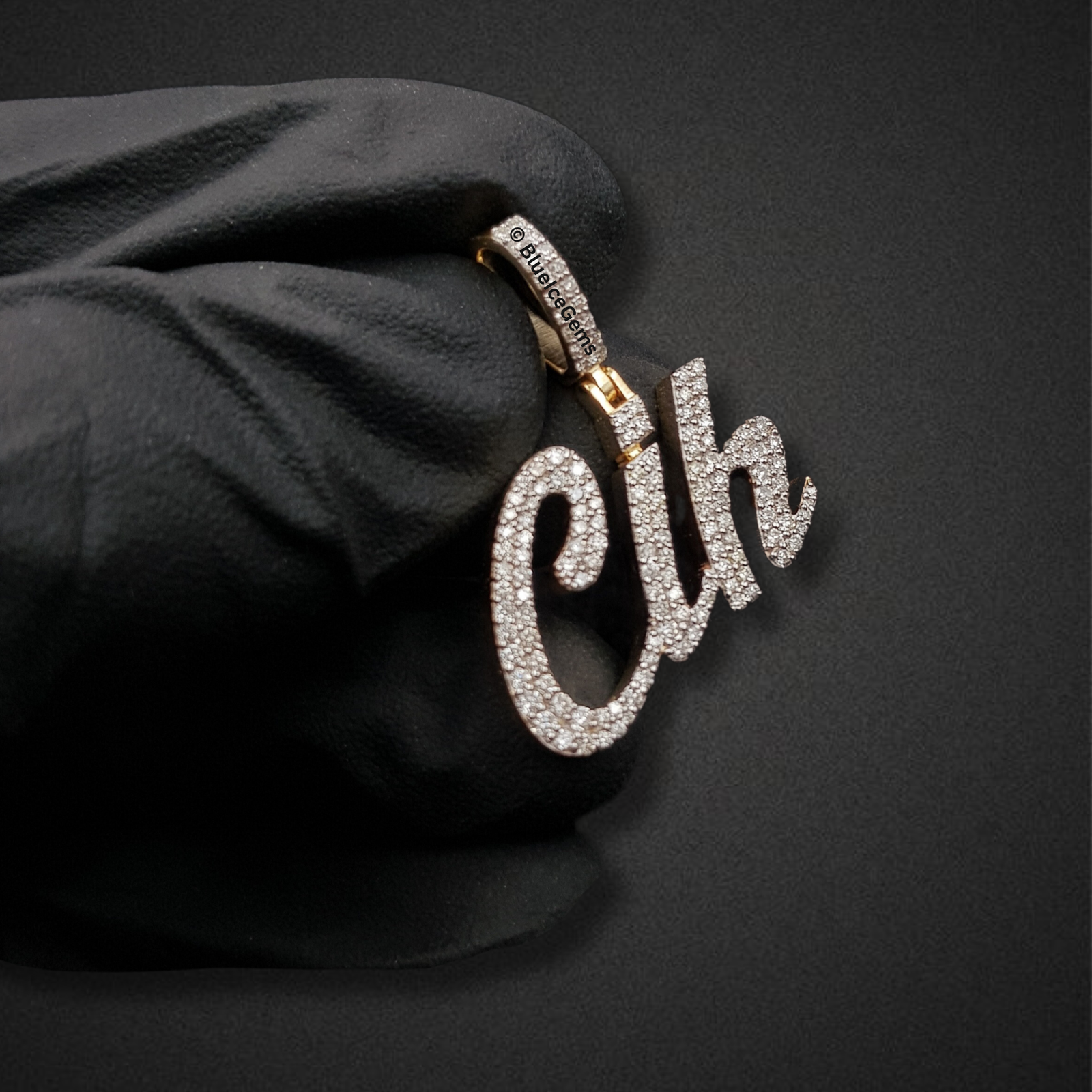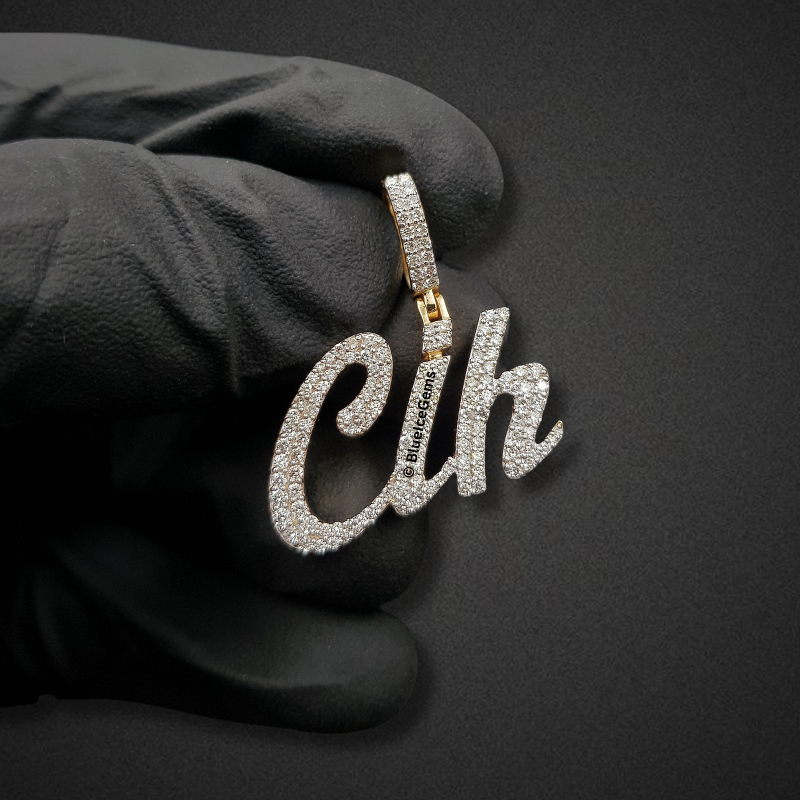 Celebrate a personal style or unique initial combination with The “Cih” Diamond Signature Script Pendant, an exquisitely crafted piece that combines elegant personalization with radiant luxury. This captivating custom pendant gracefully spells out “Cih” in a flowing, handwritten script font, with every delicate curve and flourish meticulously pave-set with an astonishing array of brilliant-cut white diamonds. The sheer density of these diamonds creates an unbroken surface of pure fire and scintillation, ensuring it catches and reflects light with unparalleled brilliance from every angle. Crafted primarily in gleaming white gold for the diamond settings, a subtle touch of polished yellow gold is visible at the bail’s base, adding a refined contrast. The integrated, diamond-studded bail ensures a secure and seamless attachment to your favorite chain, allowing this exceptional piece to hang elegantly and beautifully express individuality.