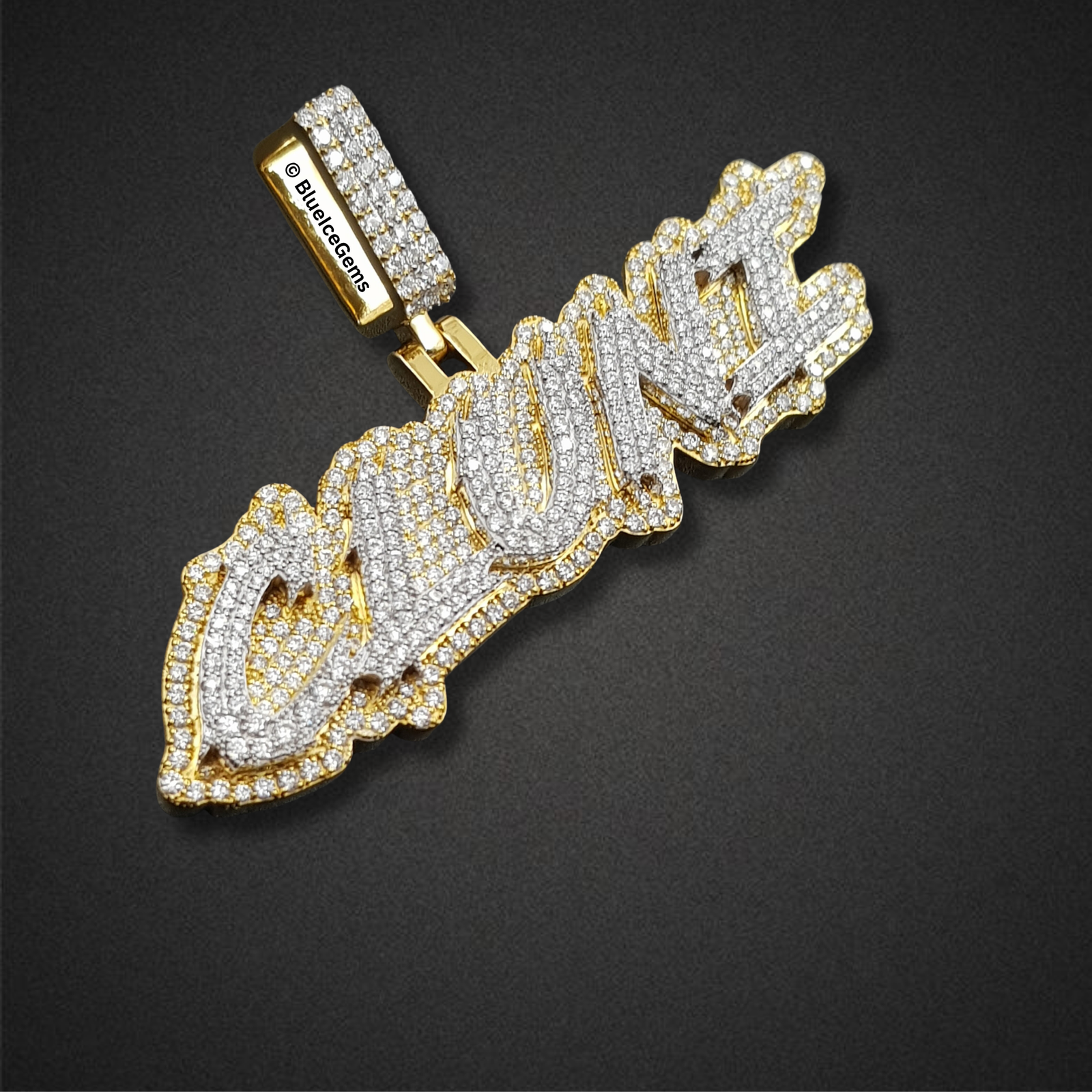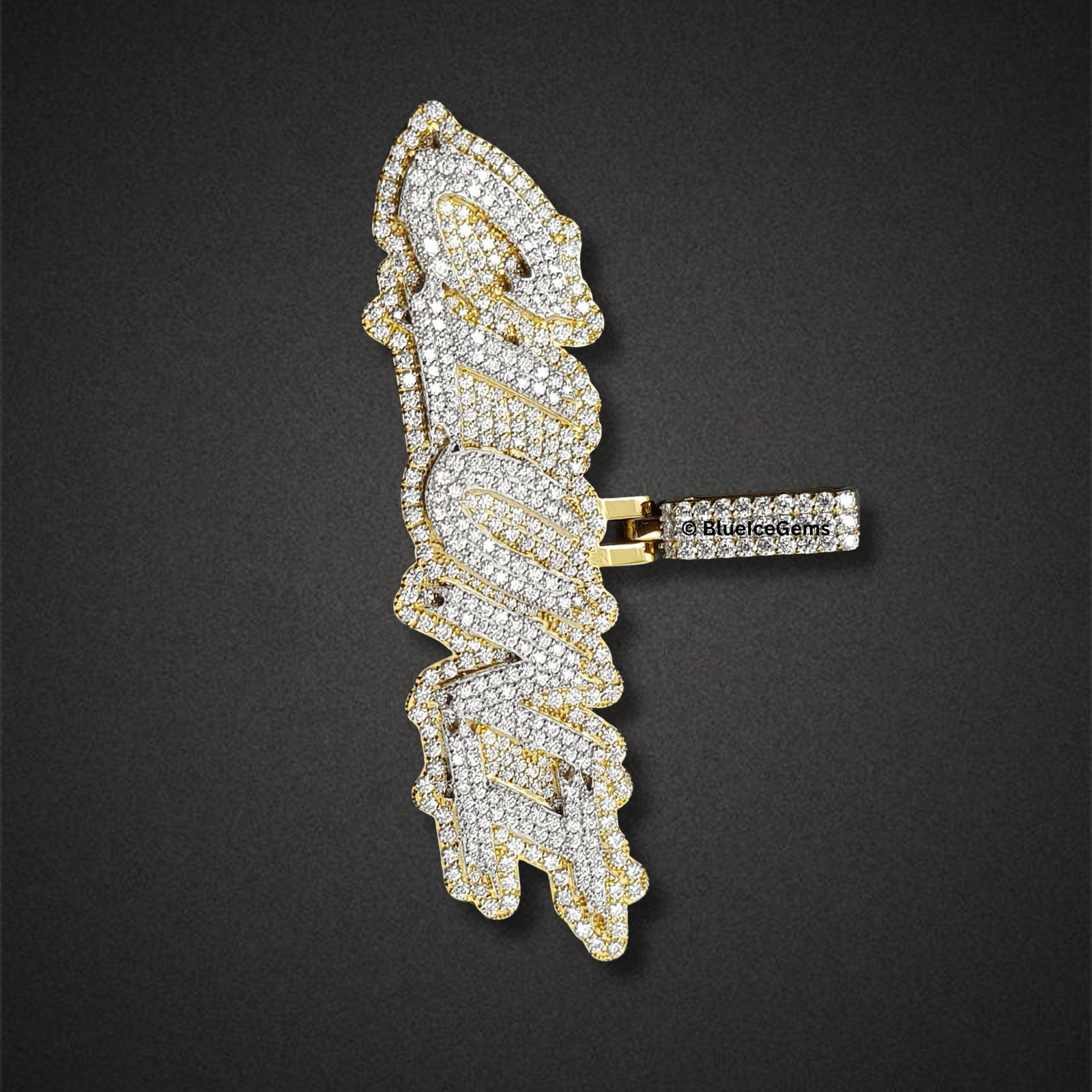 Declare your prosperity and showcase your aspirational drive with this audacious “Rich” script pendant, an extraordinary creation exclusively from BlueIceGems. This magnificent piece is lavishly and meticulously pave-set with brilliant white diamonds, ensuring every elegant curve shimmers with an unbroken surface of pure fire and unparalleled scintillation that radiates captivating light. The unique, dynamic dripping outline of the script adds an artistic, modern edge, beautifully framed in warm, luxurious yellow gold. This elegant contrast dramatically enhances the diamonds’ icy sparkle and elevates its opulent appeal. This substantial, three-dimensional pendant is more than just jewelry; it’s a powerful and uncompromised statement of luxury and bold, aspirational style, designed to be a radiant emblem of your success and future endeavors.