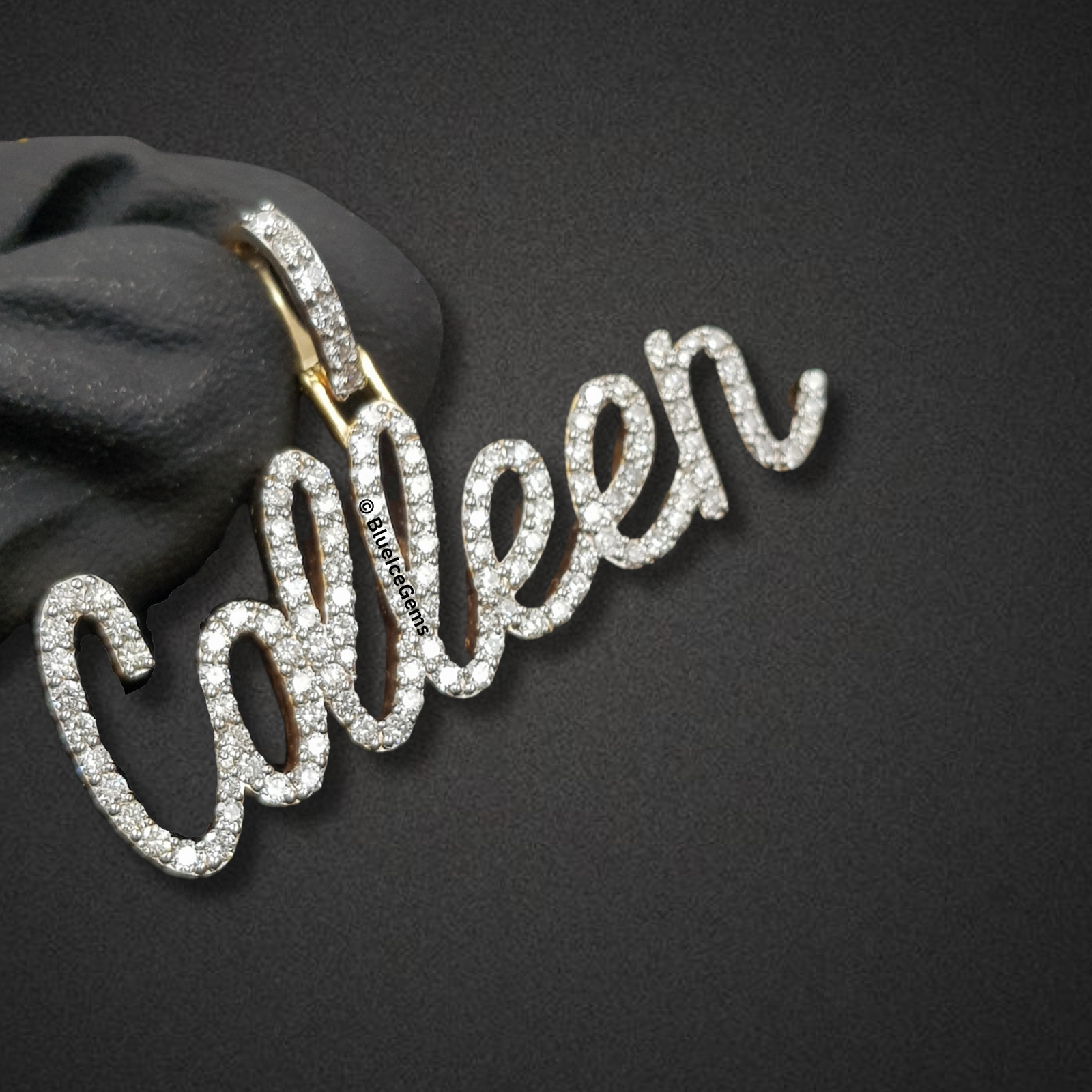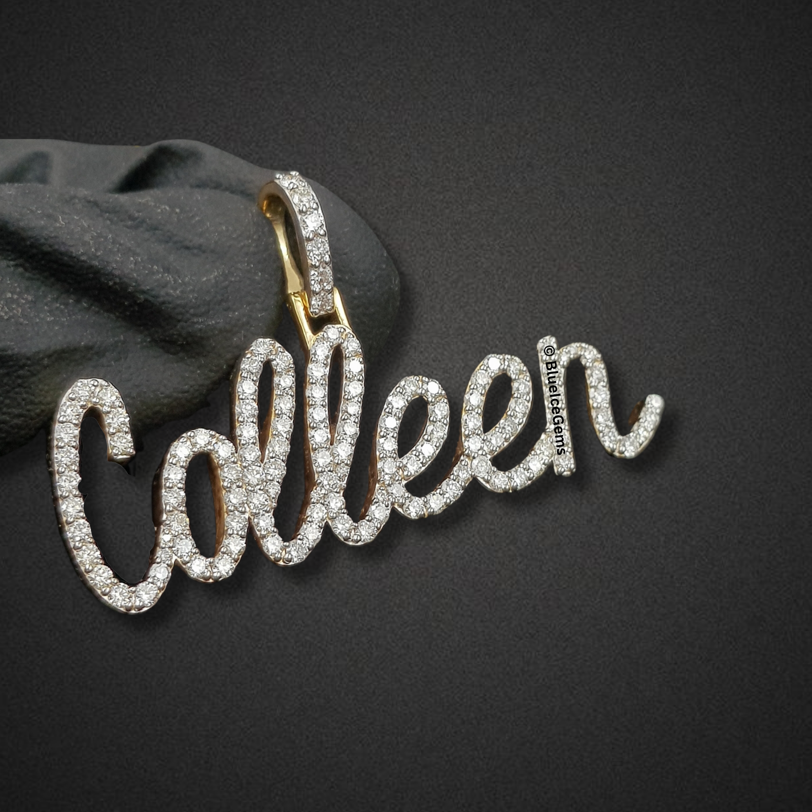 Celebrate a beloved name with The “Colleen” Diamond Signature Script Pendant, a truly enchanting piece that flawlessly combines personalized sentiment with radiant luxury. This captivating custom pendant elegantly spells out “Colleen” in a graceful, handwritten script font, with every delicate curve and flourish meticulously pave-set with an astonishing array of brilliant-cut white diamonds. The sheer density of these diamonds creates an unbroken surface of pure fire and scintillation, ensuring it catches and reflects light with unparalleled brilliance from every angle. Crafted primarily in gleaming white gold for the diamond settings, a subtle touch of polished yellow gold is visible at the bail’s base, adding a refined contrast. The integrated, diamond-studded bail ensures a secure and seamless attachment to your favorite chain, allowing this exceptional piece to hang gracefully and beautifully express individuality.