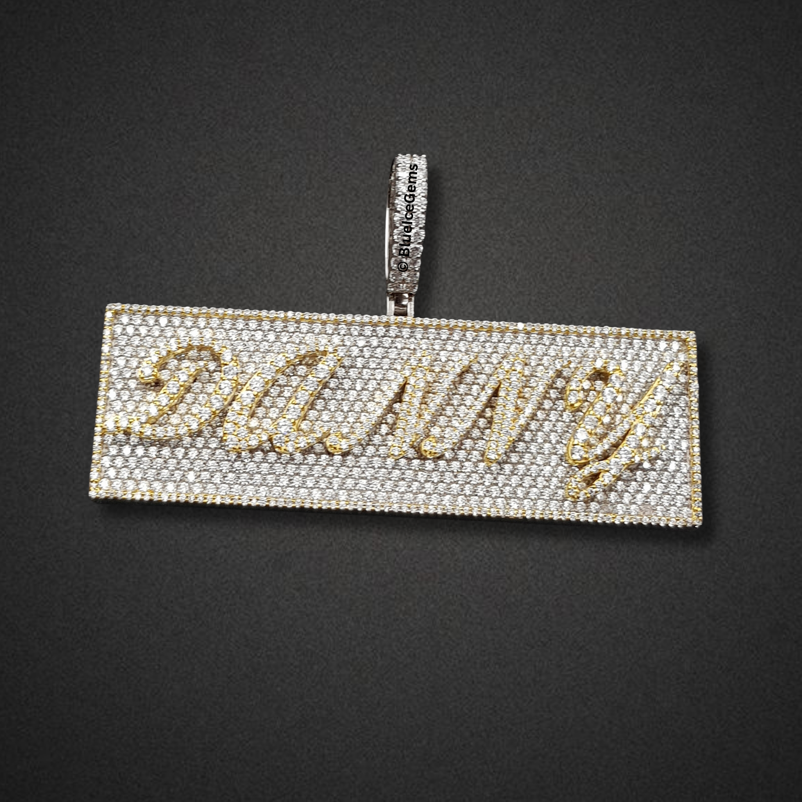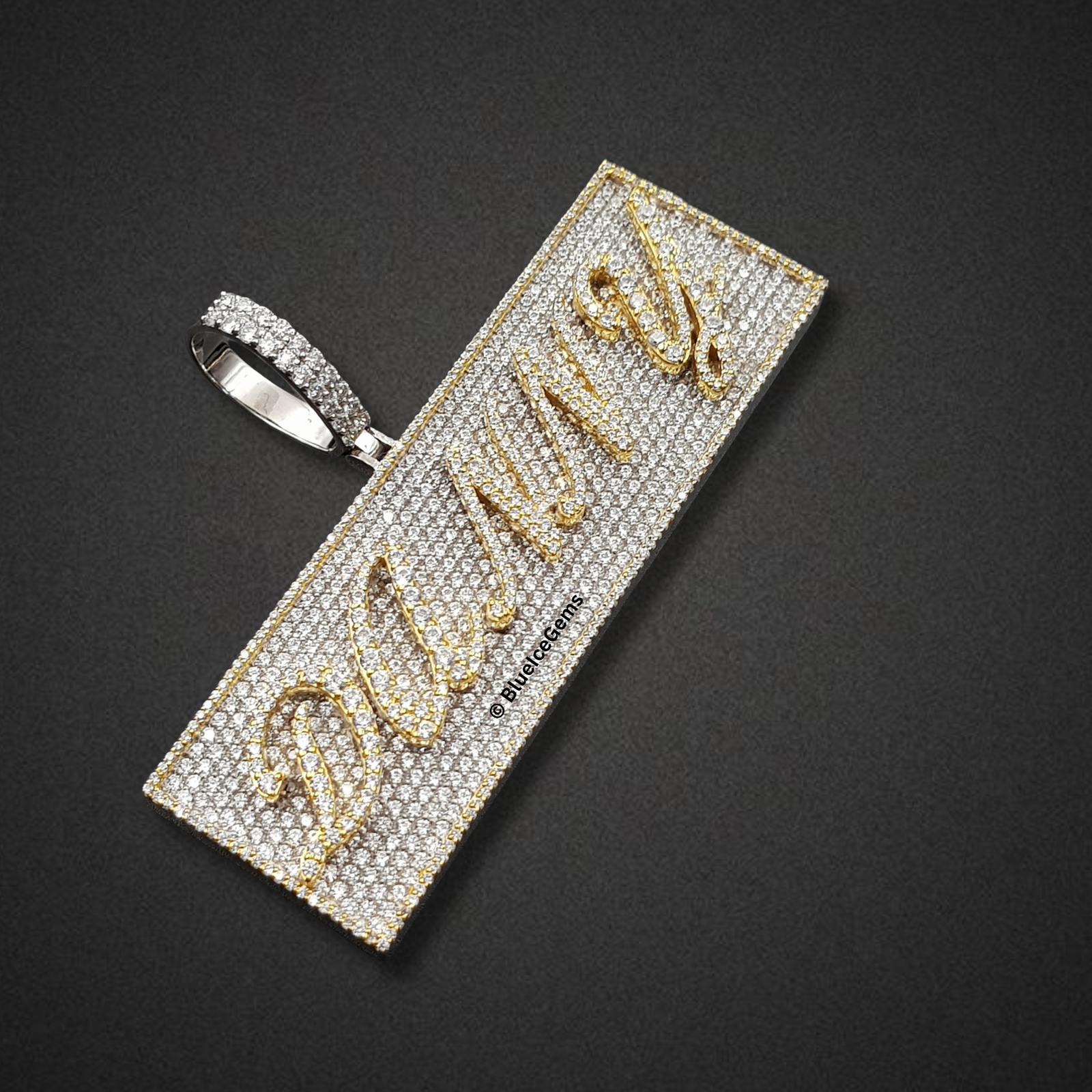 Declare your identity with this stunning “Danny” name plate pendant, a truly captivating piece designed to dazzle from every angle. This impressive rectangular pendant is meticulously blanketed in an astonishing array of brilliant pave-set white diamonds, creating an uninterrupted field of pure fire and scintillation that captures and reflects light with unparalleled brilliance. The name “Danny” is expertly raised in polished yellow gold, providing a rich, warm contrast that enhances the depth and luxurious appeal of the design against the icy diamond background. Crafted in gleaming white gold for the diamond settings and accented with yellow gold, the integrated, diamond-studded bail ensures a secure and prominent display on your chosen chain. This pendant is more than just jewelry; it’s a powerful emblem of identity, aspiration, and uncompromised luxury, meticulously designed for those who demand attention and appreciate the pinnacle of custom diamond artistry.
