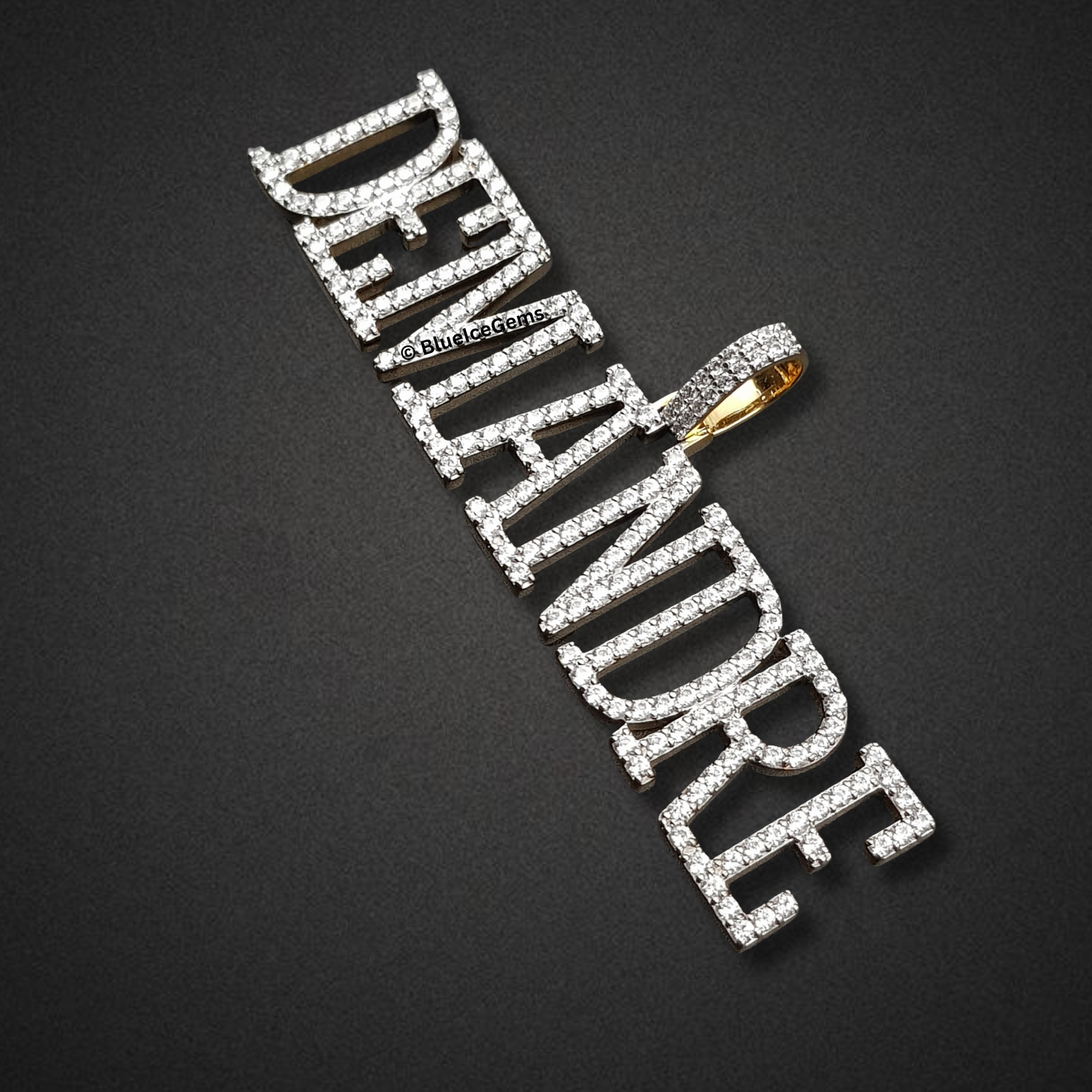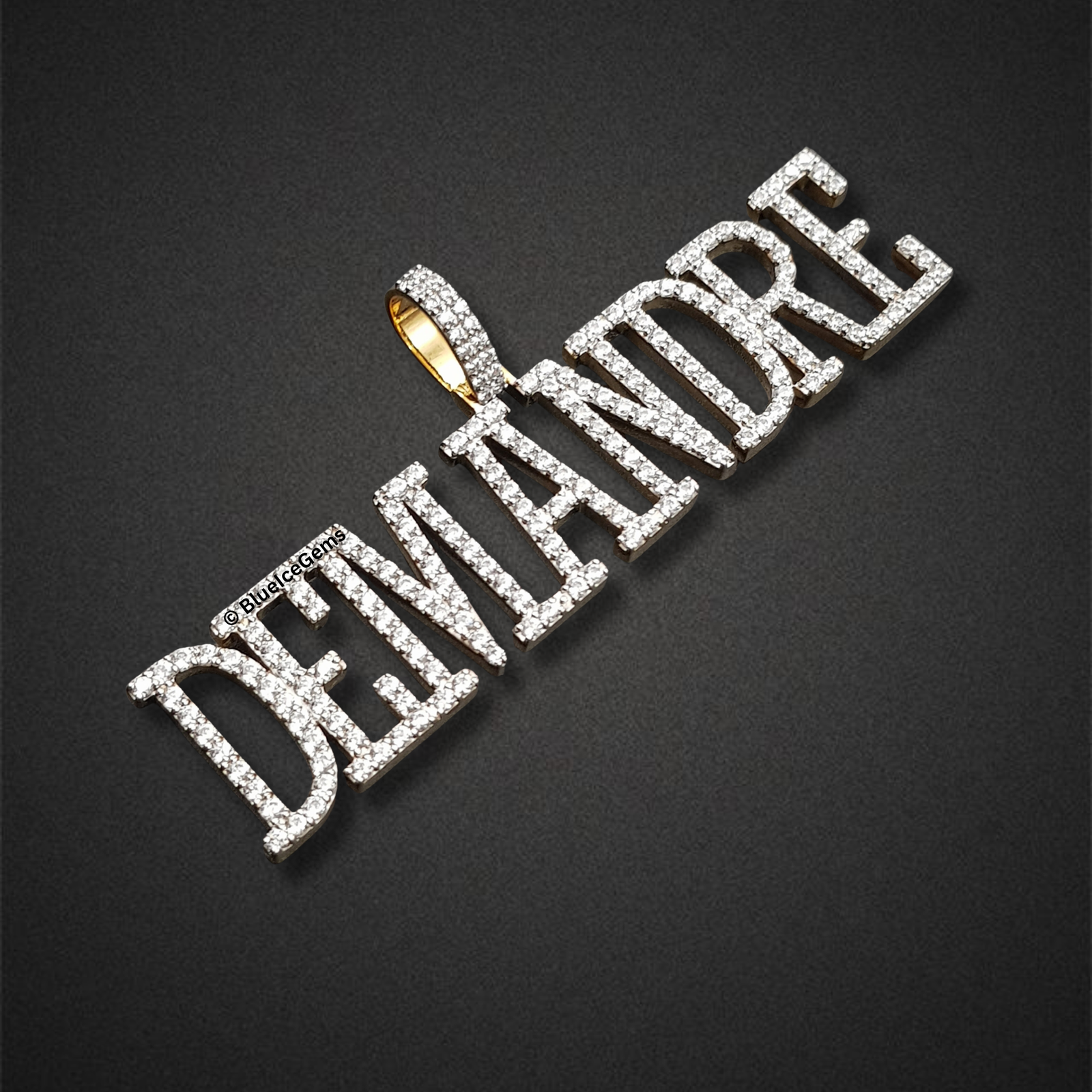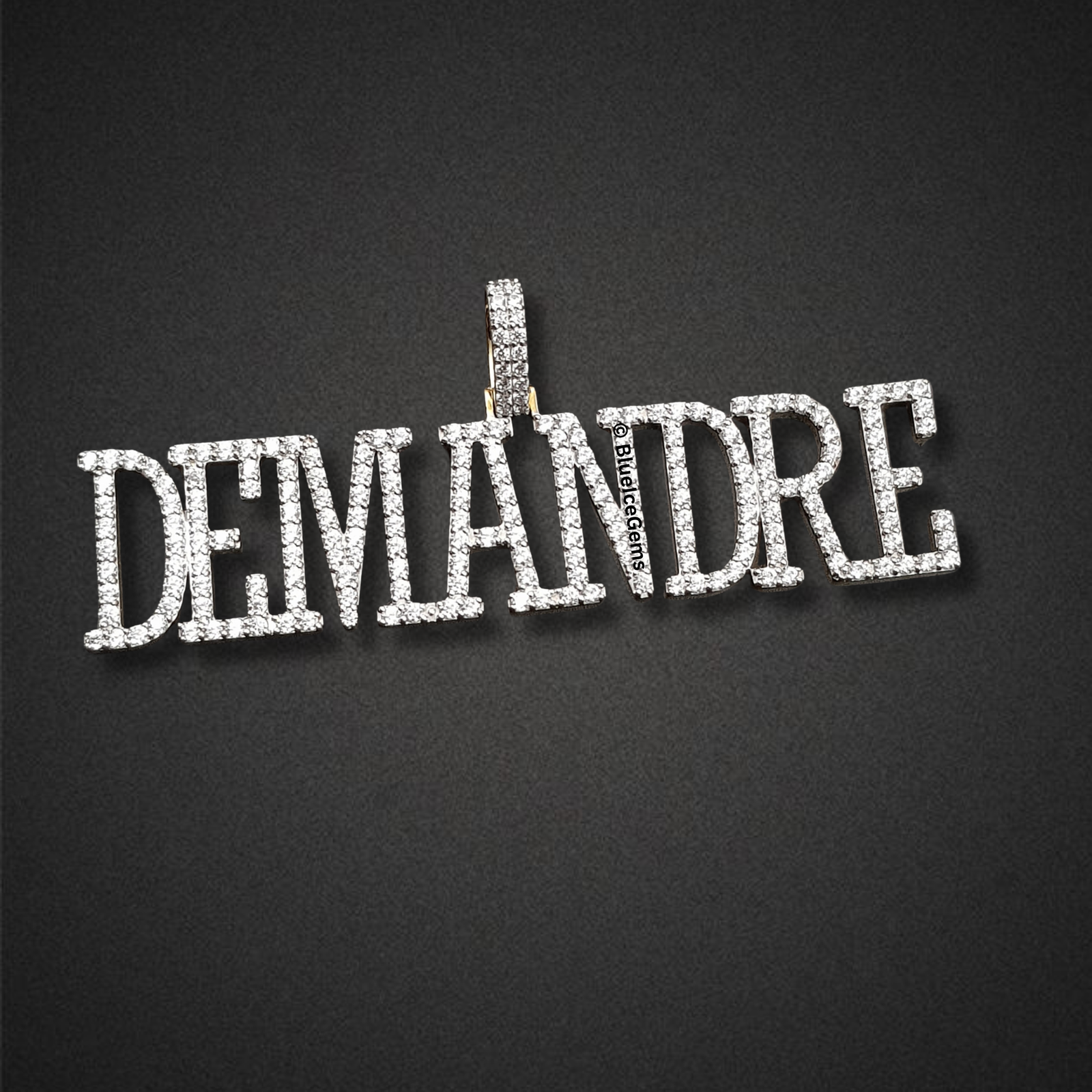 Celebrate a personal name and make an unforgettable statement with this striking “DEMANDRE” pendant, an exquisite piece from BlueIceGems. This captivating pendant is meticulously pave-set with an abundance of dazzling, brilliant white diamonds, ensuring a breathtaking display of fire and sparkle from every angle. Each bold, precisely formed block letter is expertly crafted to create an unbroken surface of pure scintillation, designed specifically to capture and reflect light with unparalleled brilliance and intensity. Crafted entirely in gleaming, highly polished white gold, this substantial pendant not only offers a sleek, modern aesthetic but also provides a powerful and deeply personal statement of luxury and individuality. It’s the perfect way to wear a significant name close to your heart with exceptional elegance.