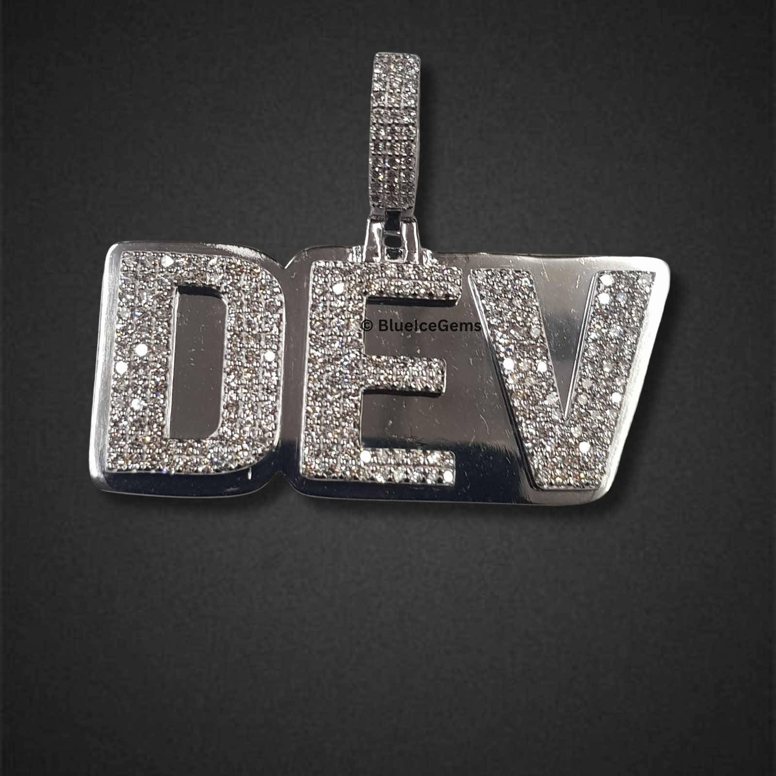 Make a bold and truly dynamic statement with this custom “DEV” pendant, an exclusive creation from BlueIceGems. This extraordinary piece showcases a striking contrast between the dazzling brilliance of pave-set white diamonds and the sleek, polished perfection of white gold. The first and last letters, the “D” and “V,” are entirely iced out with brilliant white diamonds, creating an unbroken surface of pure fire and unparalleled scintillation that radiates captivating light. In a powerful design choice, the central “E” gleams with highly polished white gold, providing a sophisticated and luxurious contrast that highlights the icy sparkle of the surrounding diamonds. This robust, three-dimensional pendant is more than just jewelry; it’s a dynamic and luxurious personalized piece, exuding uncompromised style and making a powerful statement of individual identity and refined taste.