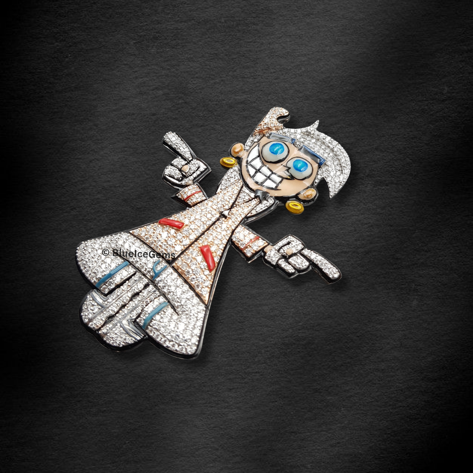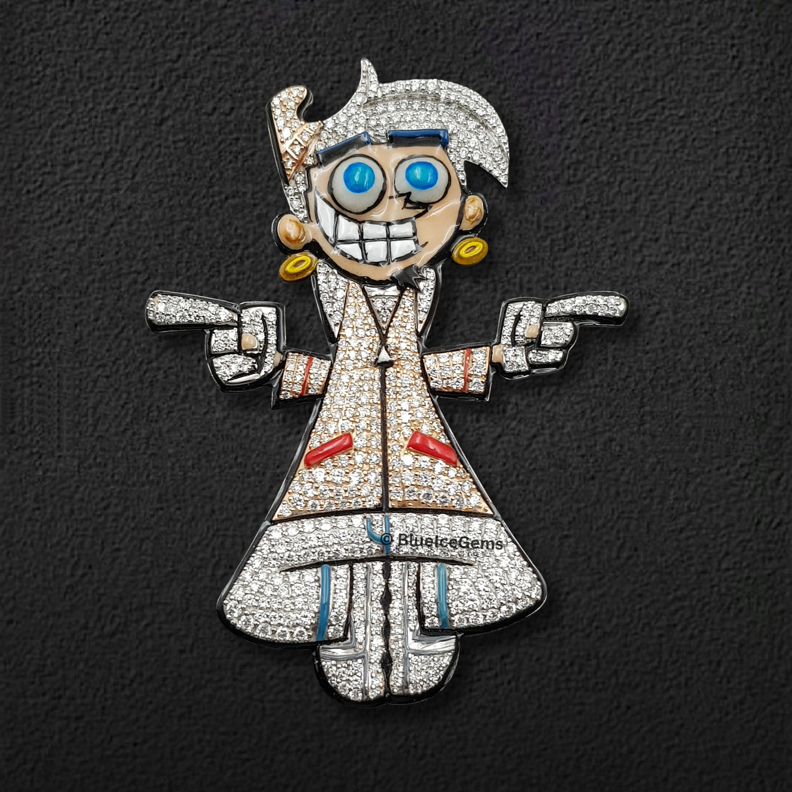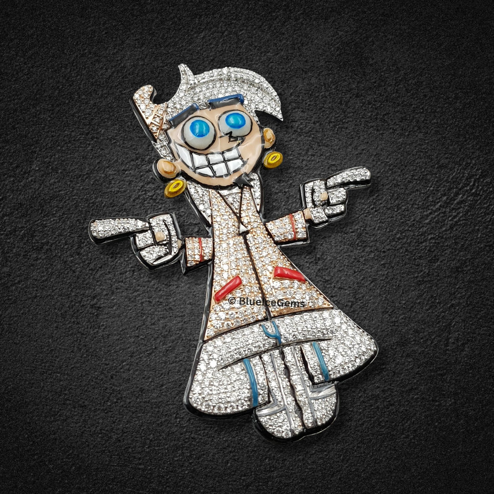 This playful yet undeniably luxurious pendant from BlueIceGems captures a beloved cartoon character, Denzel Crocker from Fairly OddParents, in a dynamic, instantly recognizable pose. This extraordinary piece is lavishly and meticulously pave-set with brilliant white diamonds, ensuring an unbroken, shimmering surface of pure fire and unparalleled scintillation that radiates captivating light. Adding to its vibrant character, the pendant features striking blue and red enamel accents, which intricately bring his iconic features and attire to life. Every intricate detail, from his expressive face to his signature attire, is rendered with precision, further highlighted by gleaming gold earrings that complete his distinctive look. This isn’t just a piece of fine jewelry; it’s a whimsical and nostalgic tribute to a cherished character, blending fun and personality with uncompromised diamond brilliance and opulent luxury, making a truly unique statement for the discerning fan.