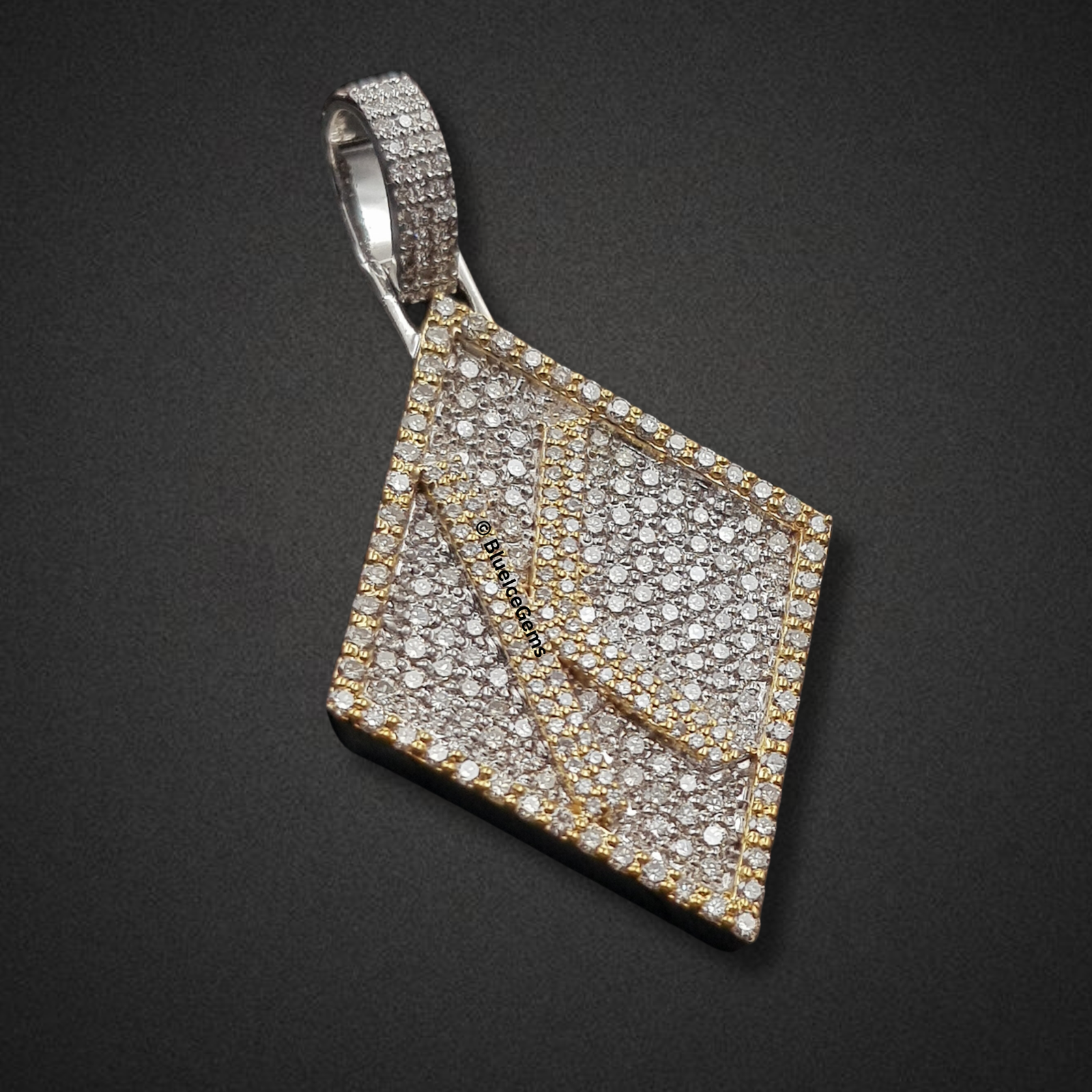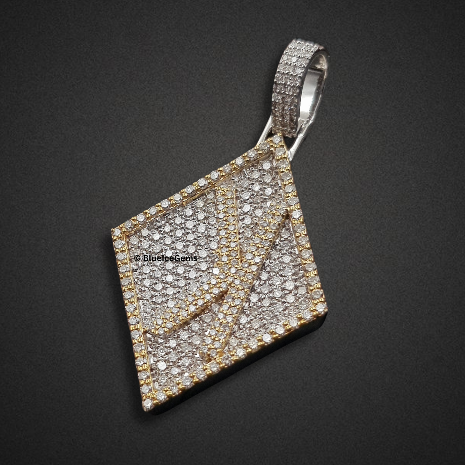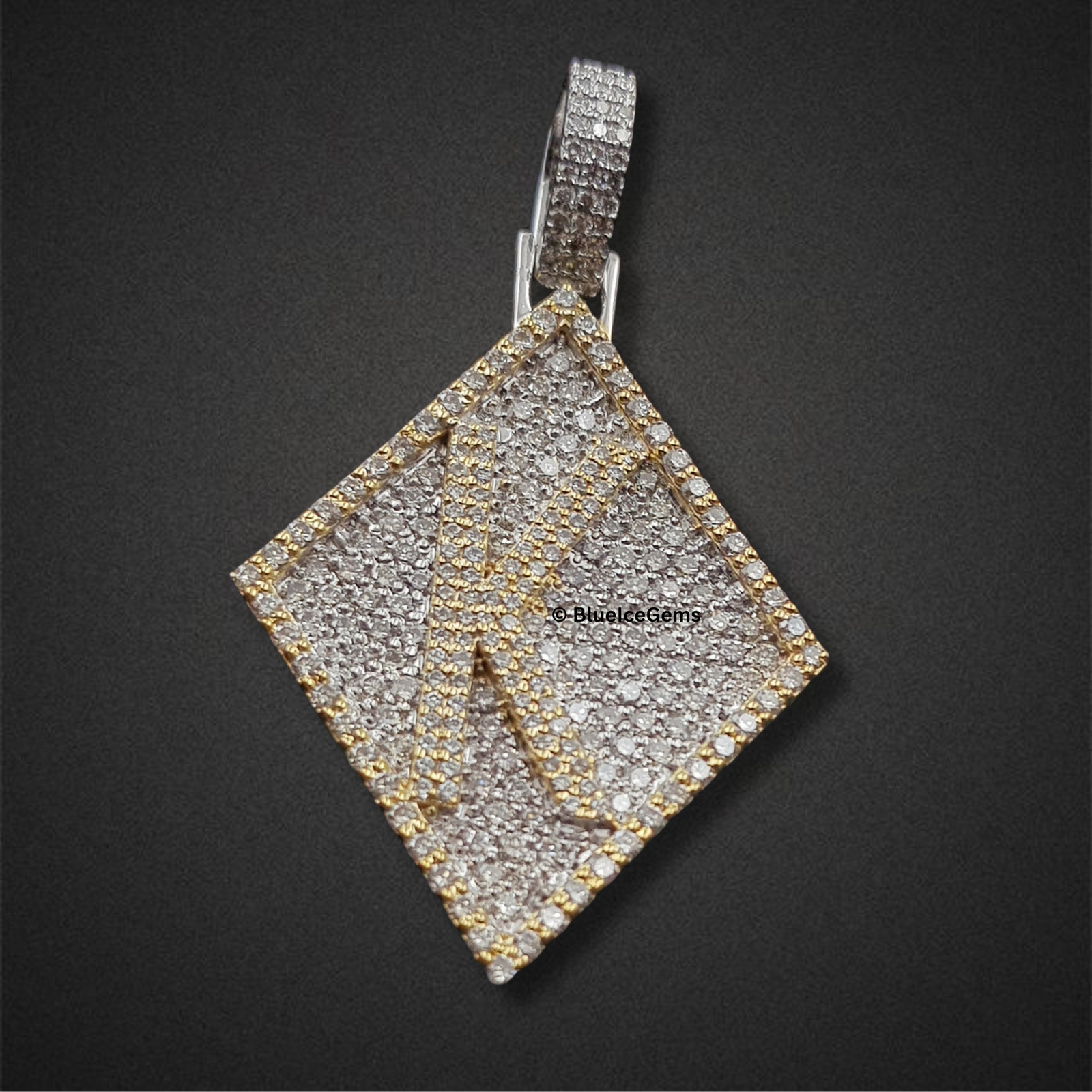 Command attention with this bold, diamond-shaped pendant, a striking fusion of geometric design and dazzling brilliance. Its entire surface is meticulously blanketed in an astonishing array of brilliant pave-set white diamonds, creating an uninterrupted field of pure fire and scintillation that captures and reflects light from every angle. Dynamic lines of polished yellow gold elegantly cut across the diamond form, adding depth and contrast, while the robust bail, also diamond-studded, ensures a prominent display. This piece exudes uncompromised luxury and audacious personal style, making a powerful statement of aspiration and unique design.H 2 inch (without bail) * width 2 inch (it’s depend on letters)