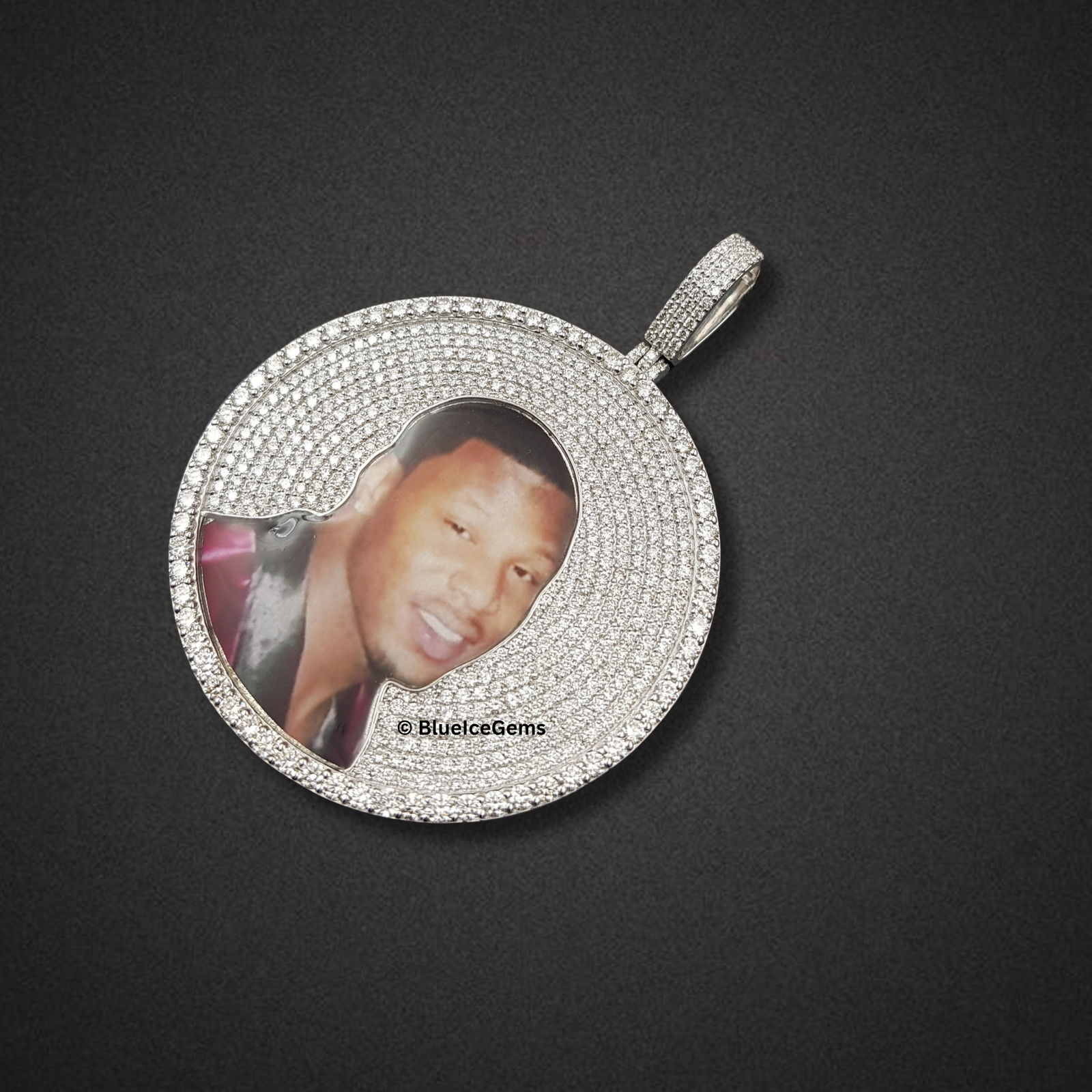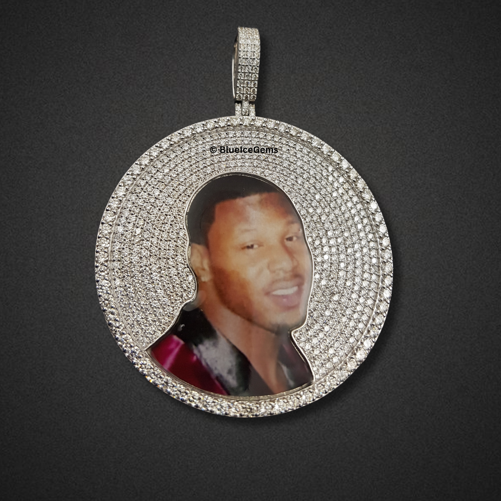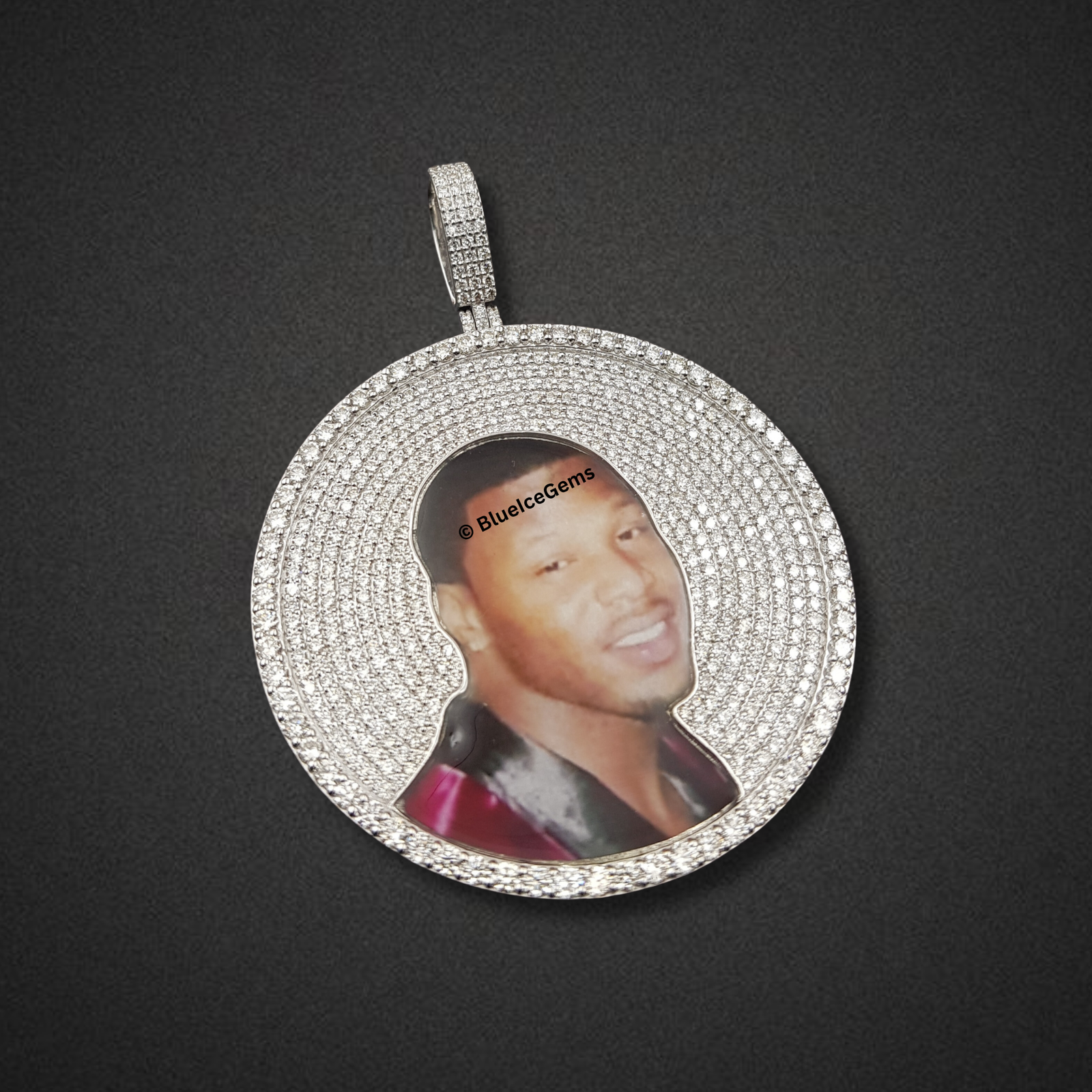 Preserve a cherished memory and honor a beloved individual with The “Diamond Tribute” Custom Photo Medallion, a truly bespoke and emotionally resonant work of art. This substantial circular pendant offers the ultimate in personalized luxury, showcasing a meticulously integrated custom photo of a loved one at its heart, allowing their presence to shine. The captivating image is beautifully framed by an expansive and breathtaking pave setting of countless brilliant-cut diamonds, extending across the entire face of the medallion and creating an awe-inspiring field of shimmering light. Crafted in gleaming white gold, the seamless setting allows the diamonds to truly take center stage, creating an illusion of pure, floating ice. The robust, diamond-studded bail ensures a secure and prominent display on your chosen chain, allowing this powerful emblem to be worn close to the heart with unparalleled brilliance and enduring sparkle.