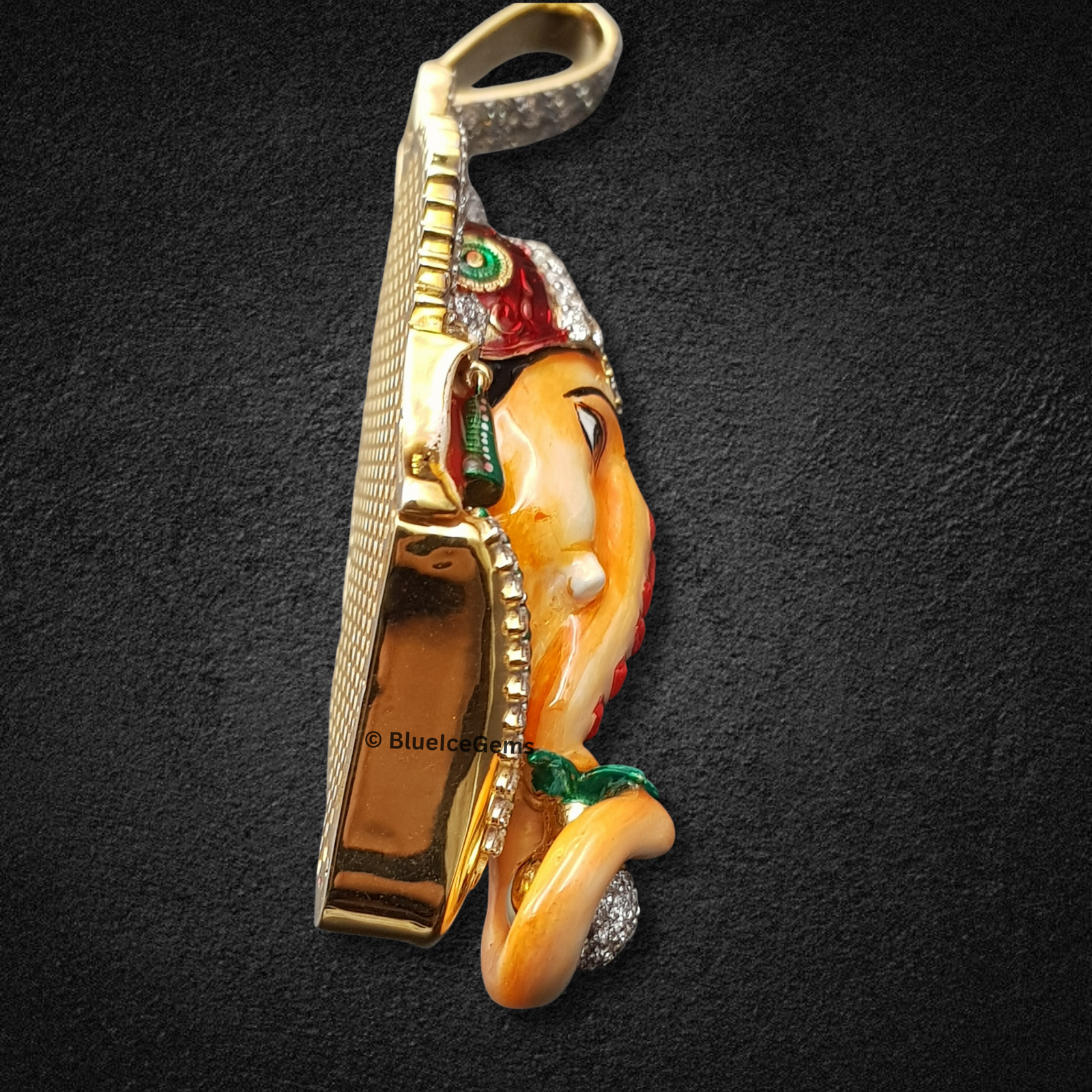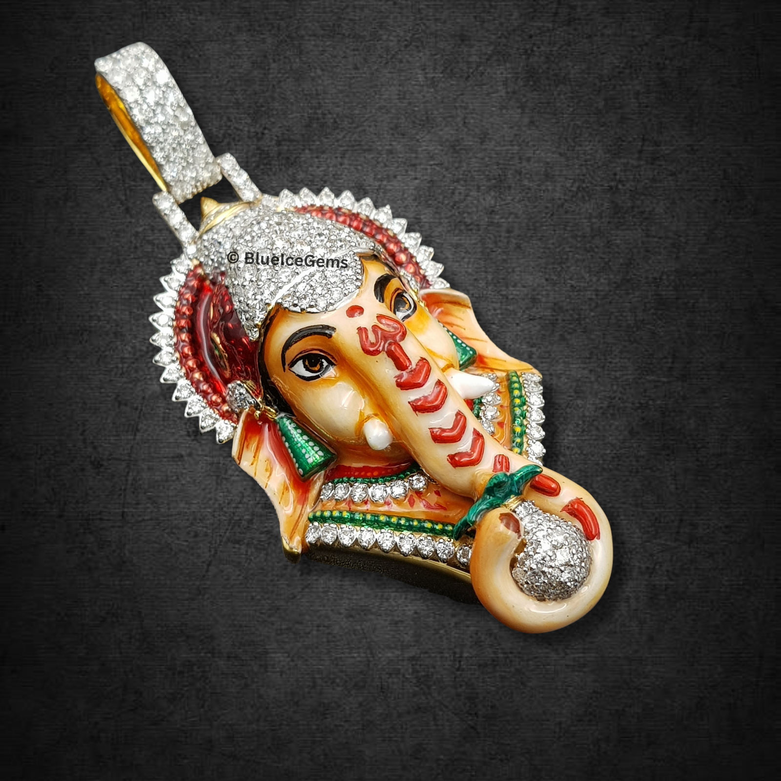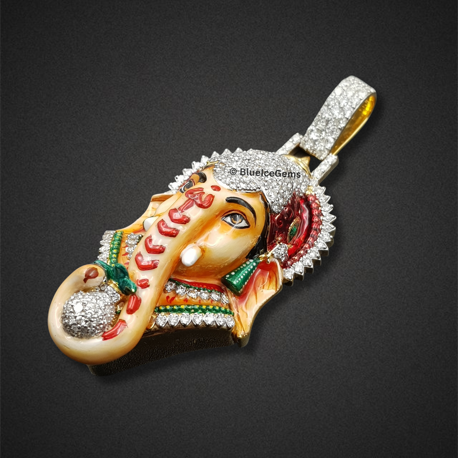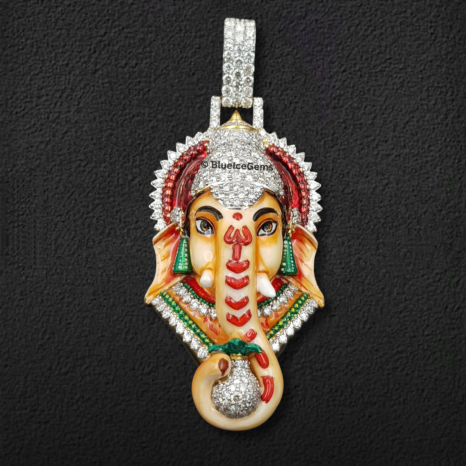 Embrace blessings, prosperity, and spiritual enlightenment with this magnificent Ganesha head pendant, an exquisitely detailed and truly unique piece from BlueIceGems. This extraordinary pendant is intricately detailed with vibrant, meticulously applied enamel and sparkling diamonds, bringing the beloved deity to life with unparalleled artistry. His majestic crown, revered forehead, and the auspicious modak he holds are all lavishly pave-set with brilliant white diamonds, creating an unbroken cascade of pure fire and unparalleled scintillation that radiates divine light. Meanwhile, a palette of colorful enamel precisely brings his intricate features to life, adding depth and a spiritual glow. This substantial piece is more than just jewelry; it creates a powerful, spiritually significant, and luxurious statement, serving as a constant reminder of wisdom, new beginnings, and the removal of obstacles for the discerning wearer.