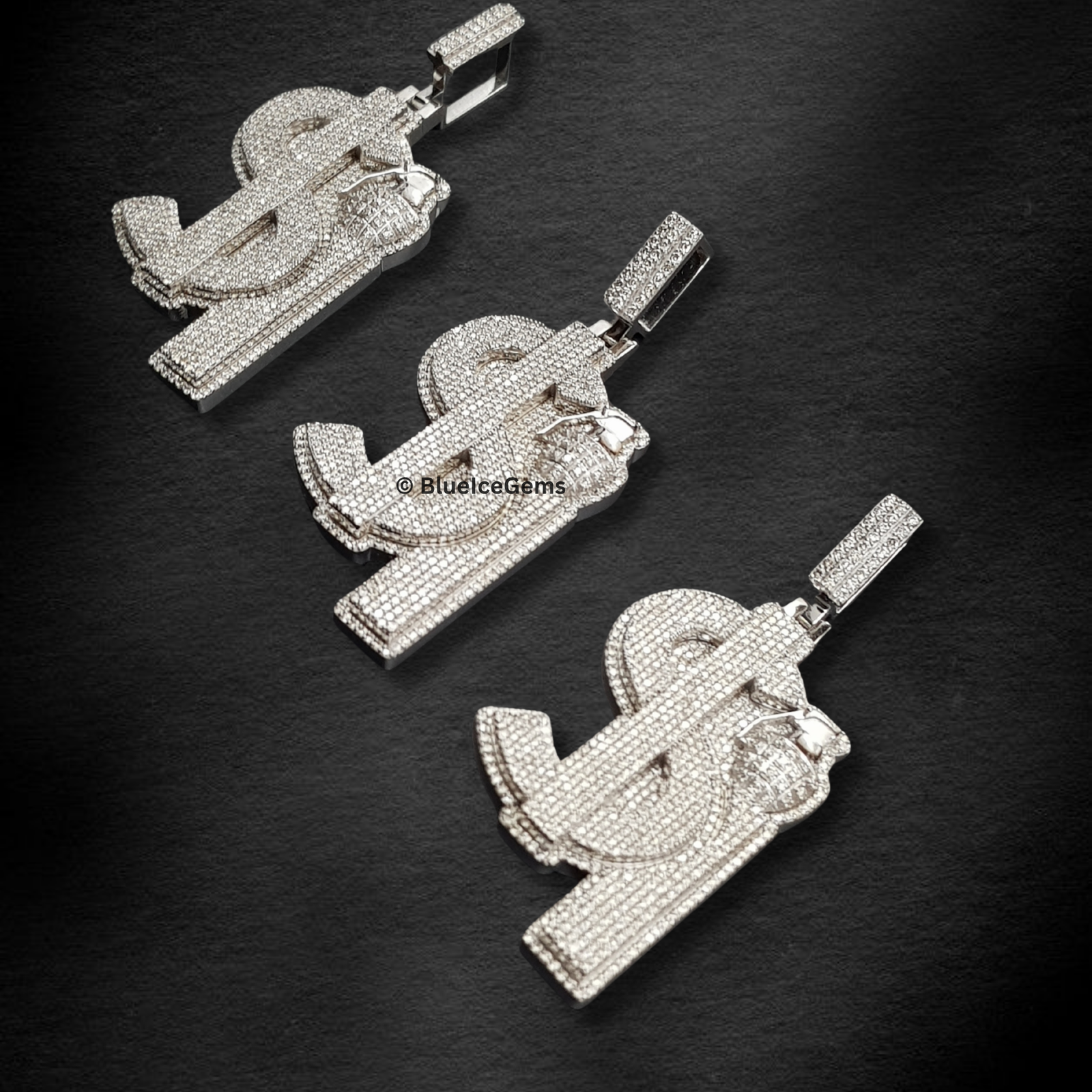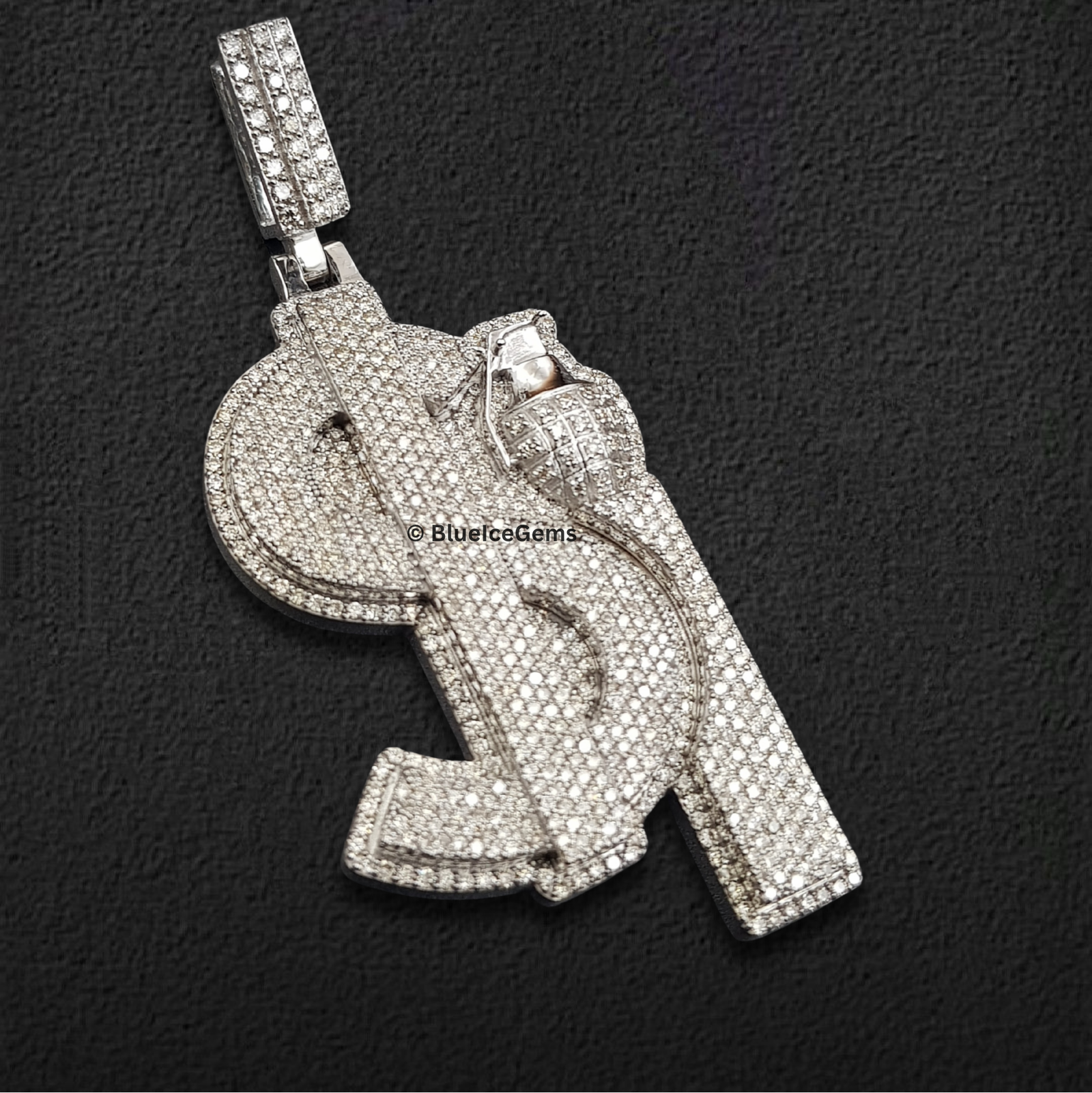 Make an audacious and undeniably powerful statement with this striking dollar sign ($) pendant, an extraordinary creation exclusively from BlueIceGems. This magnificent piece is meticulously pave-set with dazzling, brilliant white diamonds, ensuring an unbroken surface of pure fire and unparalleled scintillation that radiates captivating light from every angle. The central dollar symbol is powerfully intertwined with a realistic, fully diamond-encrusted handgun, creating a bold and provocative design that symbolizes raw ambition and unyielding power. Crafted in gleaming, highly polished white gold, this substantial pendant offers a sleek, modern aesthetic that beautifully complements the icy brilliance of the diamonds. This isn’t just a piece of fine jewelry; it exudes uncompromised luxury and audacious, bold style, designed for those who wear their drive and confidence with unparalleled flair.