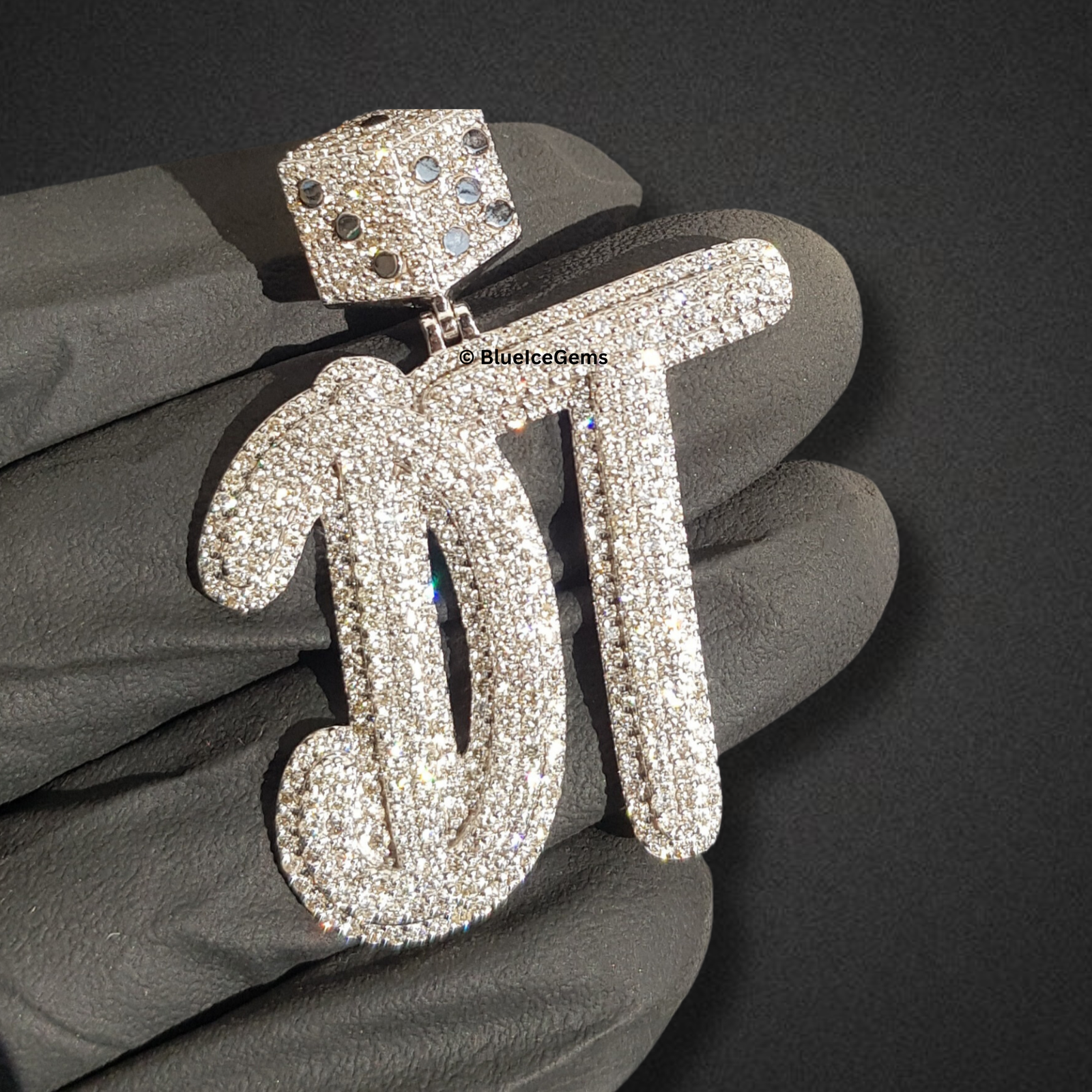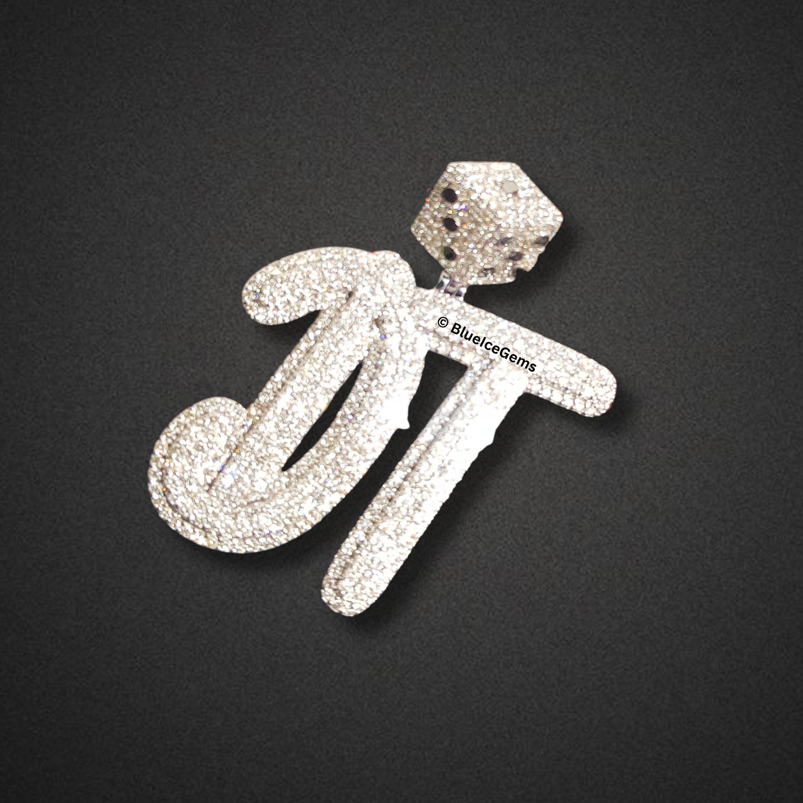 Roll the dice on style with The “DT” Lucky Dice Diamond Pendant, a captivating and audacious piece that blends personalized initials with a playful symbol of chance. This impressive custom pendant elegantly spells out “DT” in a dynamic, flowing script, with every delicate curve and flourish meticulously pave-set with an astonishing array of brilliant-cut white diamonds. The sheer density of diamonds creates an unbroken surface of pure fire and scintillation, ensuring it catches and reflects light with unparalleled brilliance from every angle. Uniquely crowning this luxurious piece is a meticulously detailed, diamond-studded die (singular of dice), complete with visible black enamel dots for a realistic touch, symbolizing luck or a love for games. Crafted entirely in gleaming white gold, the seamless setting allows the diamonds to truly take center stage. The integrated bail ensures a secure and prominent display on your chosen chain, making this “DT” pendant a powerful emblem of identity, risk-taking, and uncompromised diamond artistry.
