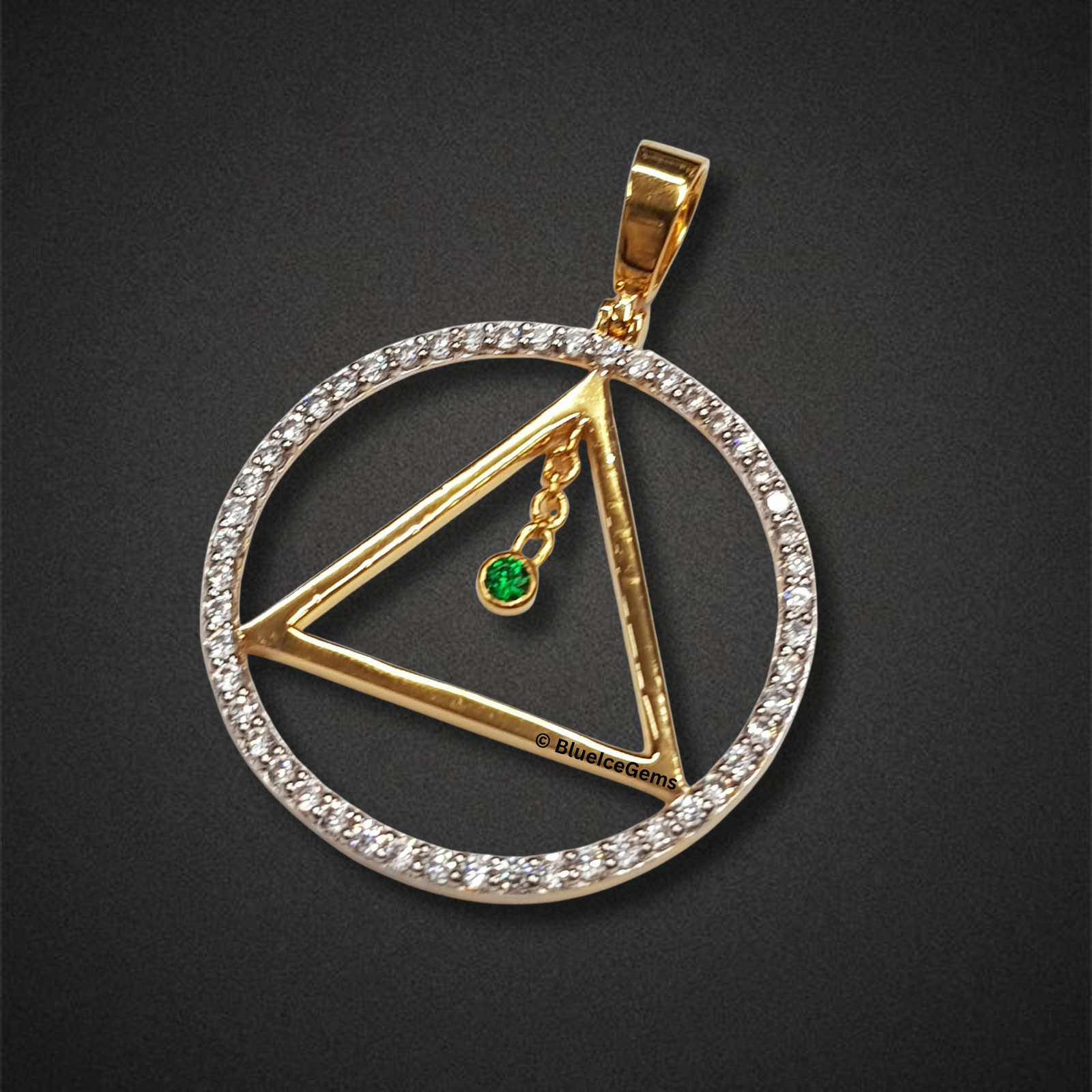 A symbolic circular pendant with a pave diamond halo, framing a golden triangle with a delicate dangling emerald, representing balance and growth.