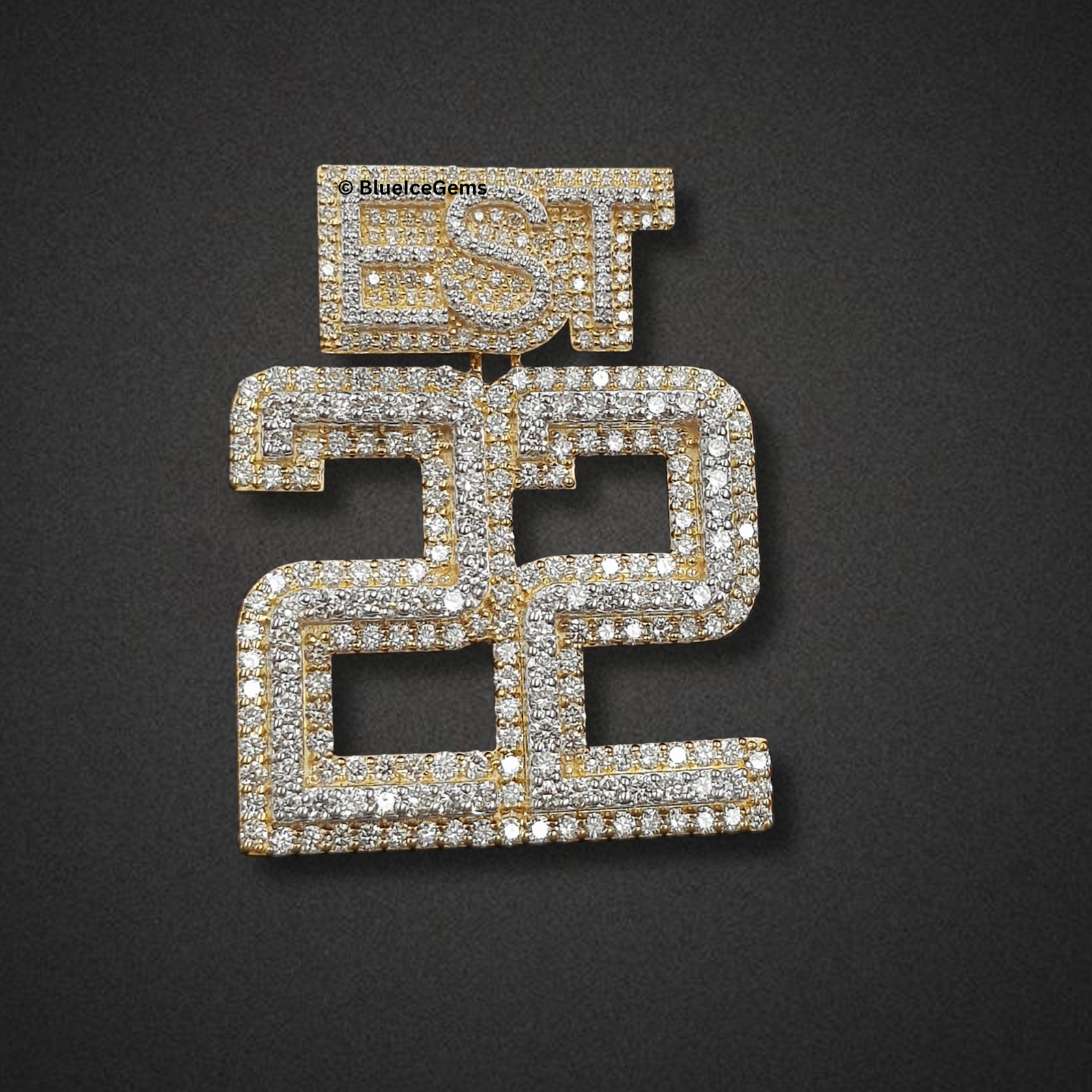 A massive “22” pendant, fully iced out with sparkling white pave diamonds, topped with a brilliant diamond “EST” emblem, all framed in yellow gold, for a show-stopping and bold personalized statement.