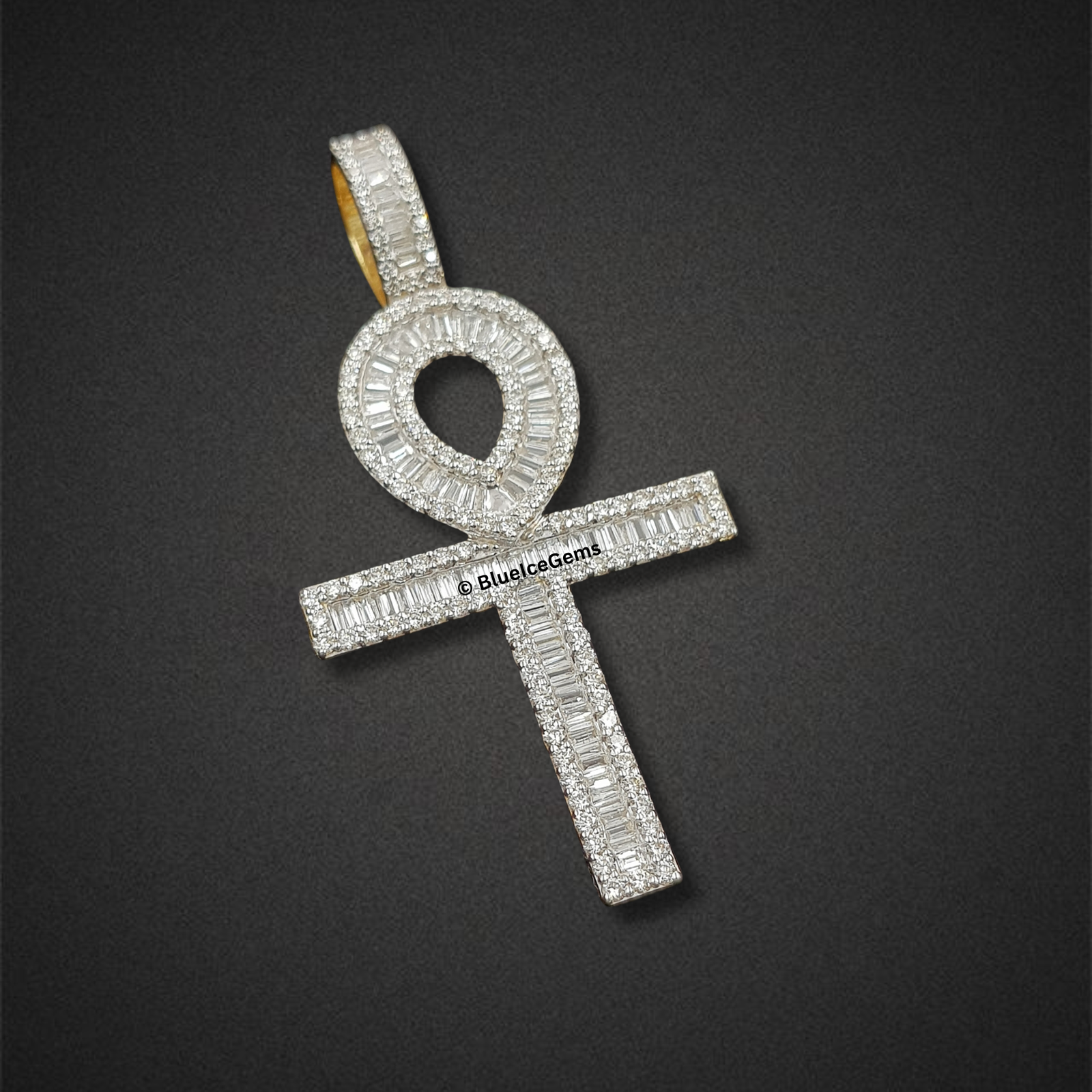 A magnificent Ankh pendant, symbolizing life and eternity, brilliantly adorned with pave and baguette diamonds, set in lustrous gold.