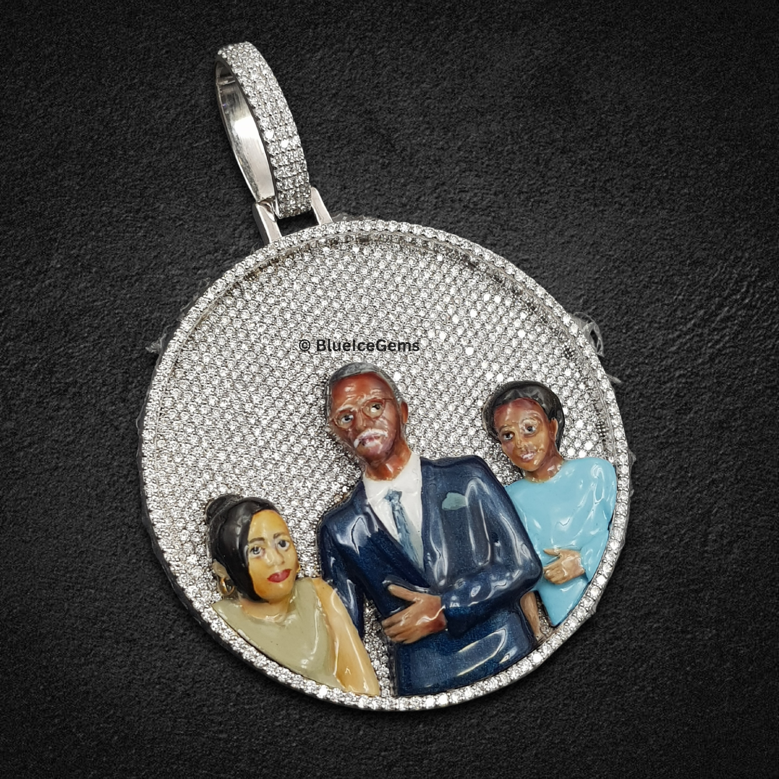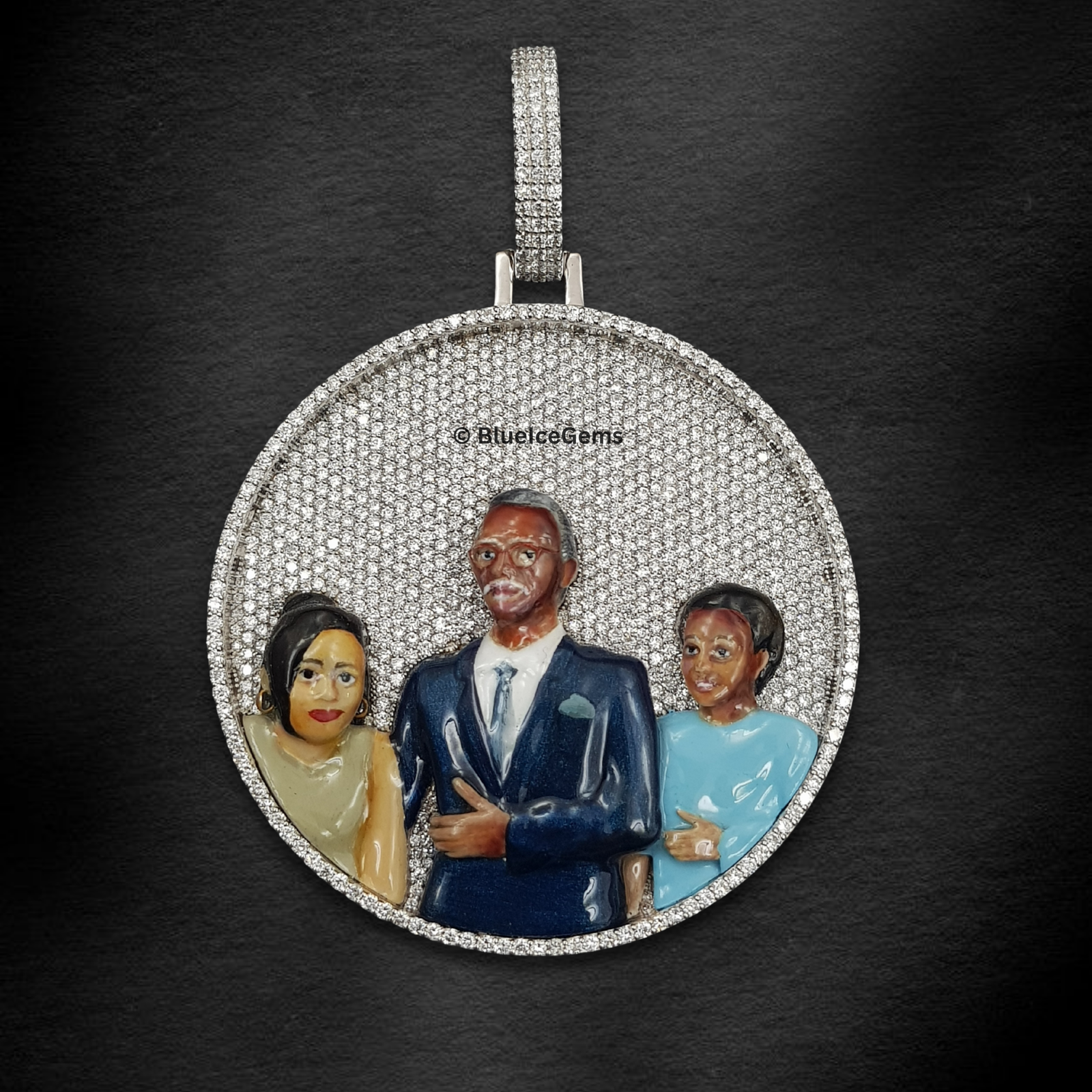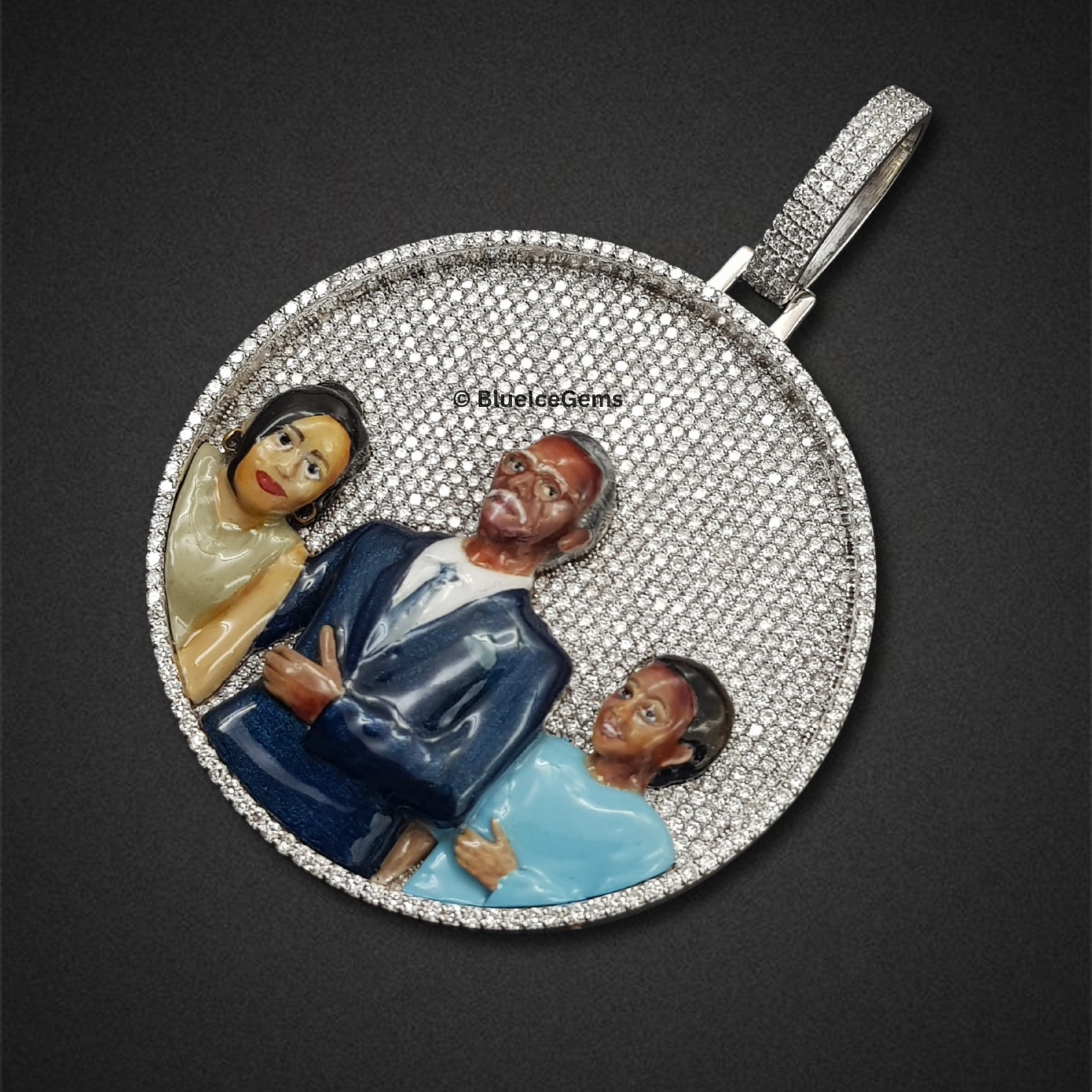 This magnificent circular medallion from BlueIceGems is a deeply personal tribute, designed to celebrate cherished bonds with unparalleled brilliance. At its heart, a meticulously rendered custom portrait of three vibrant figures is expertly set against an expansive backdrop of dazzling pave-set white diamonds, creating a continuous field of pure brilliance and captivating sparkle. Every diamond radiates light, enhancing the beauty of the portrait. The entire medallion is elegantly framed in gleaming, highly polished white gold, providing a sleek, modern aesthetic that perfectly complements the icy brilliance of the diamonds and the warmth of the personalized image. This isn’t just a piece of fine jewelry; it’s a powerful and profoundly personal statement piece, designed to hold your most treasured connections in breathtaking, enduring luxury.