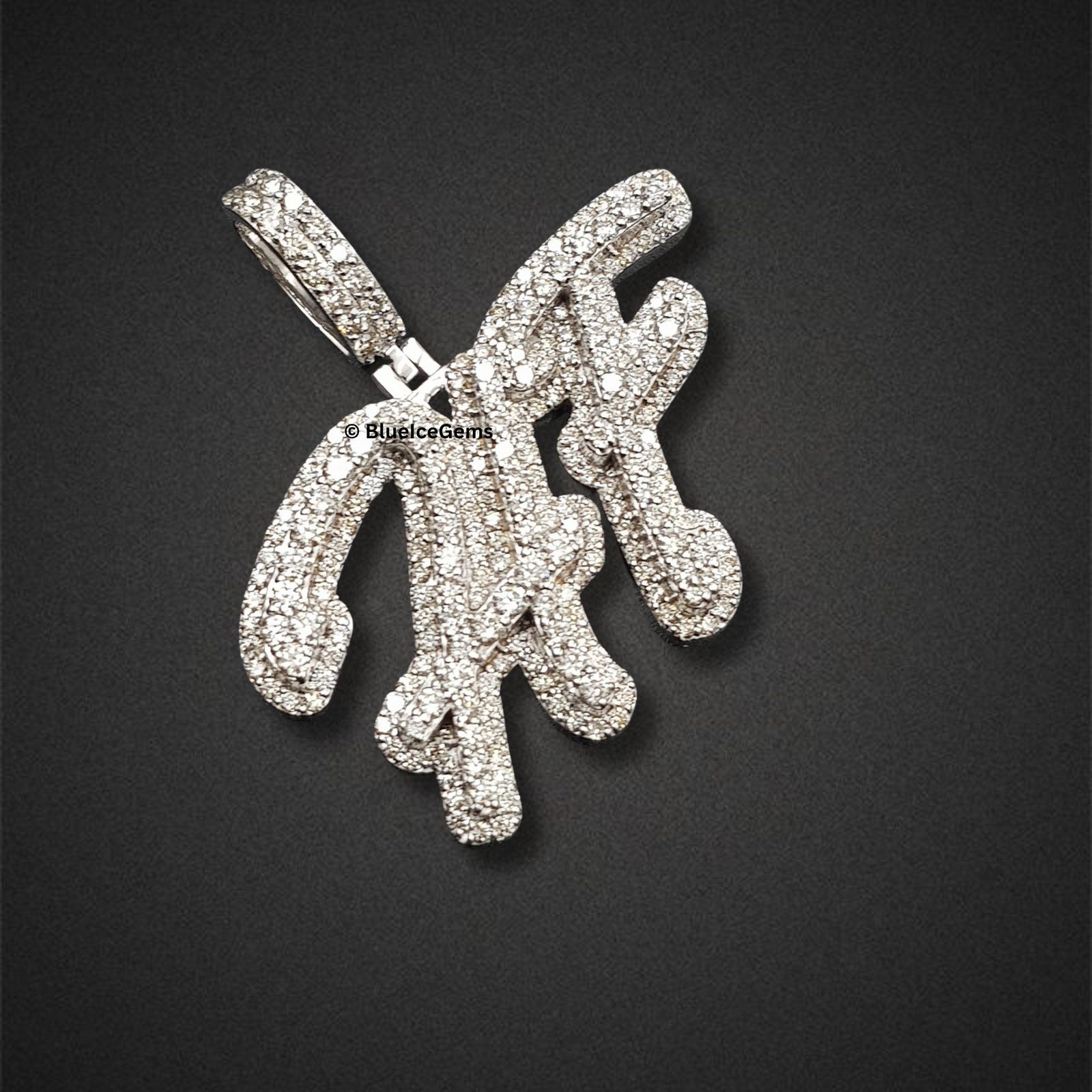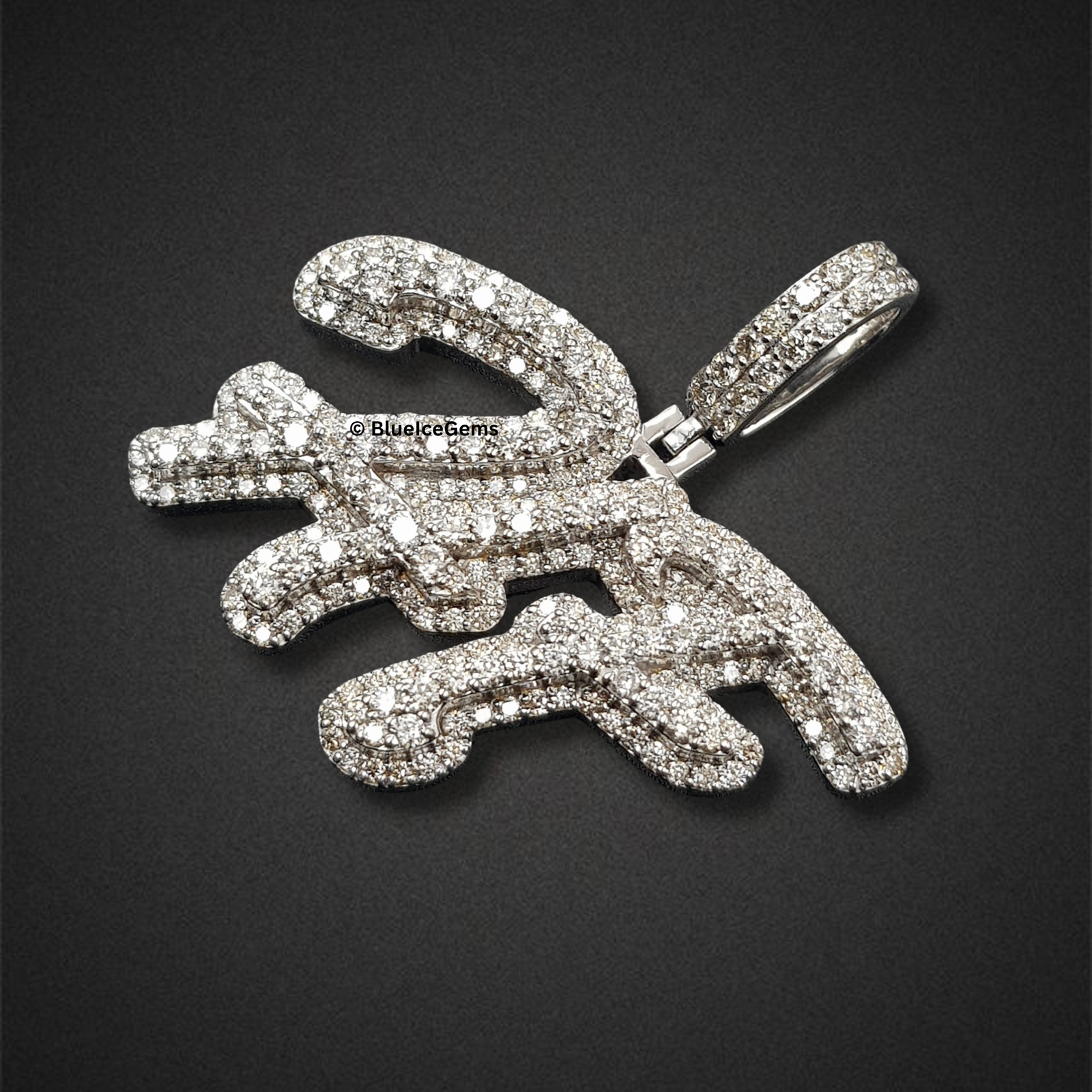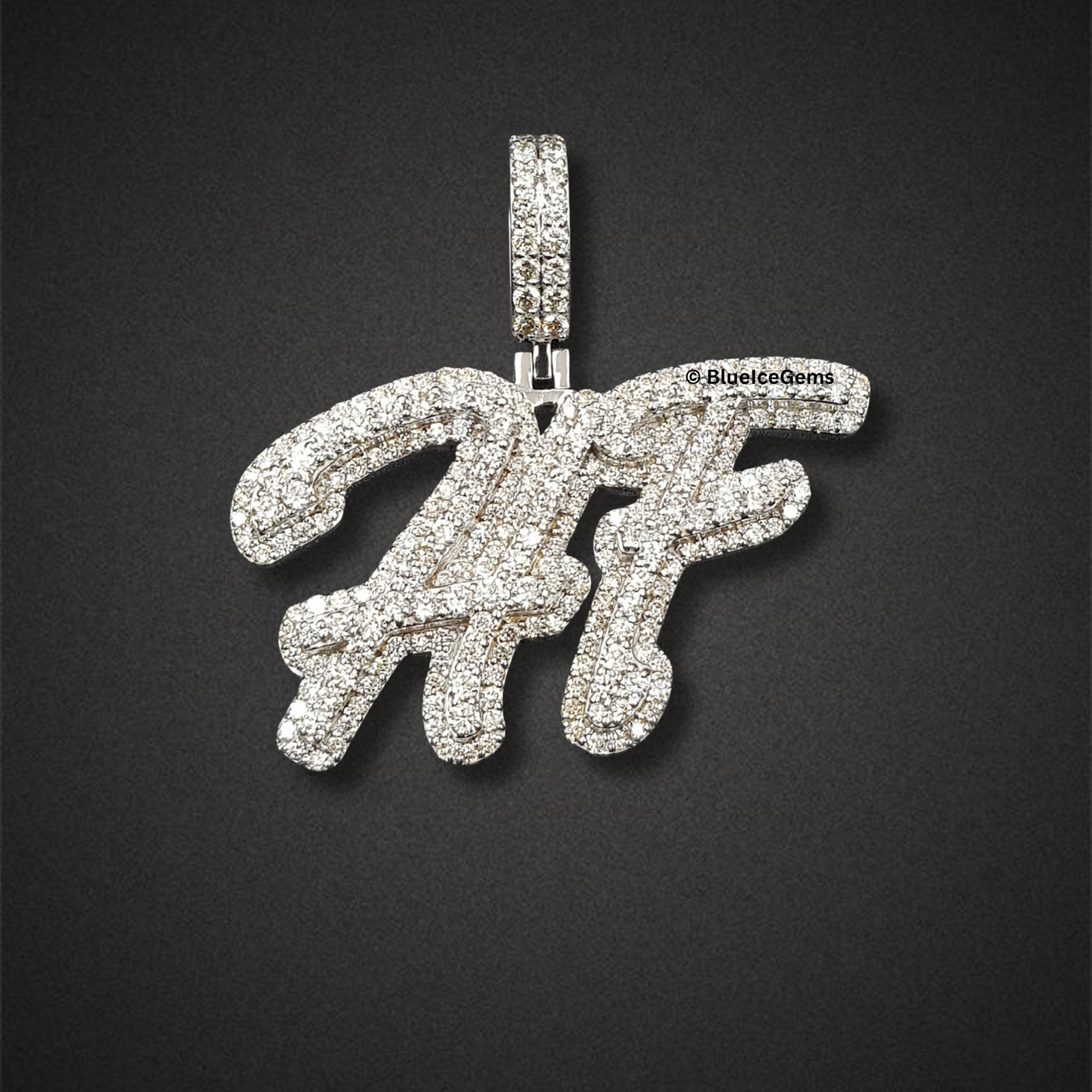 Make an unforgettable impression with the “FF” Pure Diamond Script Pendant—an opulent fusion of timeless craftsmanship and modern sophistication. Designed for those who embody elegance with edge, this striking pendant features the initials “FF” in a bold, flowing script that captures movement and grace in every stroke. The typography is not just visually arresting—it’s sculptural. Each curve and contour is encrusted with a breathtaking arrangement of brilliant-cut white diamonds, precisely pave-set to create a seamless field of radiant sparkle. This high-density diamond layout transforms the entire surface into a canvas of uninterrupted fire and brilliance, catching light with hypnotic intensity from every angle. More than a pendant, it’s a declaration of refined personal style. Whether you’re layering it for high-impact glamour or wearing it solo to let its brilliance speak for itself, the “FF” Script Pendant channels pure luxury with contemporary flair. Perfect for signature looks, editorial styling, or gifting moments that deserve unmatched sparkle.