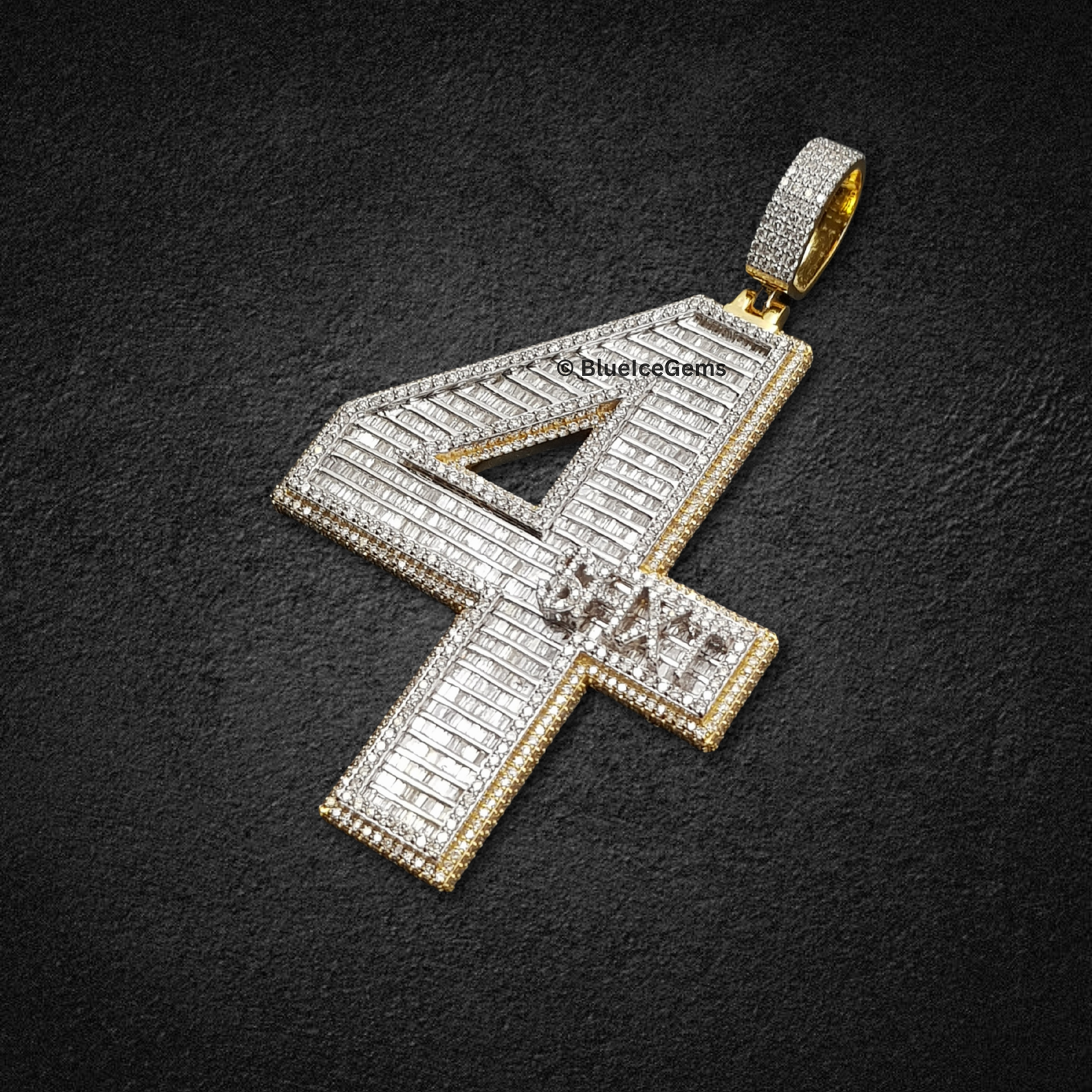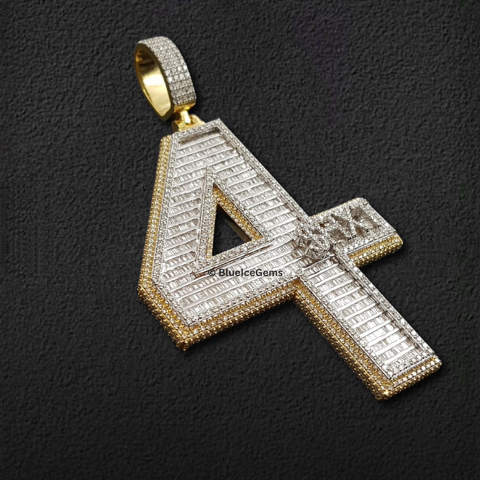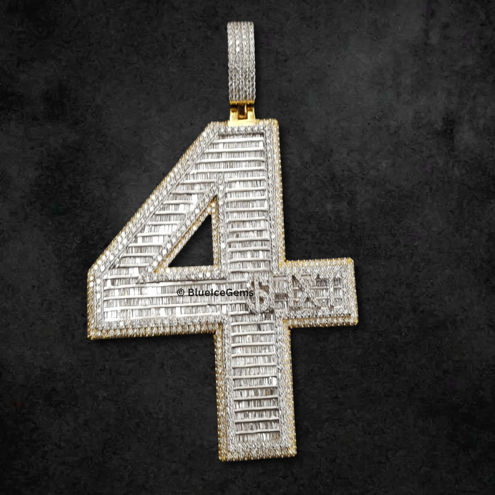 This monumental “4” pendant from BlueIceGems is a true masterpiece of diamond artistry and design. The bold numeral is entirely blanketed in an astonishing array of crisp baguette-cut diamonds, meticulously set to create striking linear brilliance and a modern, captivating sparkle. These captivating baguettes are seamlessly complemented by a surrounding border of brilliant pave diamonds, ensuring an unbroken surface of pure fire and unparalleled scintillation that radiates light from every angle. Crafted in gleaming, highly polished white gold, its robust, three-dimensional form offers a powerful presence. It’s elegantly outlined by rich, luxurious yellow gold, providing a dynamic visual contrast that dramatically enhances the diamonds’ icy brilliance. This piece is more than just jewelry; it’s a powerful and audacious statement, exuding uncompromised luxury and a distinctive style that truly commands attention.