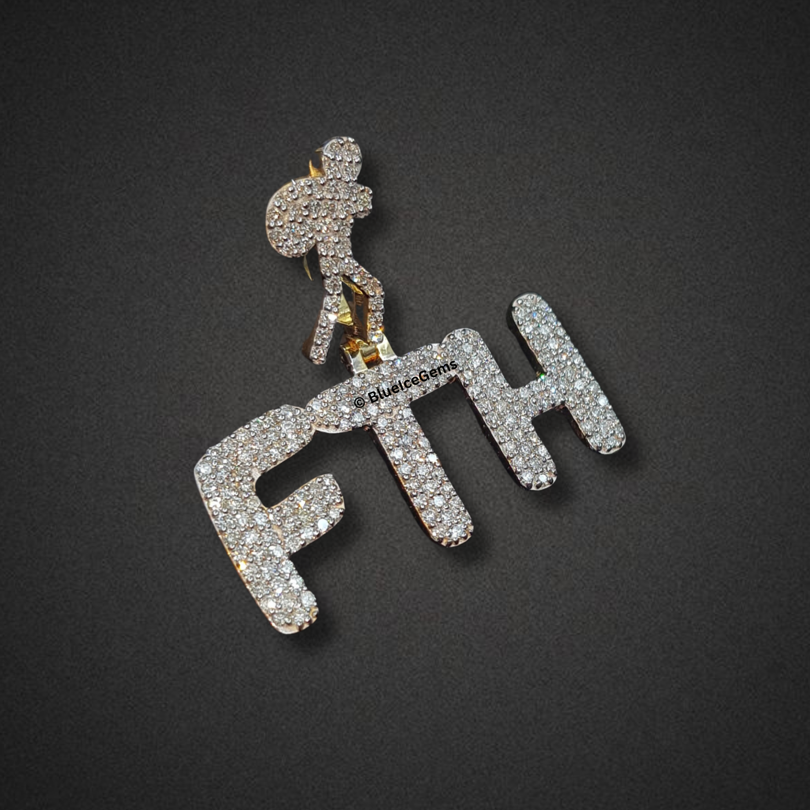 Declare your unwavering determination with The “FTH Summit” Diamond Pendant, a truly inspiring and brilliantly crafted piece designed to symbolize ambition and achievement. This impressive custom pendant features the bold initials “FTH” in a robust, three-dimensional form, meticulously pave-set with an astonishing array of brilliant white diamonds. The sheer density of diamonds creates an unbroken surface of pure fire and scintillation, ensuring it captures and reflects light with unparalleled brilliance from every angle. The letters are strikingly outlined and backed by rich, gleaming yellow gold, providing a stunning contrast that enhances the depth and grandeur of the design. Crowning this luxurious piece is a meticulously detailed, diamond-studded figure of a climber, symbolizing the ascent to success. This powerful emblem, poised atop the initials, makes the pendant more than just jewelry; it’s a testament to perseverance and aspirational style.