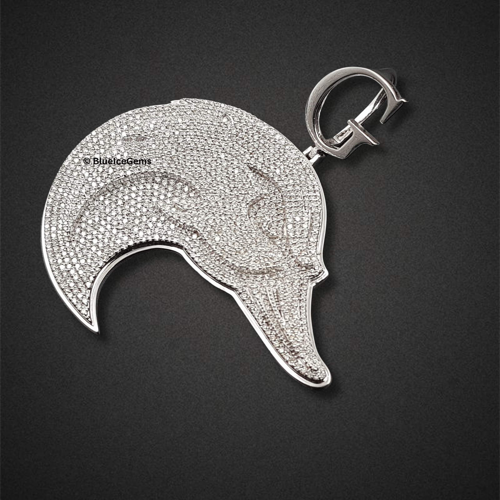 Make a unique and bold statement with The “G-Duck” Diamond Medallion, a truly captivating piece that combines distinctive imagery with opulent brilliance from BlueIceGems. This substantial pendant features the striking profile of a duck’s head, meticulously crafted and entirely blanketed from beak to neck in an astonishing array of pave-set brilliant-cut white diamonds. The sheer density of diamonds creates an unbroken field of dazzling light, ensuring the pendant catches and reflects every glint with unparalleled fire and scintillation. This isn’t just a medallion; it’s a powerful and luxurious emblem, designed to showcase your individual style with uncompromised brilliance and audacious charm.