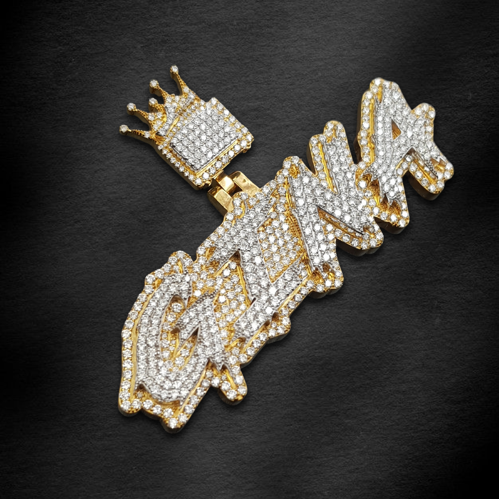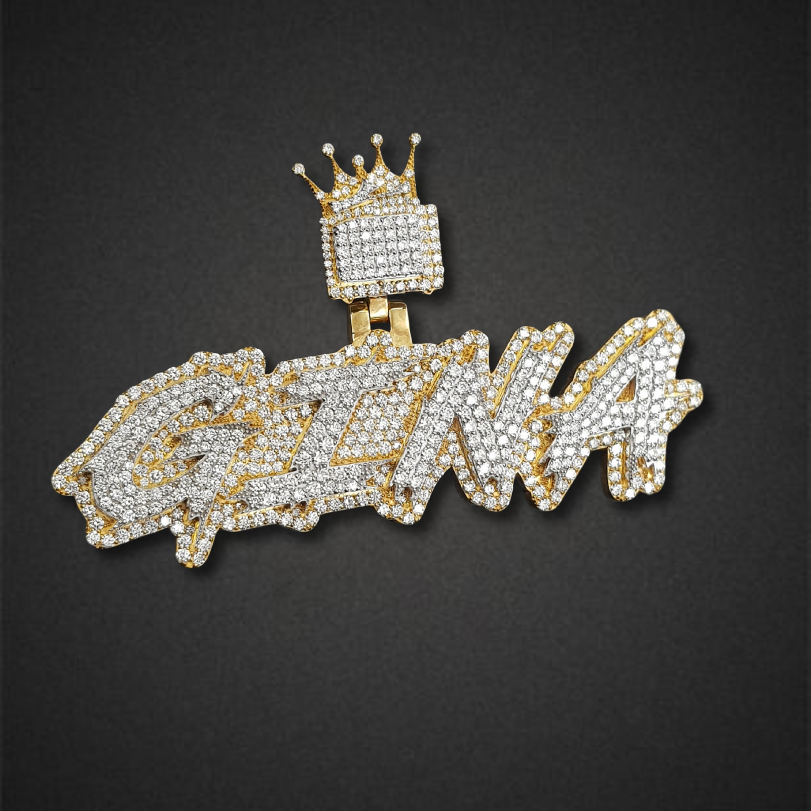 Declare your royal presence and make a truly majestic statement with this exceptional “GING” script pendant, an exclusive creation from BlueIceGems. This piece is meticulously pave-set with dazzling, brilliant white diamonds, ensuring every elegant curve shimmers with an unbroken cascade of pure fire and unparalleled scintillation that radiates captivating light from every angle. The commanding form of the word “KING” is elegantly outlined in warm, luxurious yellow gold, providing a striking contrast that dramatically enhances the diamonds’ icy brilliance and adds to its opulent appeal. To further amplify its profound symbolism, a miniature, precisely detailed, fully diamond-studded crown sits triumphantly atop the pendant, unequivocally symbolizing power, prestige, and unparalleled luxury. This isn’t just a piece of fine jewelry; it’s a truly commanding statement, embodying your reign and unyielding presence with dazzling brilliance.