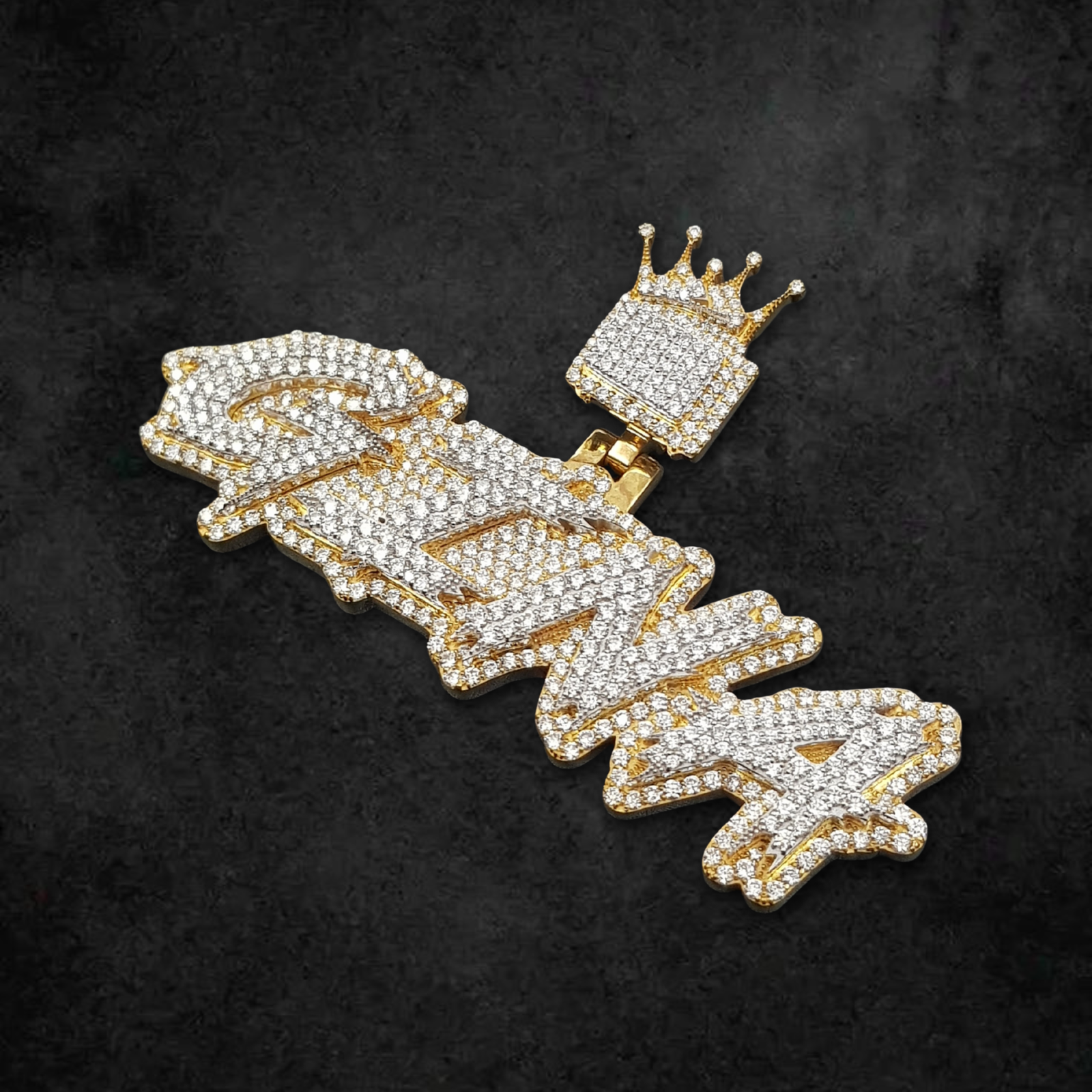 A dazzling “KING” pendant, fully iced out with sparkling diamonds, framed in yellow gold, and crowned with a brilliant diamond diadem, for a regal and bold statement piece.