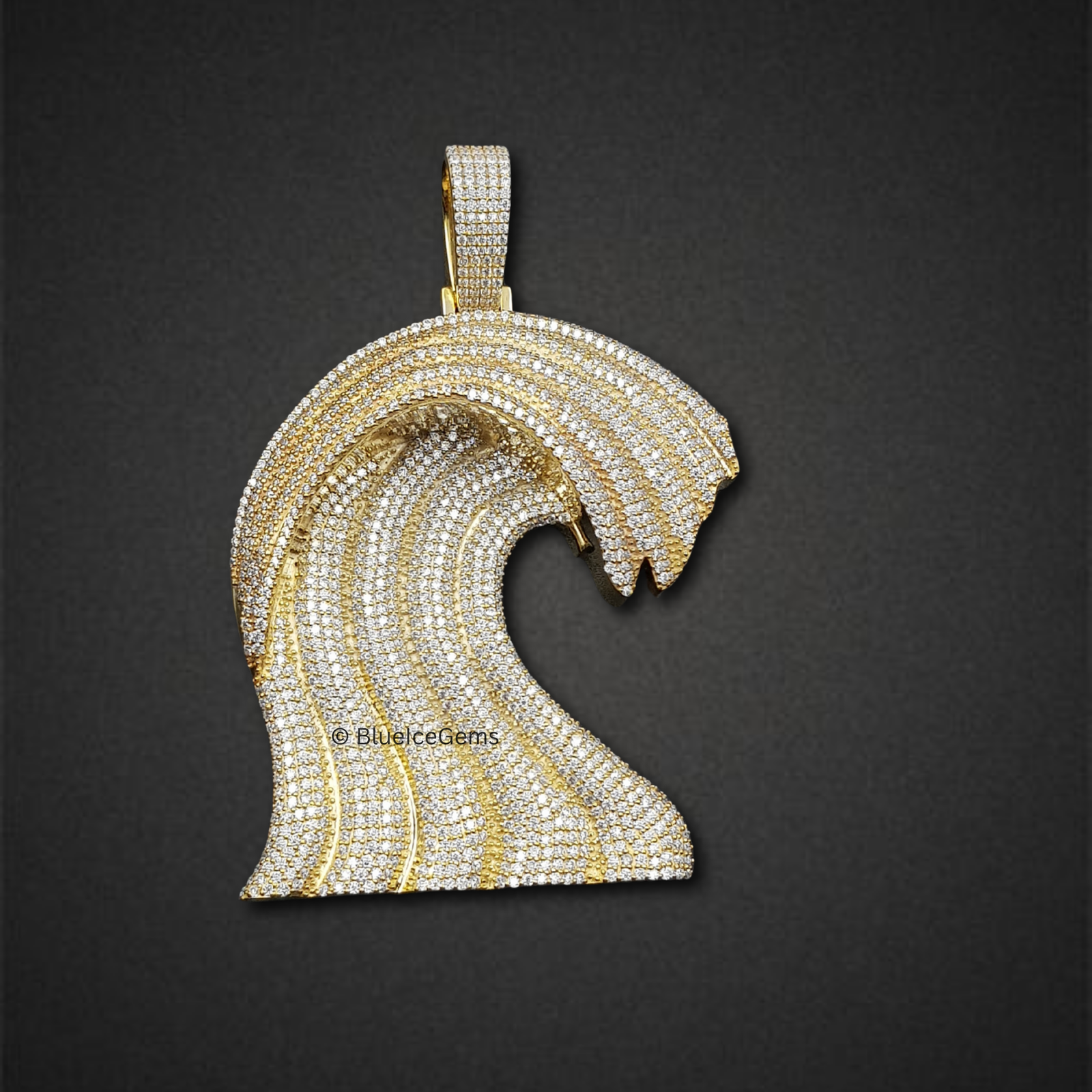 Ride the currents of luxury with The “Golden Wave” Diamond Pendant, an exceptionally dynamic and captivating piece that beautifully merges natural power with dazzling artistry. This substantial pendant is expertly sculpted into a powerful, rolling wave, meticulously blanketed across its entire surface with an astonishing array of brilliant-cut pave diamonds. The individual rows of diamonds elegantly follow the curves of the wave, creating an illusion of fluid motion and maximizing light reflection, resulting in an unparalleled cascade of sparkle. Each diamond is set to ensure breathtaking fire and scintillation, making this piece shimmer with life from every angle. This isn’t just a pendant; it’s a luxurious embodiment of strength and beauty, designed to make a radiant statement.