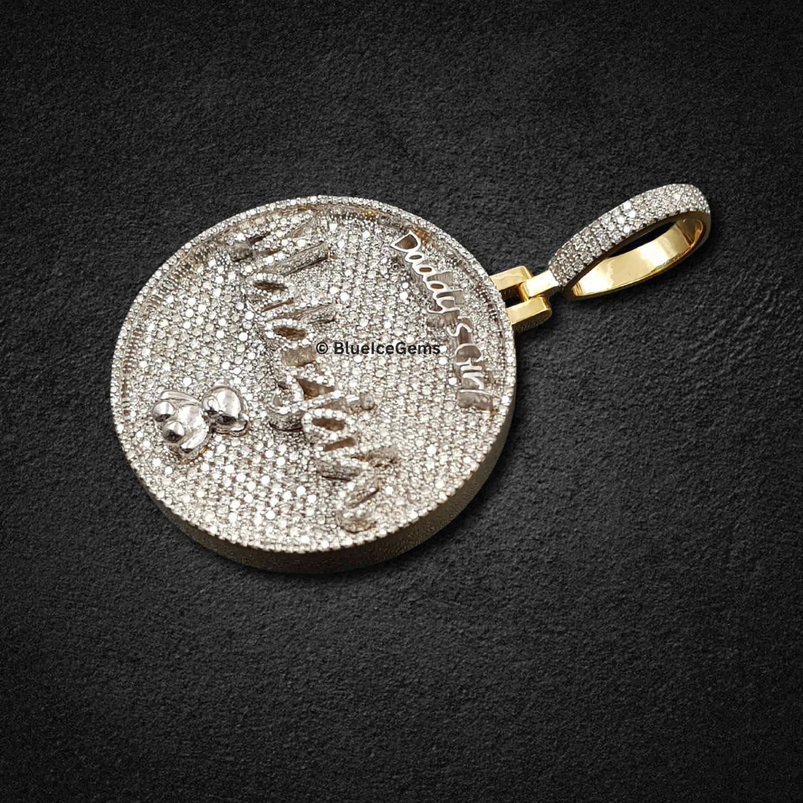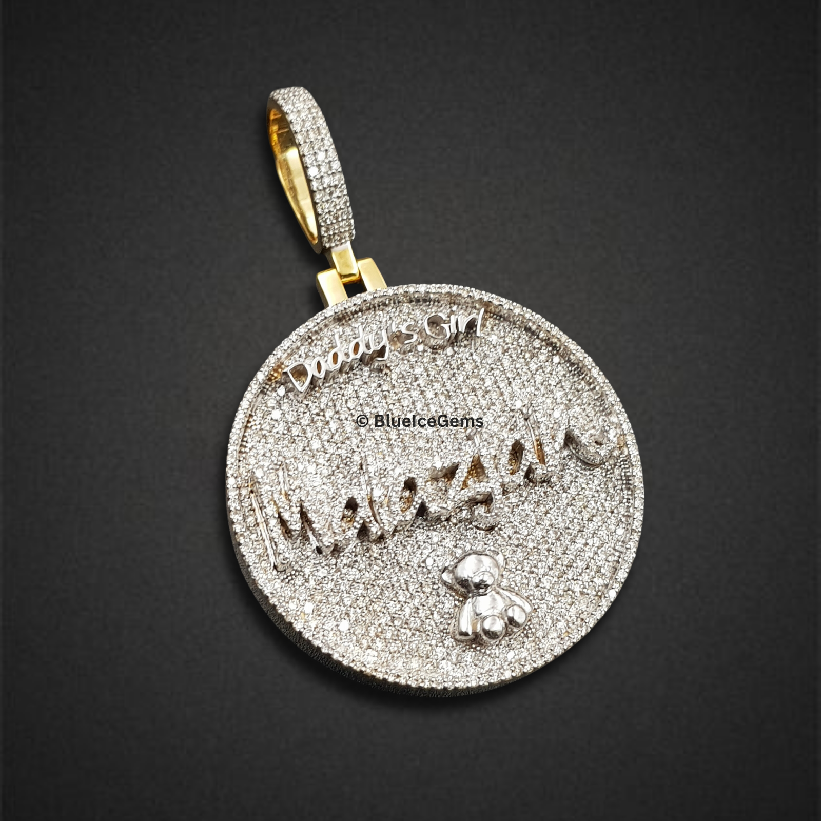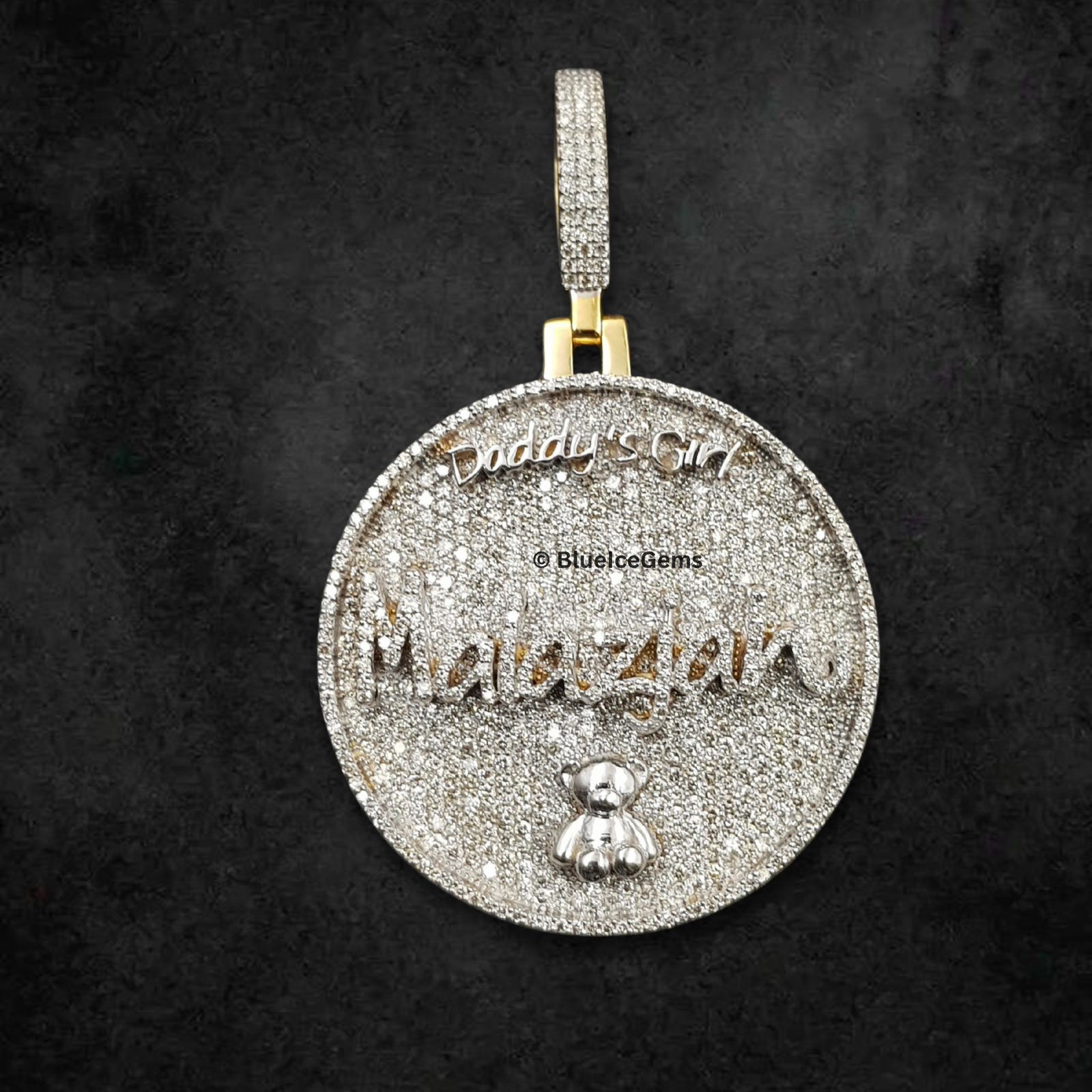 This magnificent circular medallion from BlueIceGems is an absolute cascade of light, meticulously designed to radiate brilliance and profound personal meaning. It’s entirely and artfully blanketed in brilliant pave diamonds, with each gem precisely set to create an unbroken, shimmering surface of pure fire and unparalleled scintillation that captures every eye. At its heart, the elegant scripts “Maliyah” and “Good Girl” are beautifully featured, alongside a charming teddy bear emblem, all meticulously crafted in shimmering white gold to stand out against the icy diamond backdrop. This thoughtful combination creates a deeply personal narrative. The entire design is gracefully framed in warm, radiant yellow gold, providing a rich contrast that enhances the diamonds’ icy sparkle and deepens the medallion’s opulent appeal. This isn’t just a piece of fine jewelry; it’s a deeply personal and luxurious statement piece, designed for those who wear their cherished connections and unique story with uncompromised brilliance.