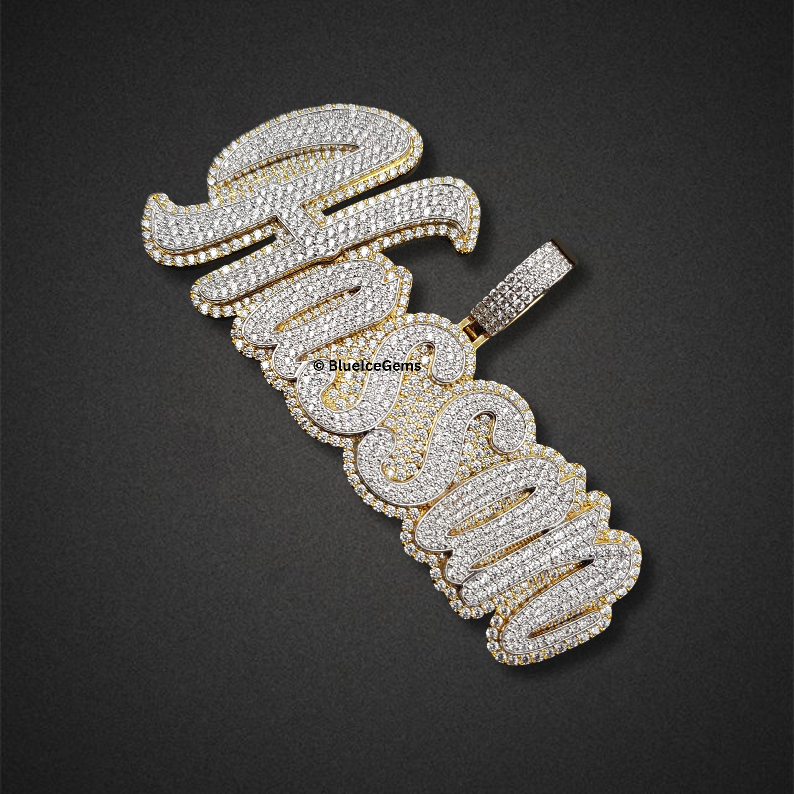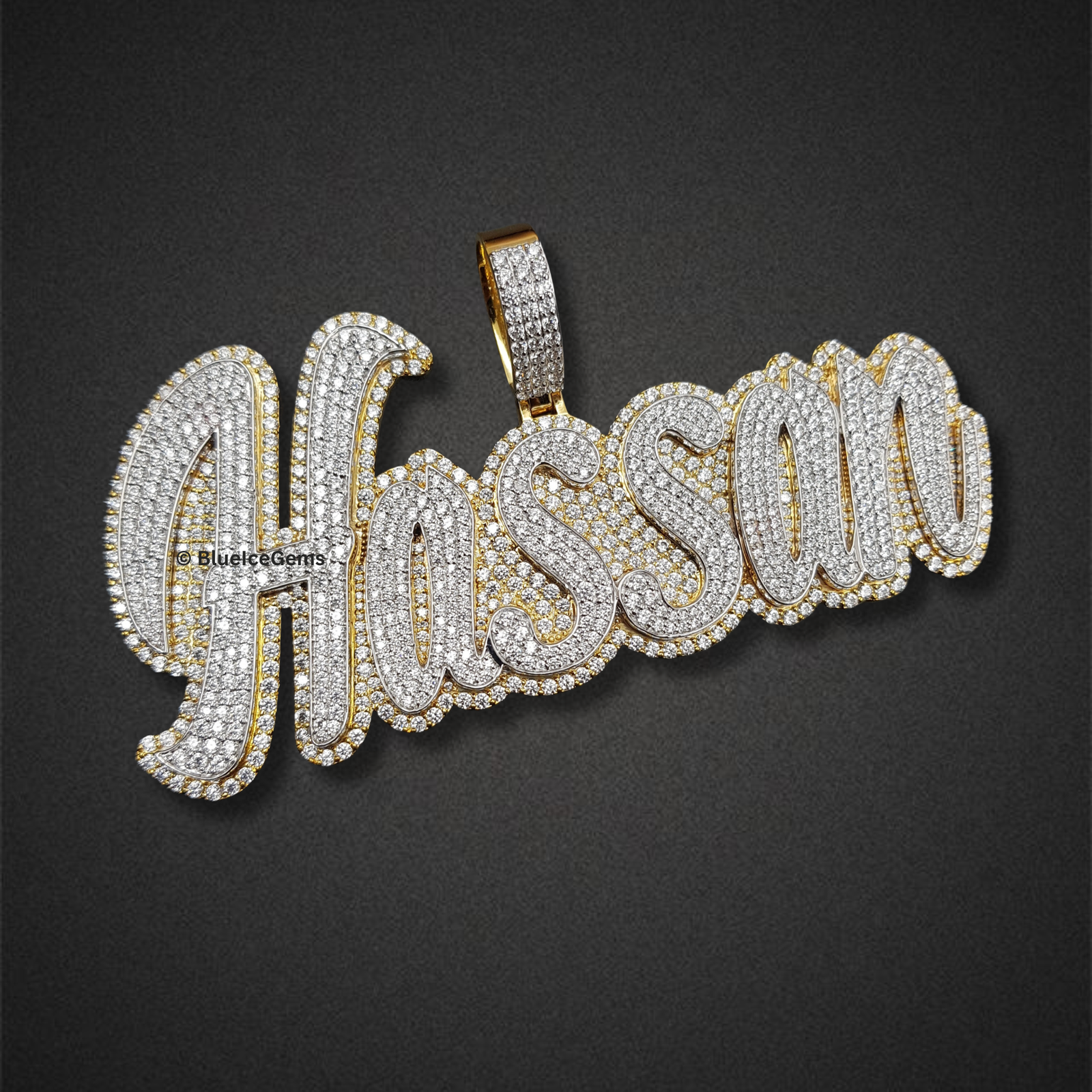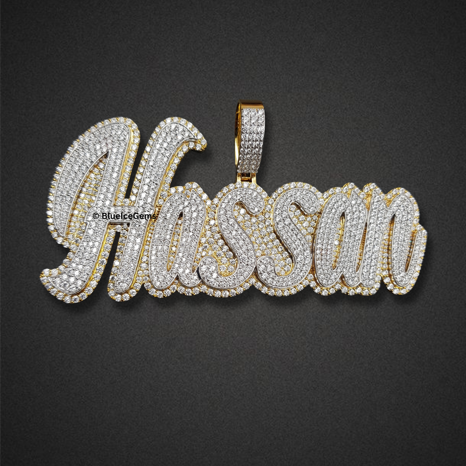 Make a lasting impression with the “Hassan” Diamond Signature Pendant—an extraordinary fusion of elegance, identity, and unapologetic brilliance. Custom-crafted to embody grandeur and personal distinction, this commanding pendant spells out “Hassan” in a fluid, bold cursive script that flows with authority and refinement. Each curve of the name is meticulously paved with a high-density array of brilliant-cut white diamonds, hand-set to form a continuous surface of radiant sparkle. The diamond composition ensures seamless light reflection across every contour, turning simple movement into a mesmerizing display of fire and scintillation. The cursive typography adds sophistication and a sense of legacy, making the pendant both stylish and deeply meaningful. Whether styled for iconic layering or showcased solo to let its brilliance speak volumes, the “Hassan” Pendant elevates personalization to art. It’s the ideal centerpiece for collectors of bespoke luxury, milestone gifting, or those who wear their name with pride and panache.