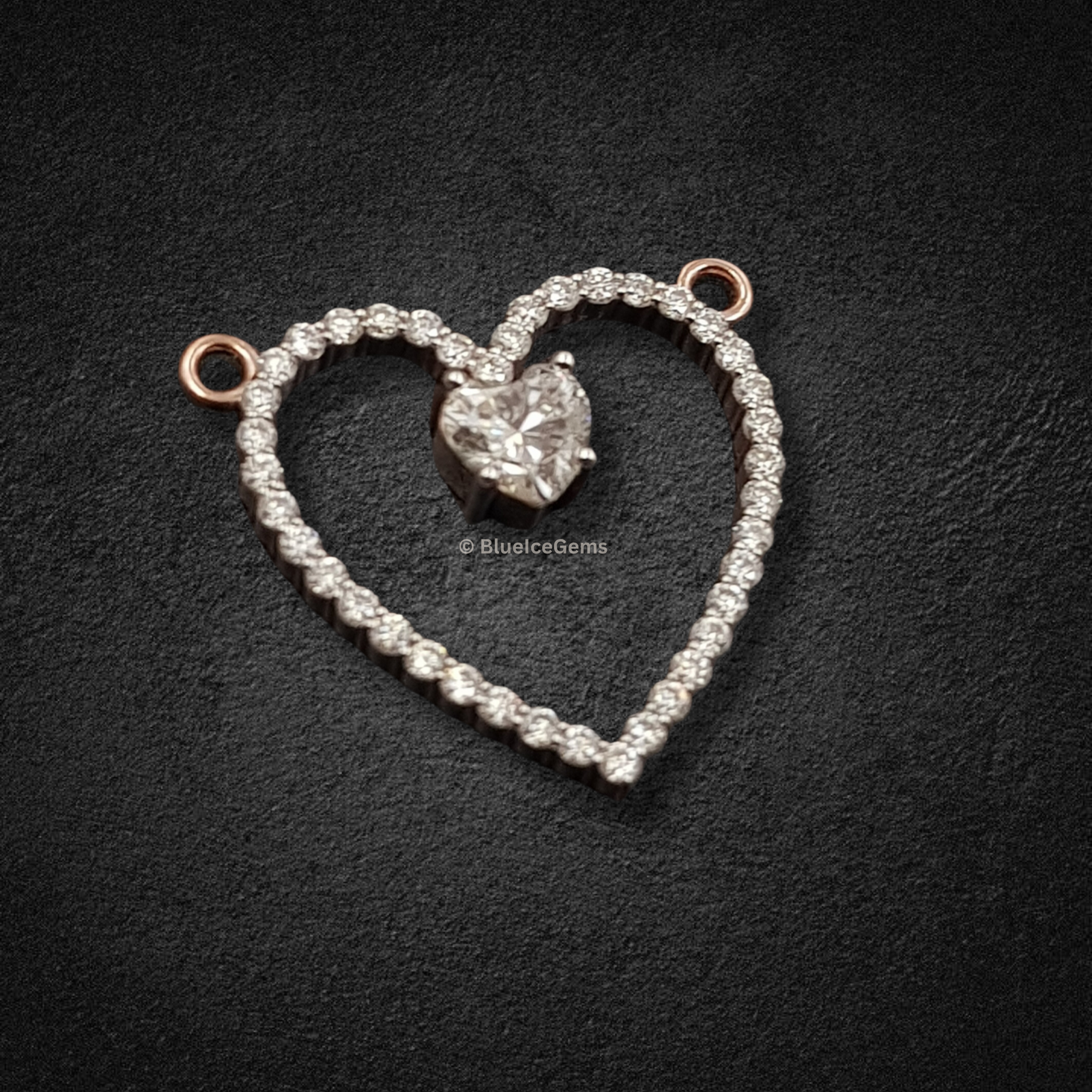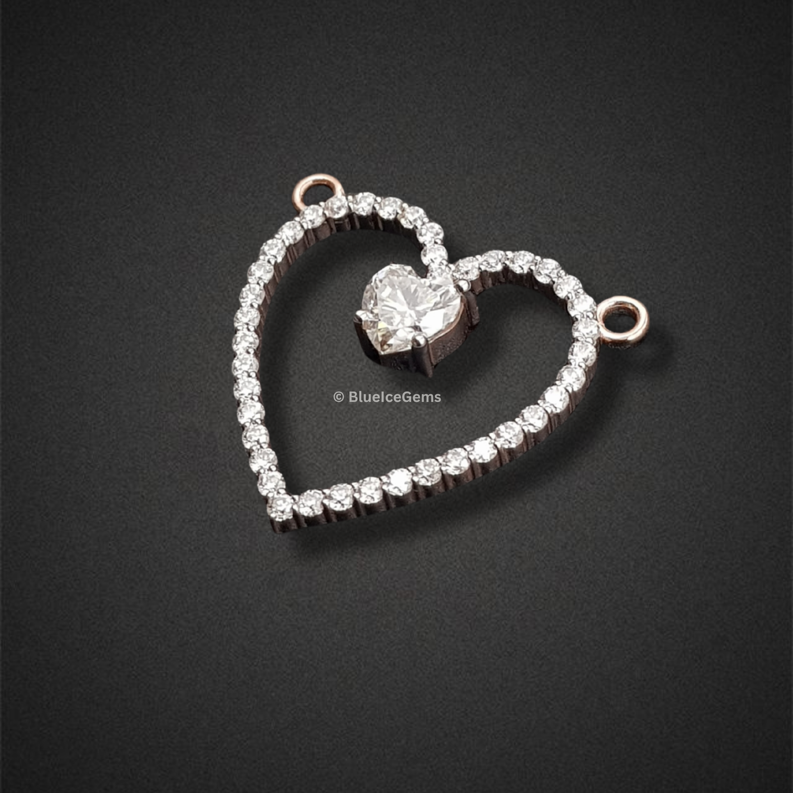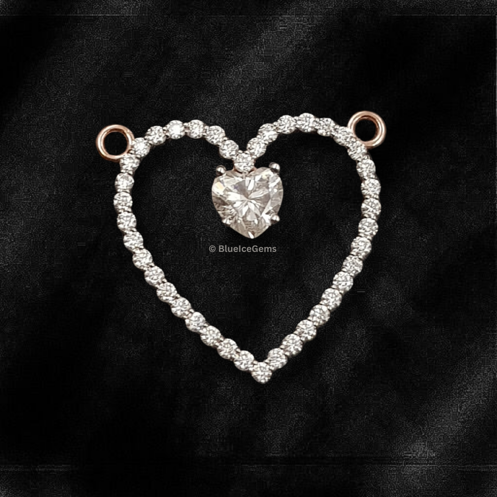 An exquisite open-heart pendant, pave-set with brilliant diamonds, cradling a captivating heart-shaped solitaire diamond at its center, with subtle rose gold accents.