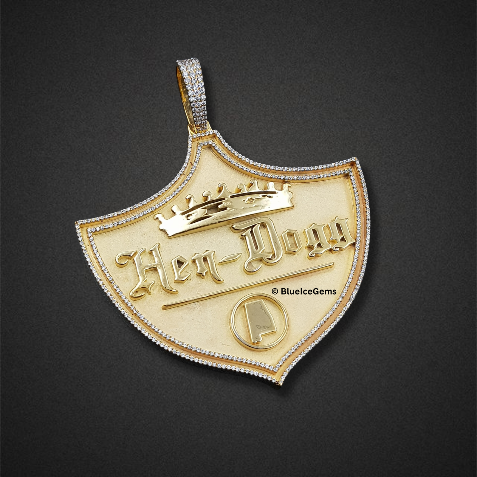 A majestic shield-shaped gold pendant, adorned with outer diamond borders, featuring “Hen-Dog” in script, a crowning diadem, and a custom state outline.
