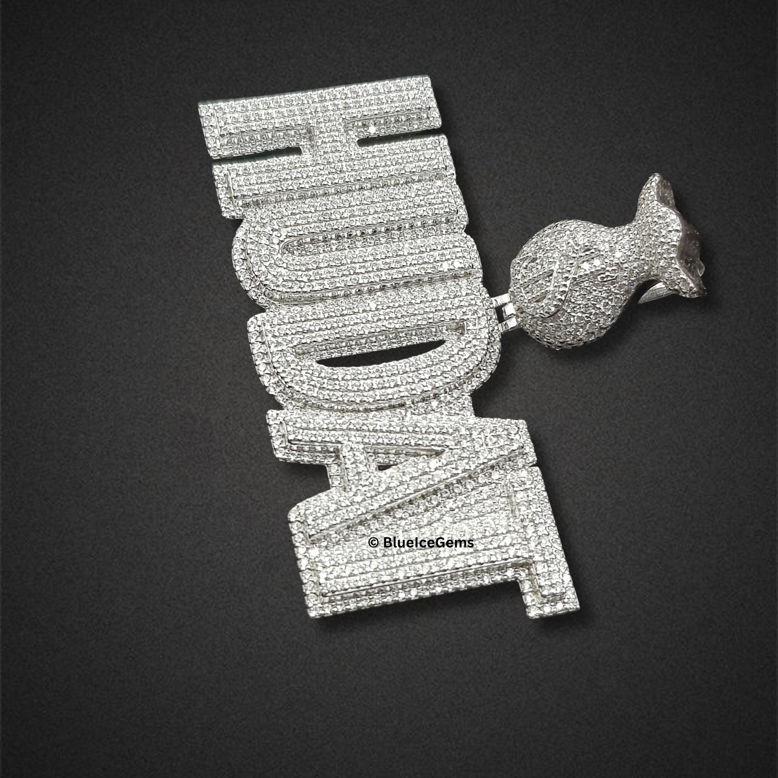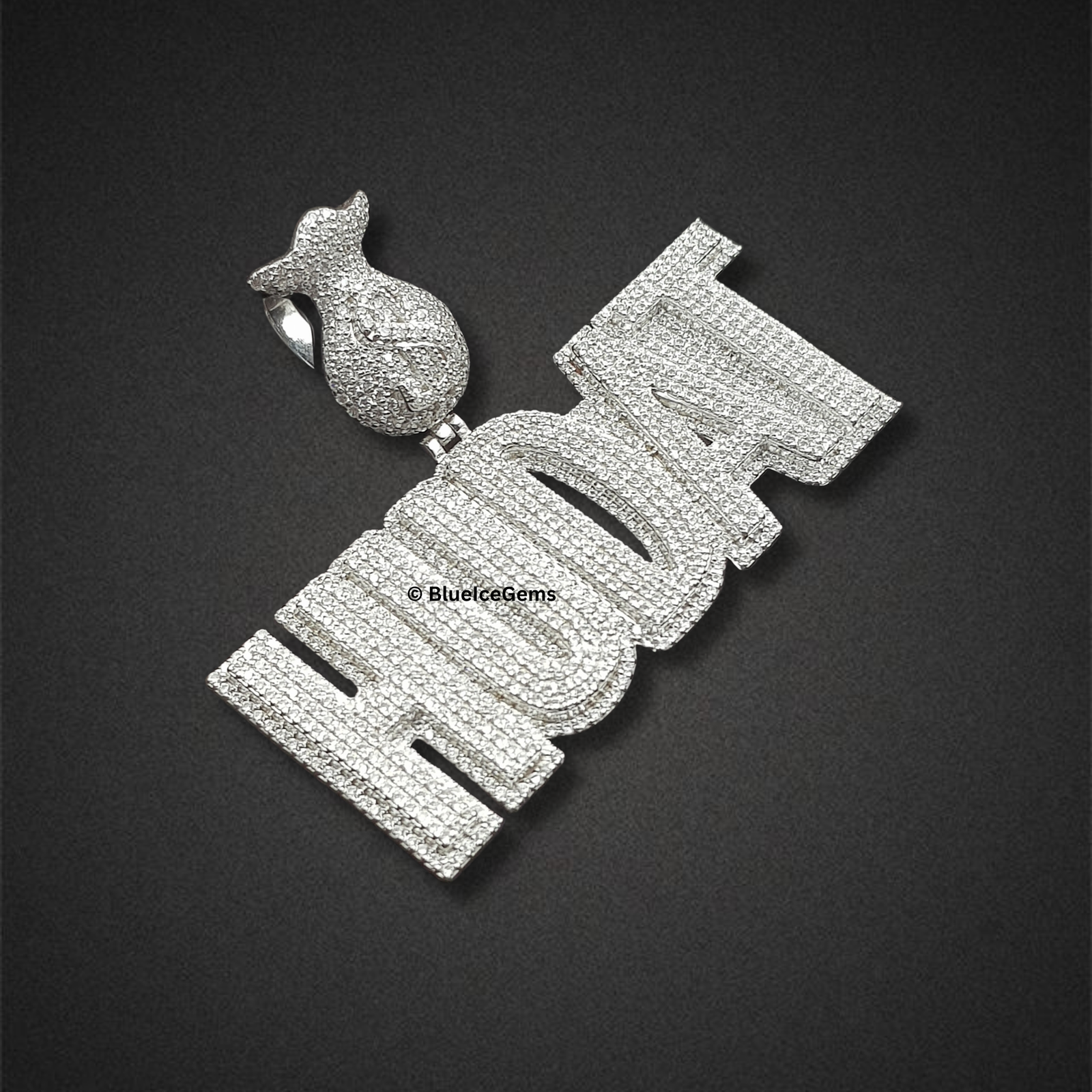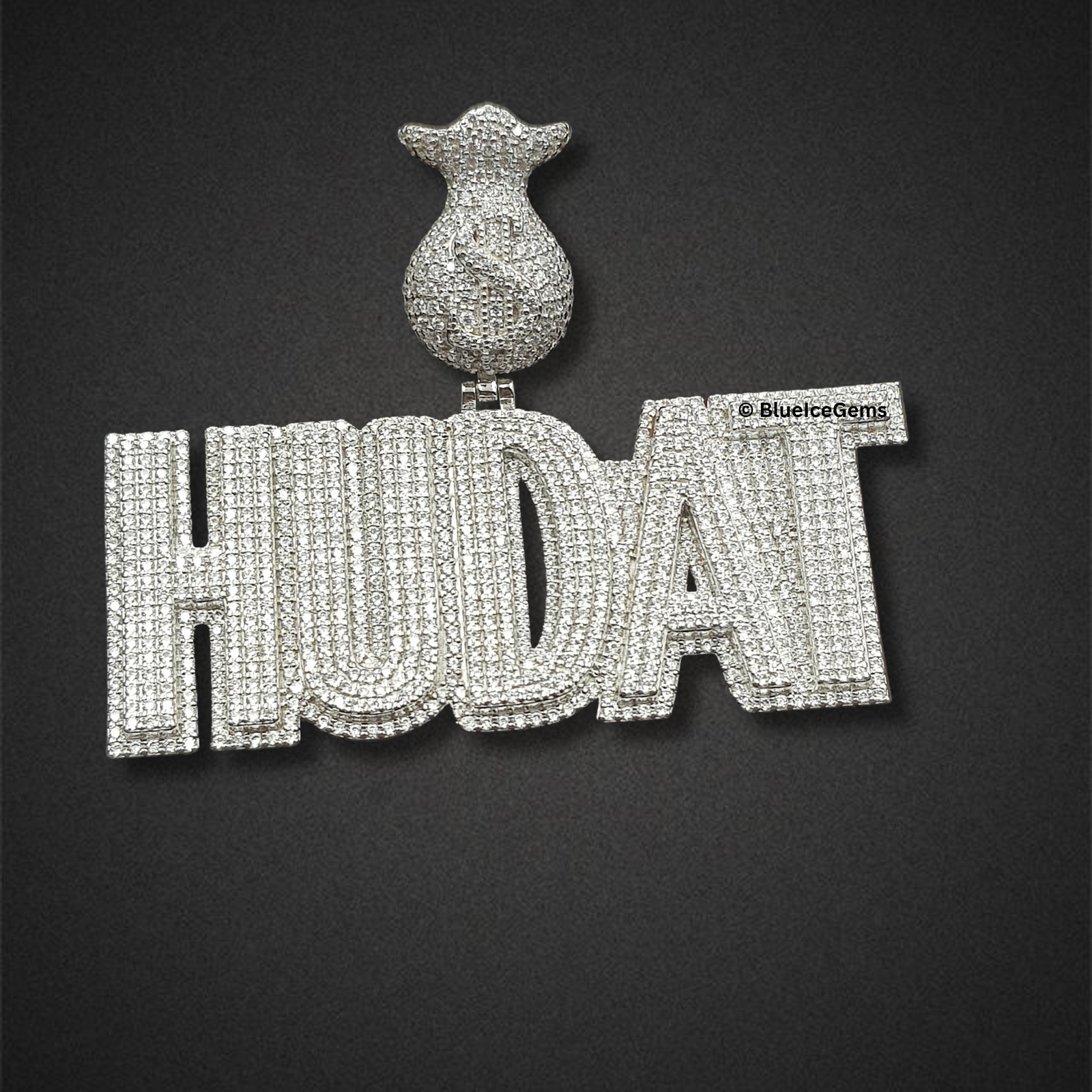 A commanding “HUDAT” name pendant, entirely pave-set with dazzling white diamonds, crowned with a brilliant diamond-studded money bag bail.