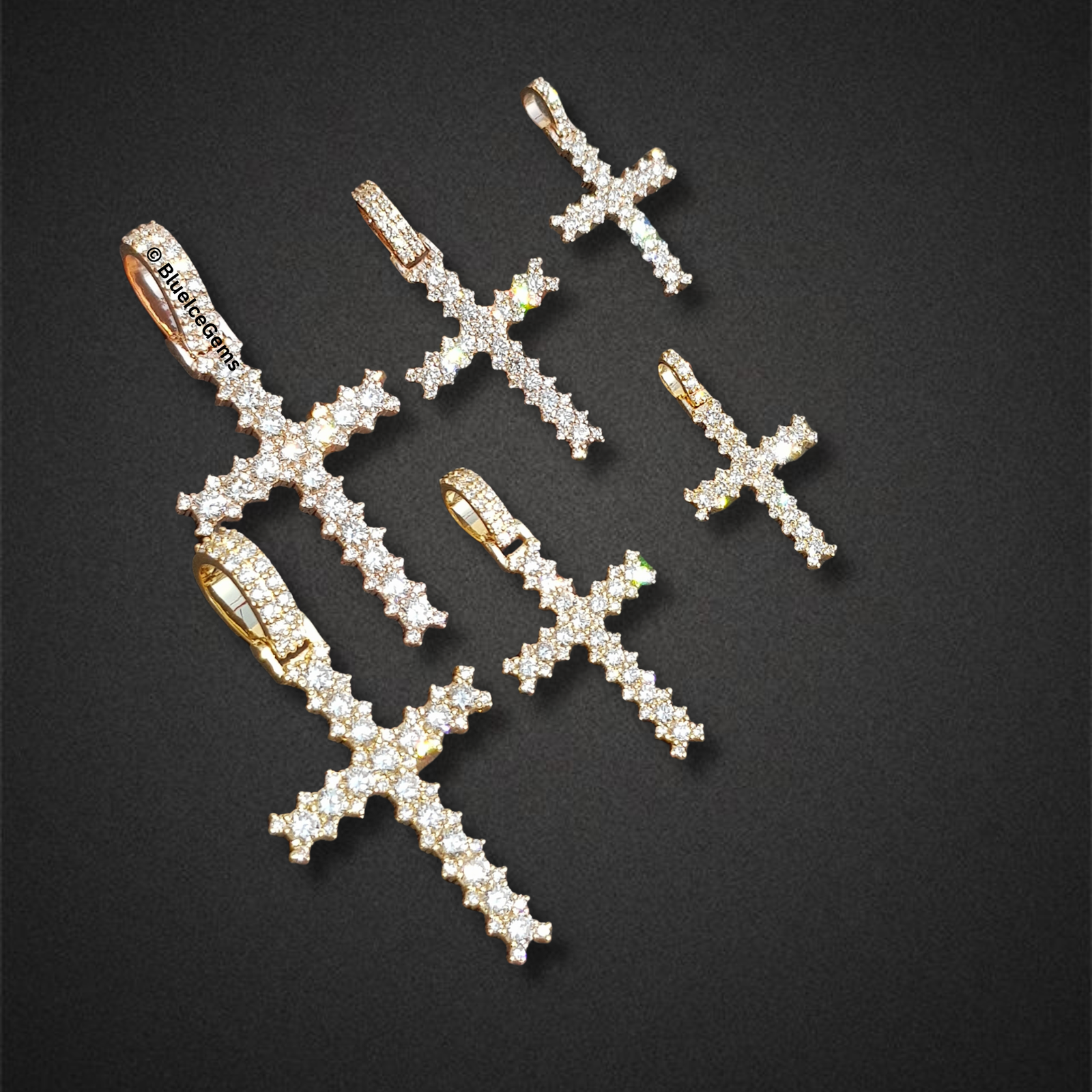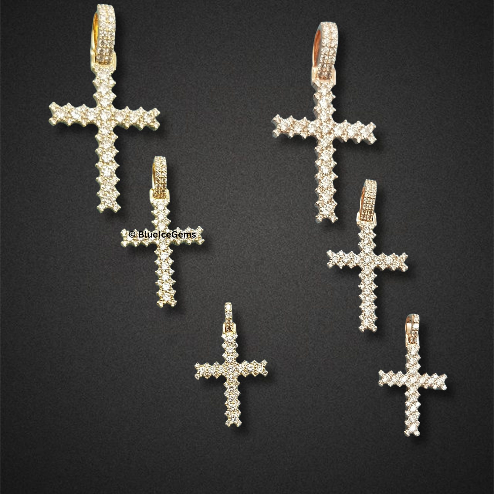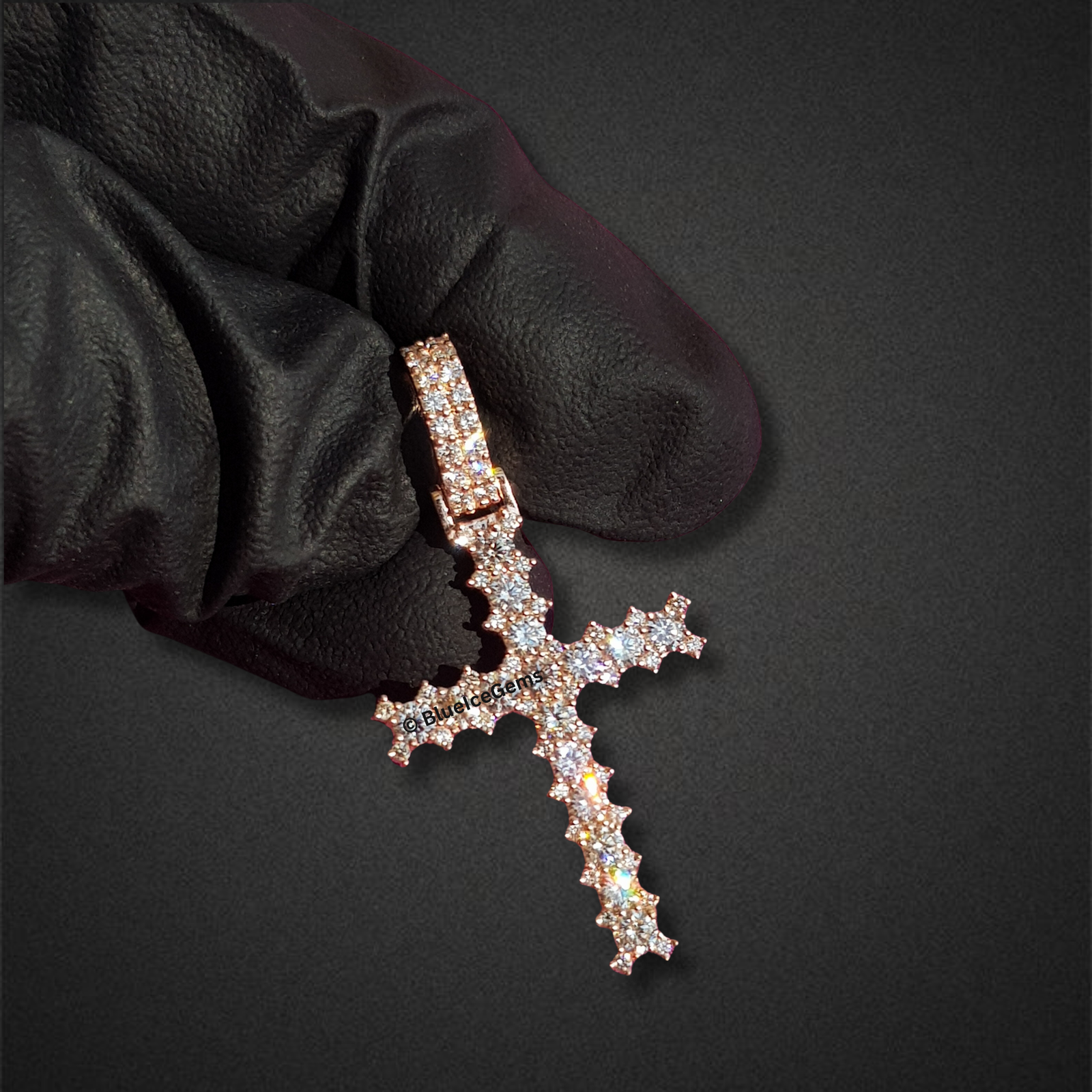 Embrace profound faith with an edgy twist in The "Ice Thorn" Diamond Cross Pendant, a captivating piece that redefines traditional symbolism with modern brilliance. This stunning cross features a unique, jagged or "thorn-like" outline, meticulously pave-set with an astonishing array of brilliant-cut diamonds that capture and reflect light from every angle, creating an uninterrupted surface of pure fire and scintillation. Crafted in warm rose gold, the metal beautifully complements the icy sparkle of the diamonds, adding a rich, sophisticated glow to its daring design. The robust, diamond-studded bail ensures a secure and prominent display on your chosen chain. This pendant is more than just a piece of jewelry; it's a powerful emblem of spiritual conviction, resilience, and uncompromised luxury, perfect for those who appreciate meaningful design with a bold, contemporary aesthetic.