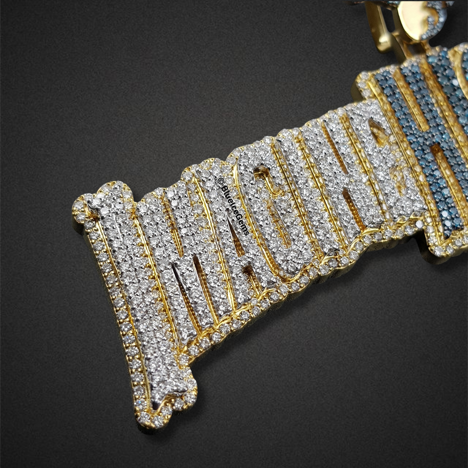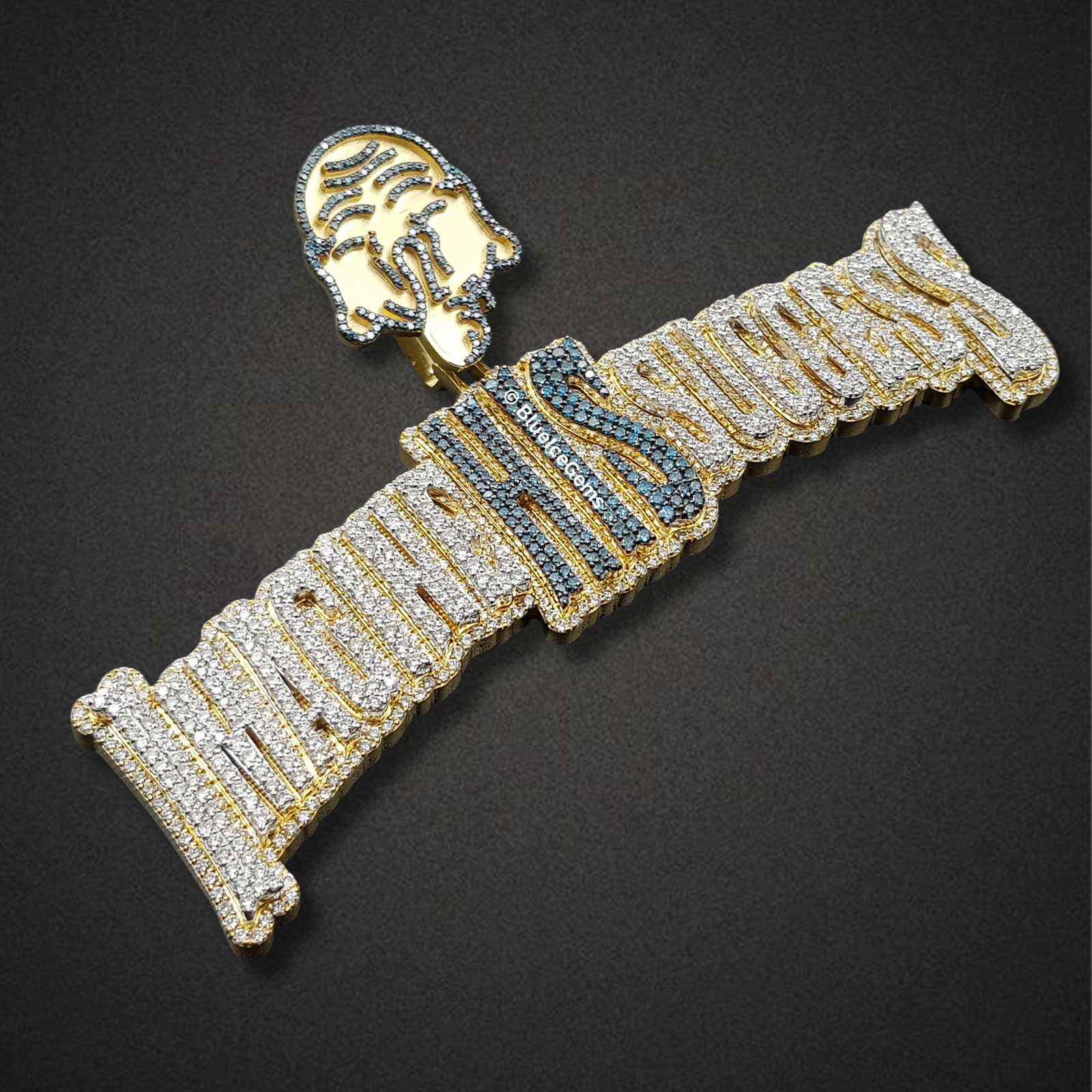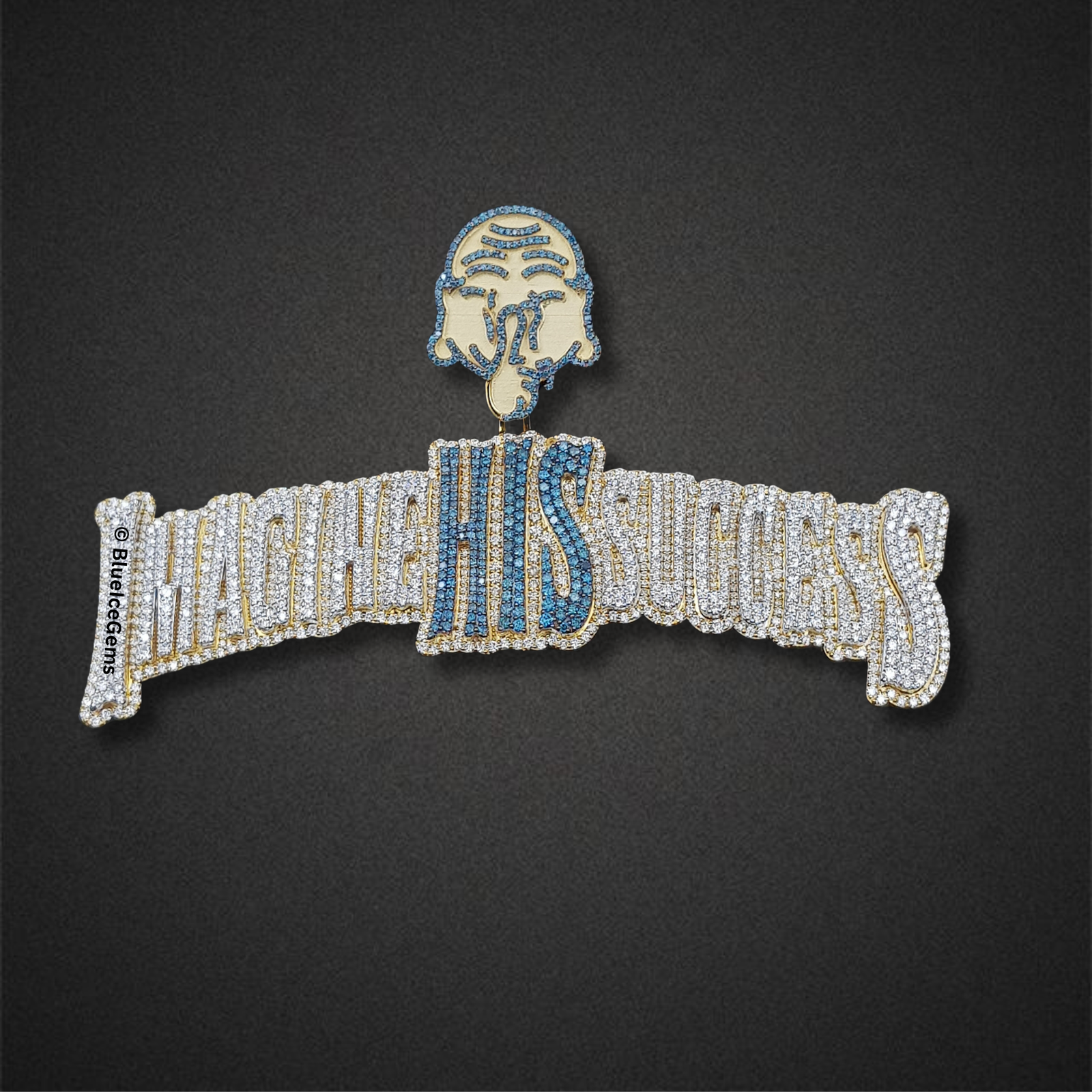 Make an undeniably audacious and horizontally impactful statement with this extraordinary “IMAGINE HIS SUCCESS” pendant, a truly unique piece from BlueIceGems. This magnificent creation is lavishly and meticulously pave-set with brilliant white diamonds, ensuring a breathtaking cascade of pure fire and unparalleled scintillation that captures every discerning eye. The bold message is further amplified by a sophisticated framing of rich, warm yellow gold, which beautifully enhances the overall opulence. For a truly striking contrast and powerful emphasis, the word “HIS” is uniquely spelled out in vibrant, deep blue diamonds, adding a layer of captivating depth and meaning. Adding to its distinctiveness, this pendant is uniquely crowned by a meticulously detailed, enamel-faced crying figure, symbolizing raw, unbridled emotion and a fearless sense of bold individuality. This piece is more than just fine jewelry; it’s a profound and luxurious testament to aspiration, empathy, and personal triumph.