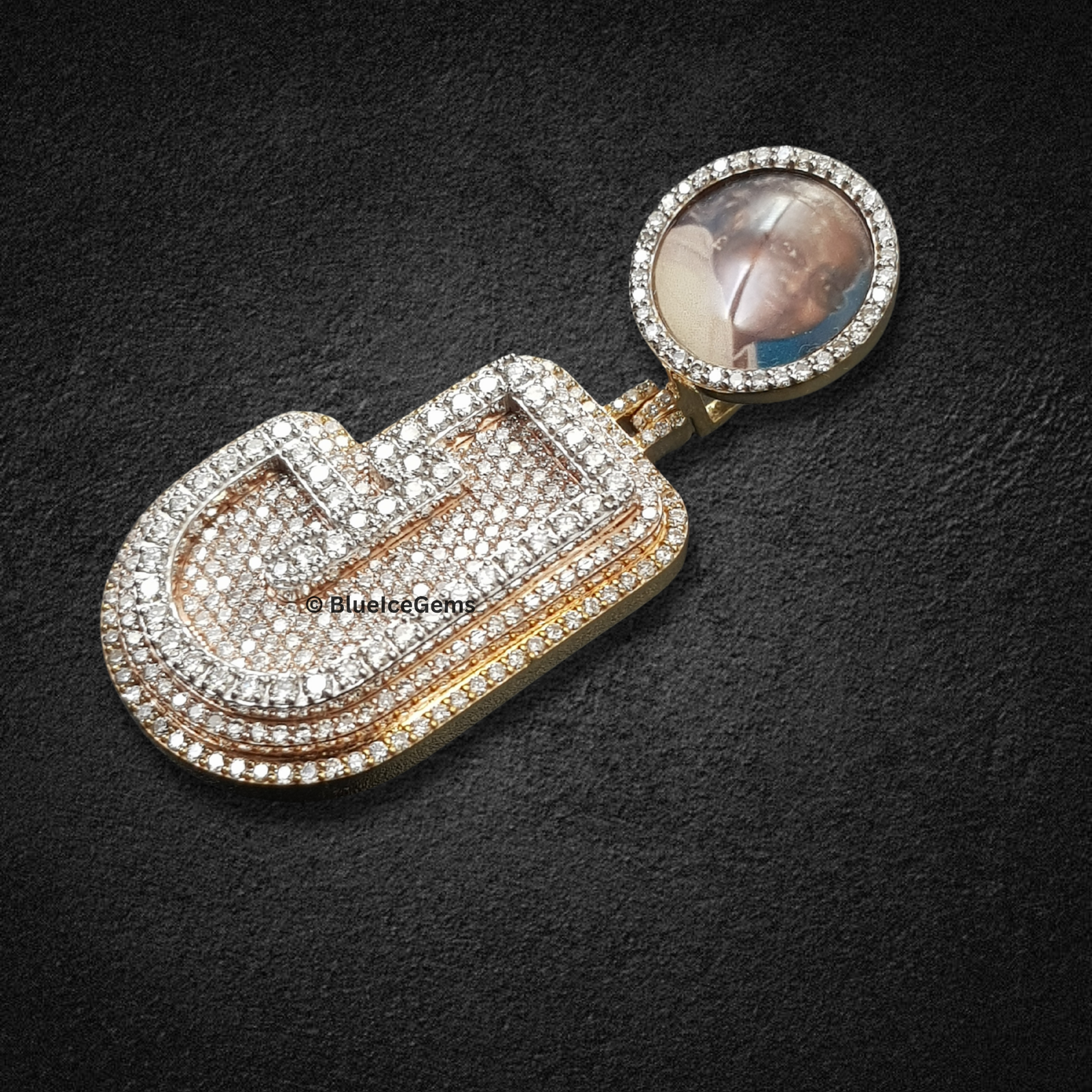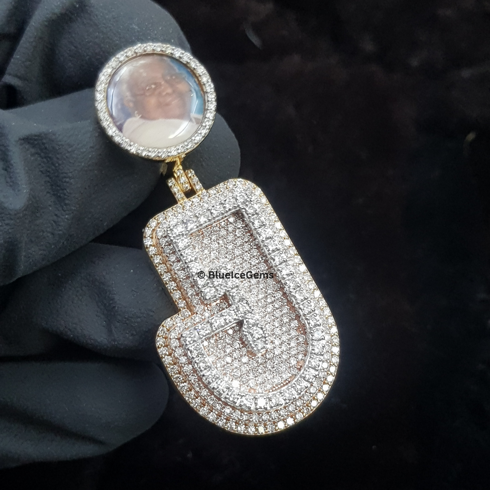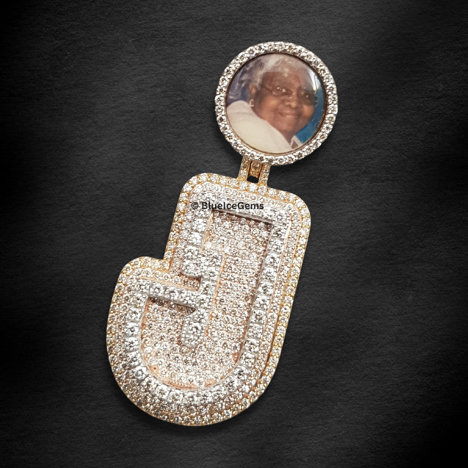 This majestic “J” initial pendant from BlueIceGems is a grand and opulent tribute, designed to honor cherished memories with dazzling brilliance. It’s lavishly pave-set with brilliant white diamonds, ensuring an unbroken surface of pure fire and unparalleled scintillation that radiates captivating light from every angle. The commanding form of the “J” is elegantly outlined in warm, luxurious yellow gold, providing a rich contrast that dramatically enhances the diamonds’ icy sparkle and adds to its opulent appeal. To further personalize this extraordinary piece, it’s elegantly crowned by a circular frame, also meticulously diamond-paved, designed to hold a cherished custom photo. This unique feature seamlessly blends deeply personal memory with breathtaking brilliance, transforming the pendant into a powerful and one-of-a-kind statement piece.