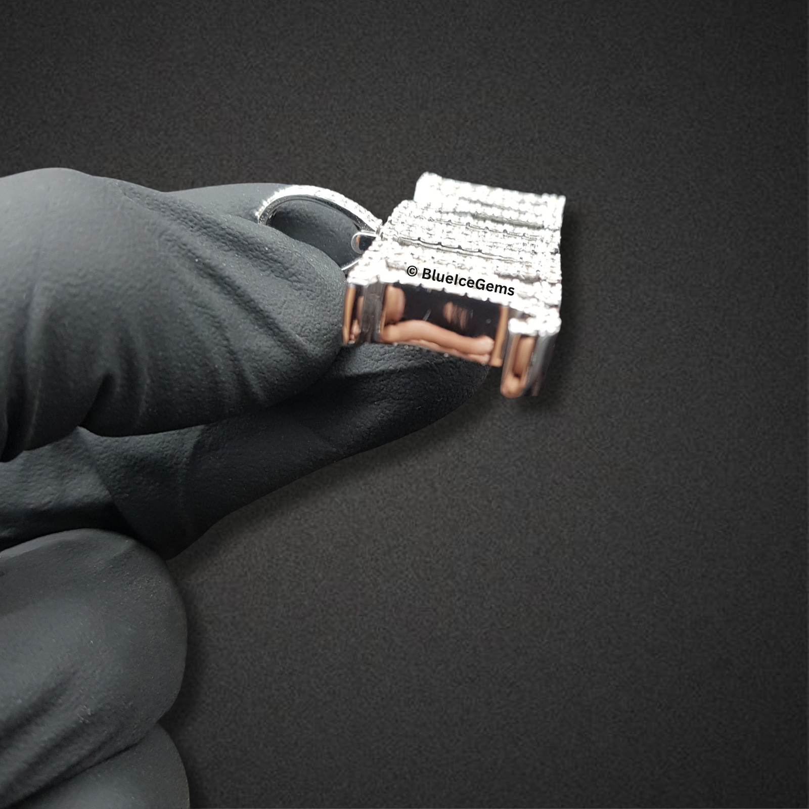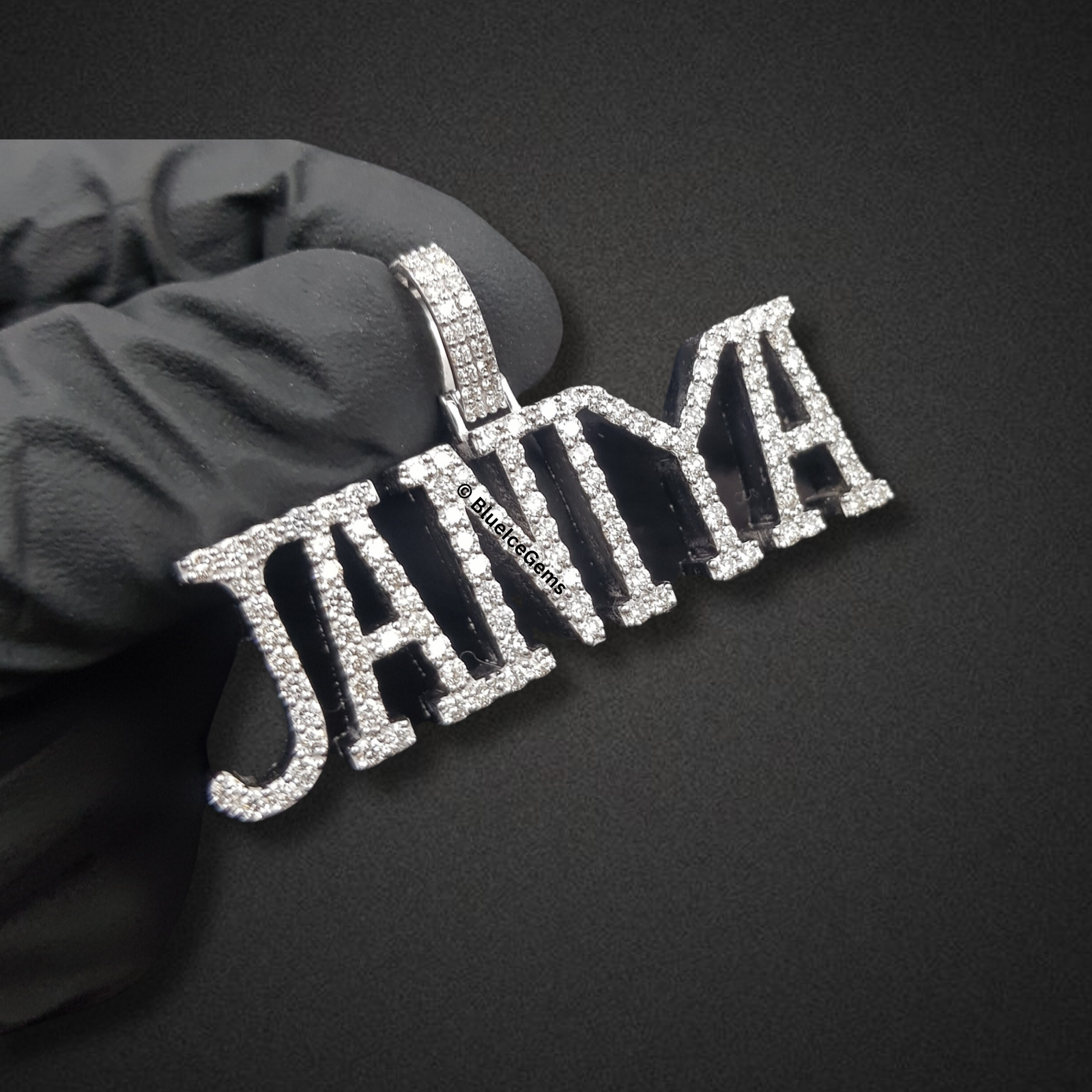 Celebrate a beloved name with The “JANIYA” Diamond Block Letter Pendant, a truly captivating piece that flawlessly combines personalized sentiment with radiant luxury. This impressive custom pendant elegantly spells out “JANIYA” in bold, impactful block letters, with every surface meticulously pave-set with an astonishing array of brilliant-cut white diamonds. The sheer density of these diamonds creates an unbroken field of pure fire and scintillation, ensuring it catches and reflects light with unparalleled brilliance from every angle. Crafted entirely in gleaming white gold, the robust three-dimensional design offers a powerful presence. The integrated, diamond-studded bail ensures a secure and prominent display on your chosen chain, allowing this exceptional piece to hang gracefully and beautifully express individuality.