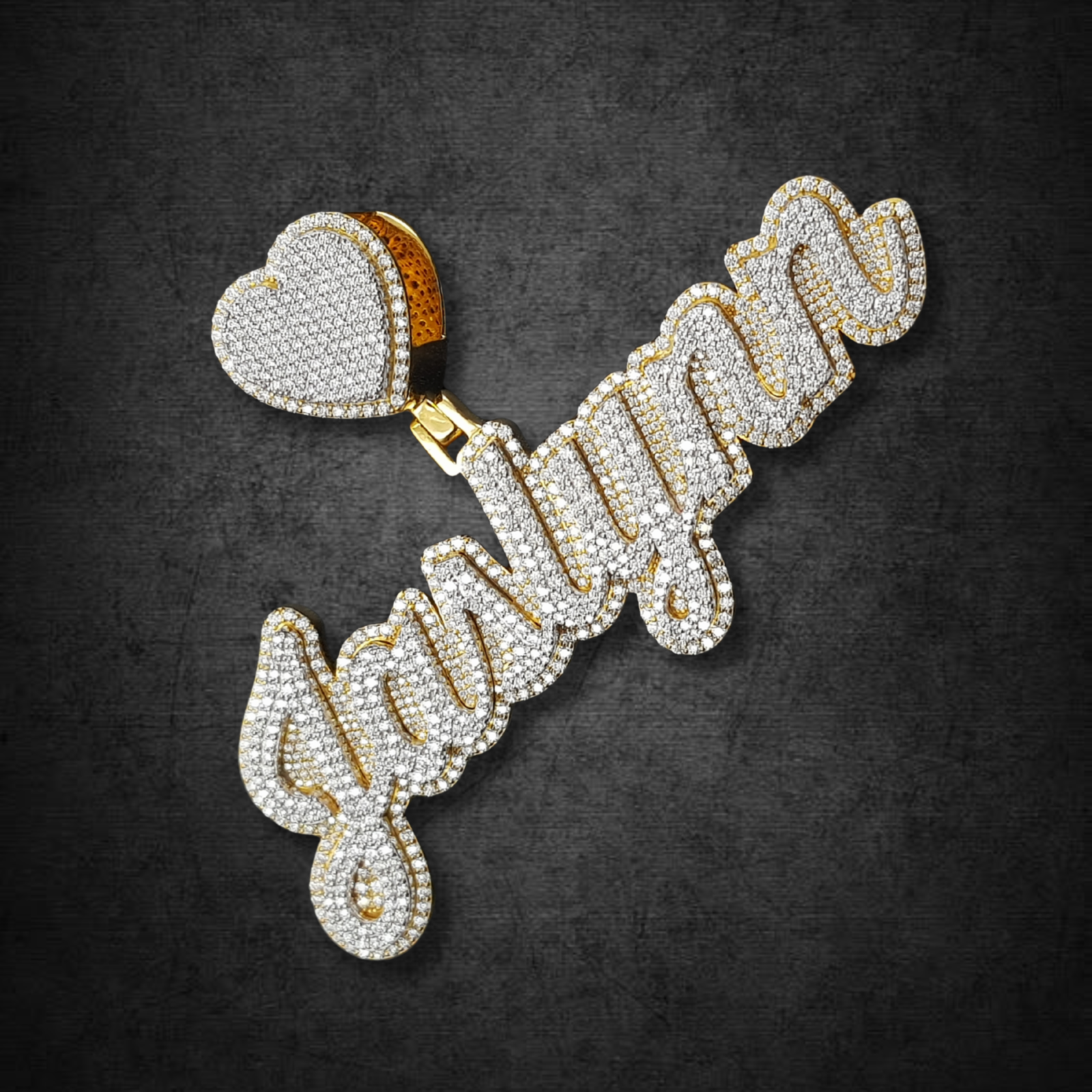 Celebrate a beloved name and express your heartfelt sentiment with The “Jaslynn” Heartfelt Diamond Script Pendant, a truly enchanting piece from BlueIceGems. This impressive custom pendant elegantly spells out “Jaslynn” in a graceful, flowing handwritten script font, embodying a unique touch of individuality and charm. Every delicate contour and flourish of the name is meticulously pave-set with an astonishing array of brilliant-cut white diamonds, creating an unbroken surface of pure fire and unparalleled scintillation. The incredible density of diamonds ensures it catches and reflects light with breathtaking brilliance from every angle, radiating pure sparkle. This isn’t just a pendant; it’s a timeless and luxurious tribute, designed to be worn close to the heart as a symbol of your most cherished connections.