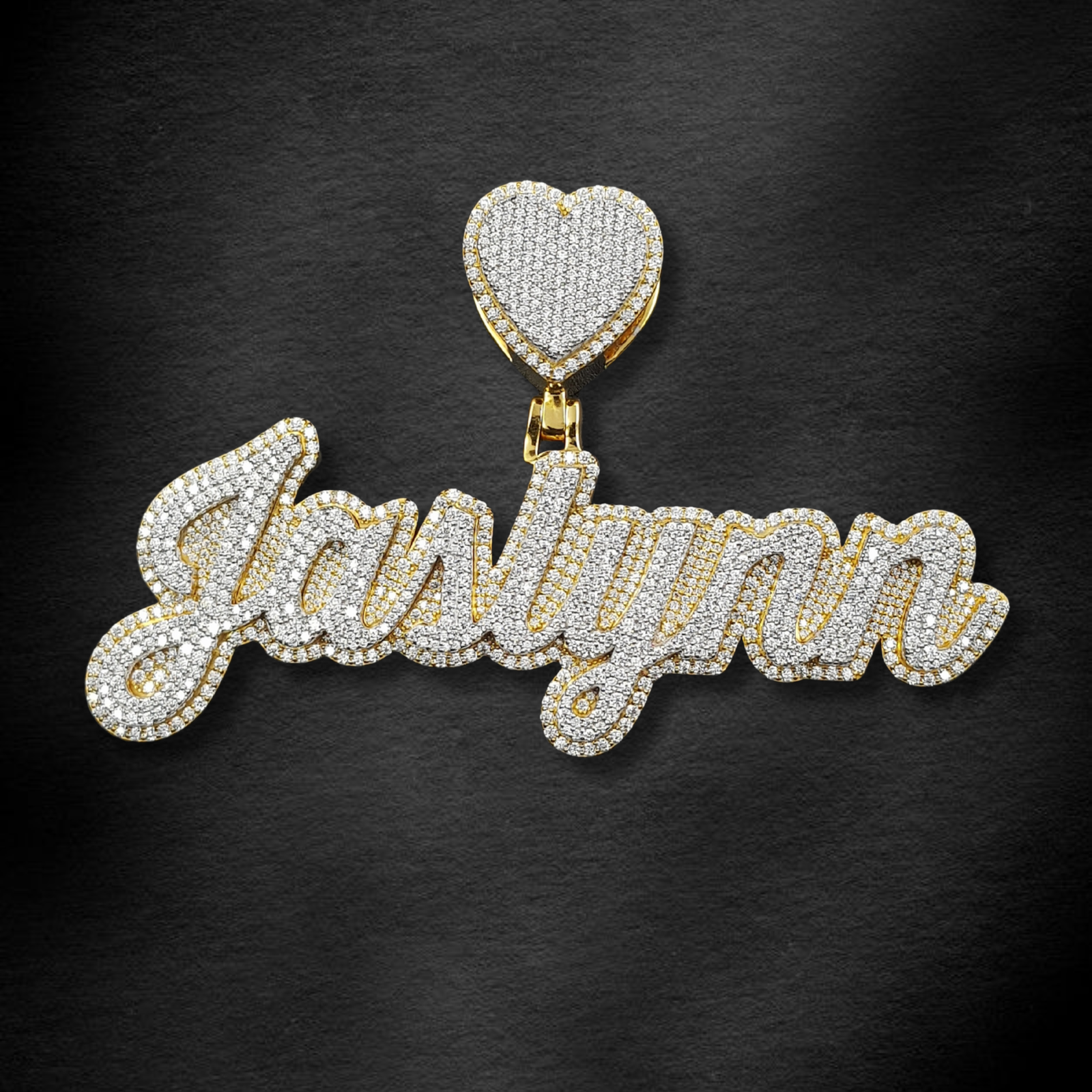 A dazzling “Jaslynn” name pendant, lavishly pave-set with brilliant white diamonds, framed in warm yellow gold, and crowned with a sparkling diamond heart.