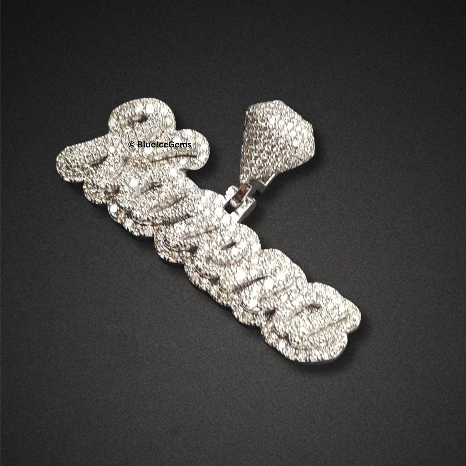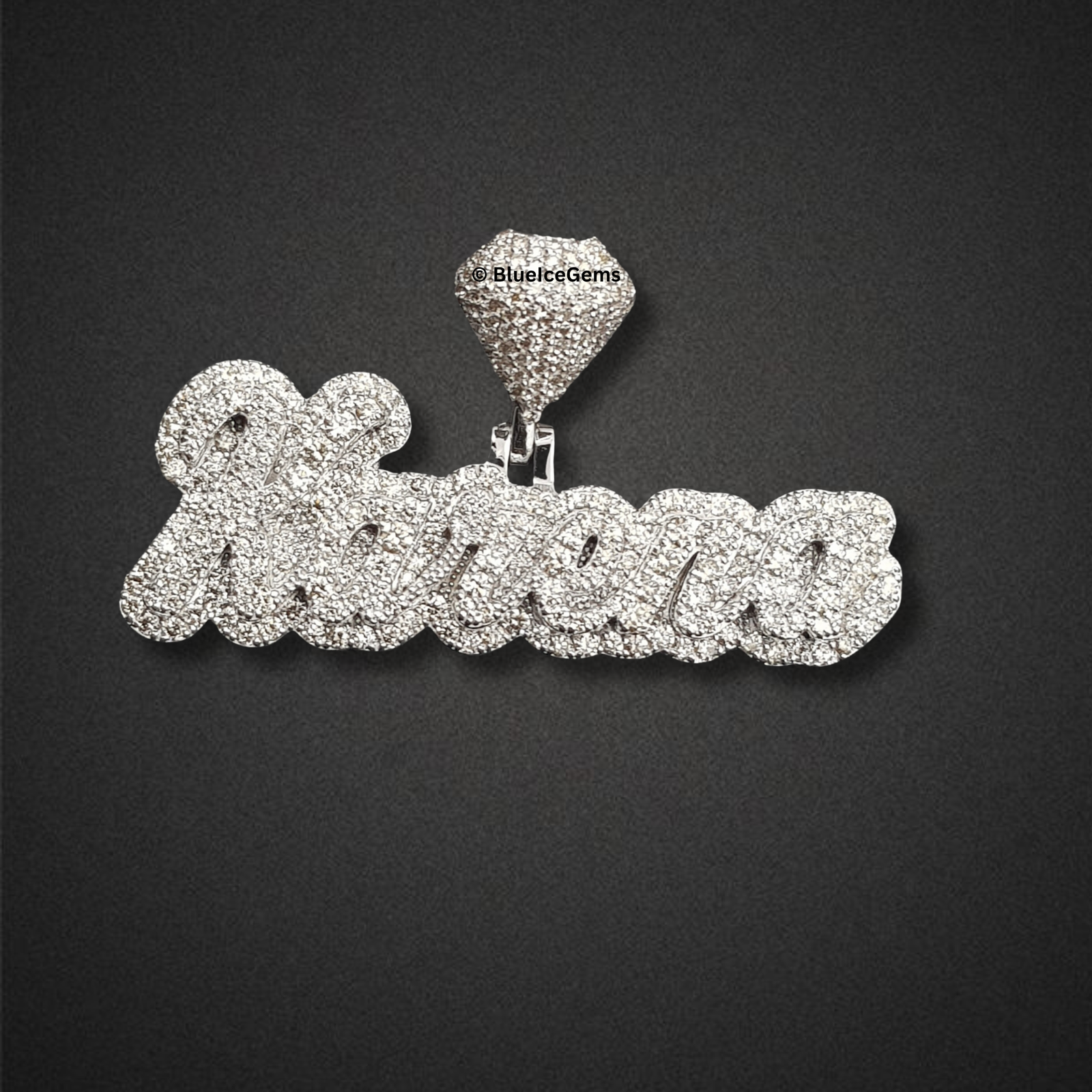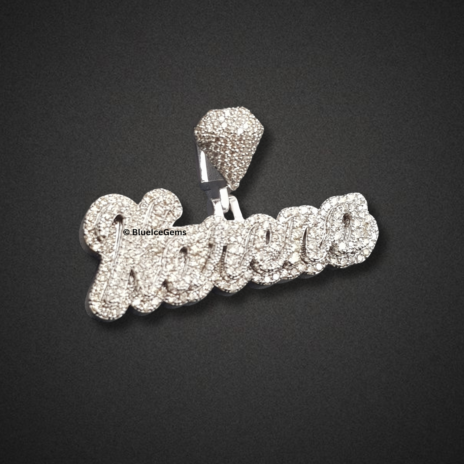 Celebrate a beloved name and personal elegance with this truly captivating “Karena” pendant, an exquisite creation from BlueIceGems. Elegantly crafted in a sophisticated flowing script, this pendant embodies grace and individuality. It is entirely and meticulously pave-set with dazzling, brilliant white diamonds, ensuring that every graceful curve shimmers with an unbroken surface of pure fire and unparalleled scintillation. The brilliance radiates from every angle, making a remarkable statement of sparkling luxury. This radiant piece is elegantly suspended from a brilliant diamond-paved cone-shaped bail, a unique design element that ensures a captivating and continuous flow of sparkle from top to bottom. This isn’t just a pendant; its radiant brilliance makes a timeless and personalized statement of luxury, designed to dazzle and become a treasured emblem of your distinctive identity and elegant taste.